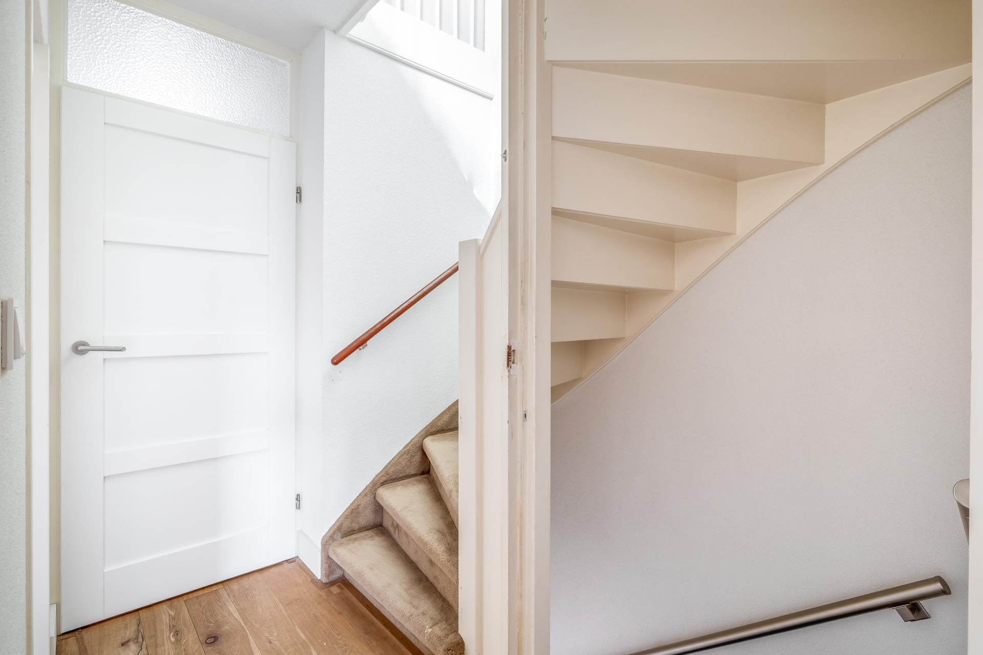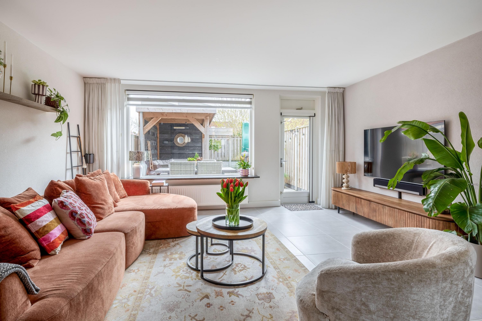Je komt binnen in de hal met toegang tot het toilet, de trapopgang en de woonkamer. Wat direct opvalt is de nette afwerking en het gevoel van ruimte. De woonkamer is tuingericht en heerlijk licht dankzij de grote raampartijen.