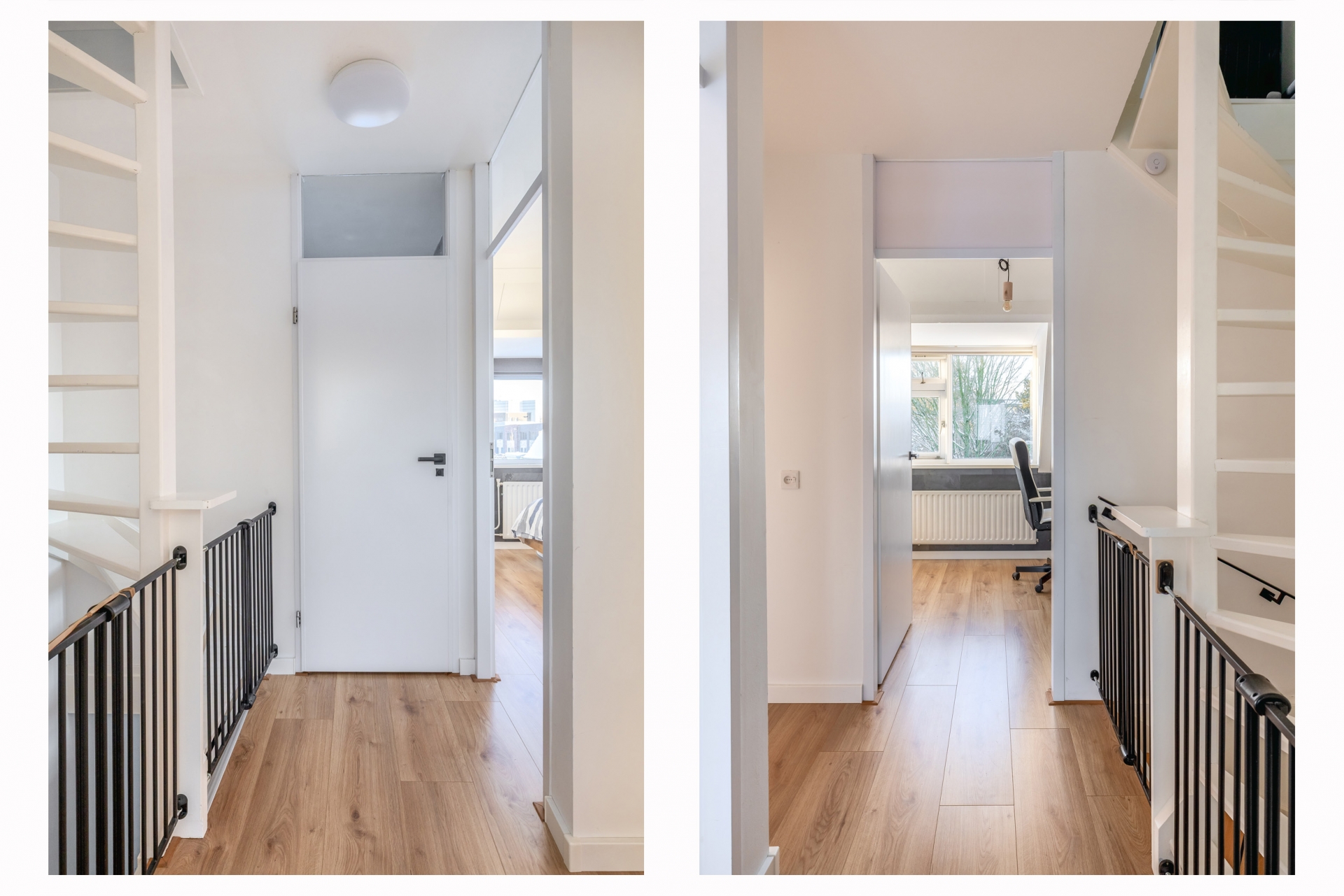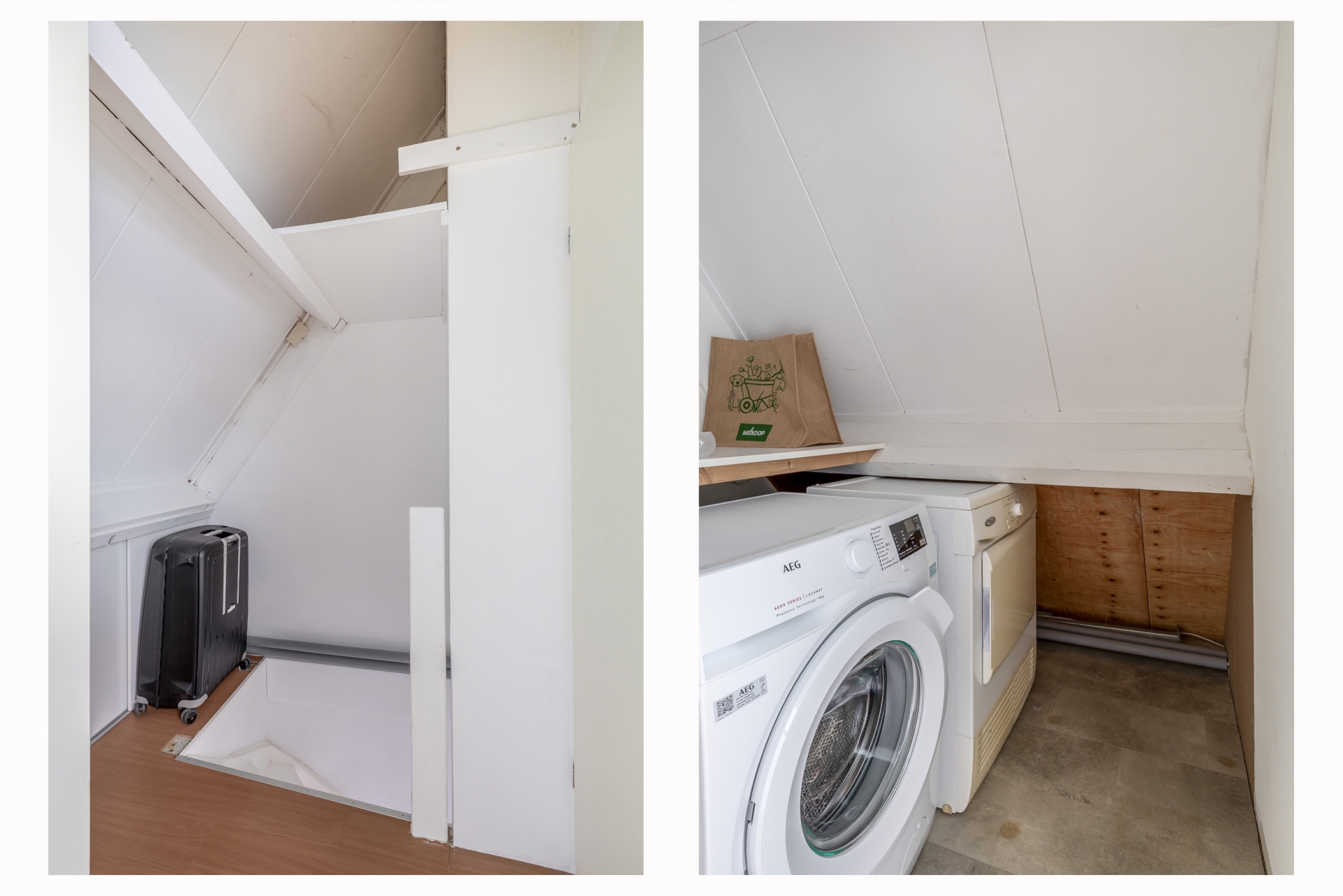 Overloop met toegang tot de vierde slaapkamer en de technische ruimte met wasmachineaansluiting. Achter de knieschotten is extra bergruimte gerealiseerd.