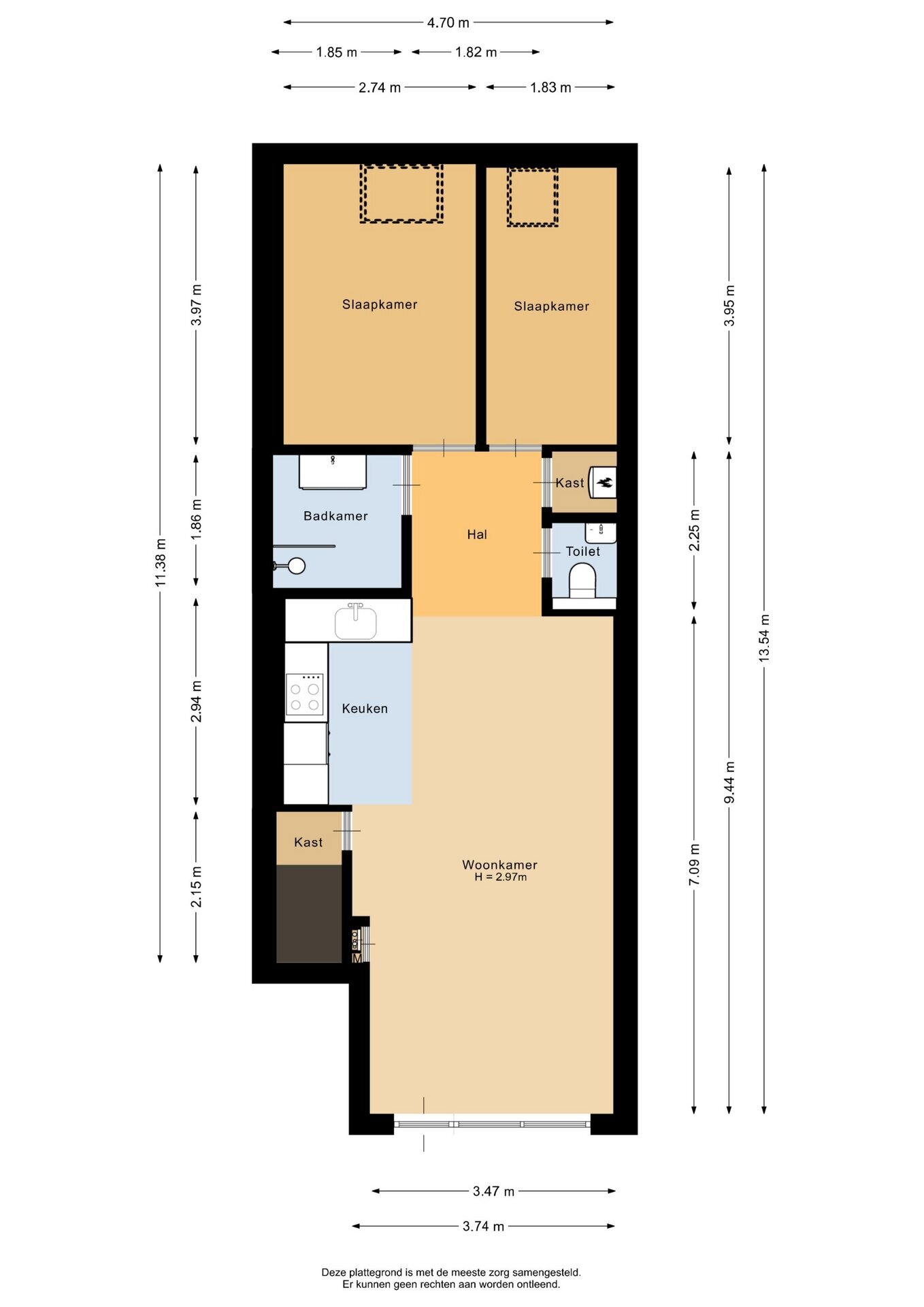 “Deze informatie is door ons met de nodige zorgvuldigheid samengesteld. Onzerzijds wordt echter geen enkele aansprakelijkheid aanvaard voor enige onvolledigheid, onjuistheid of anderszins, dan wel de gevolgen daarvan. Alle opgegeven maten en oppervlakten zijn indicatief.”