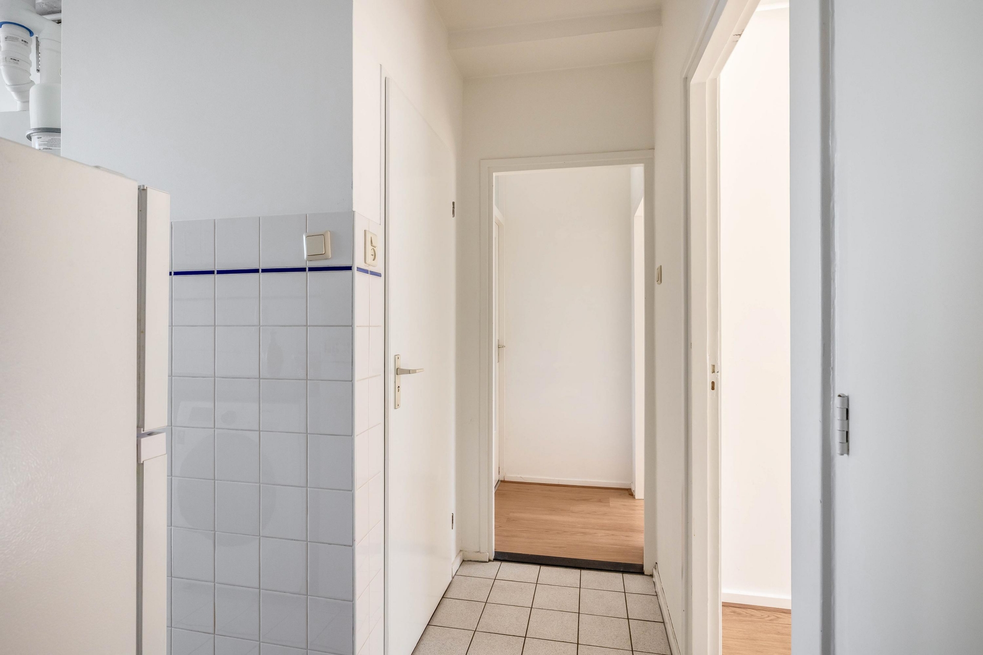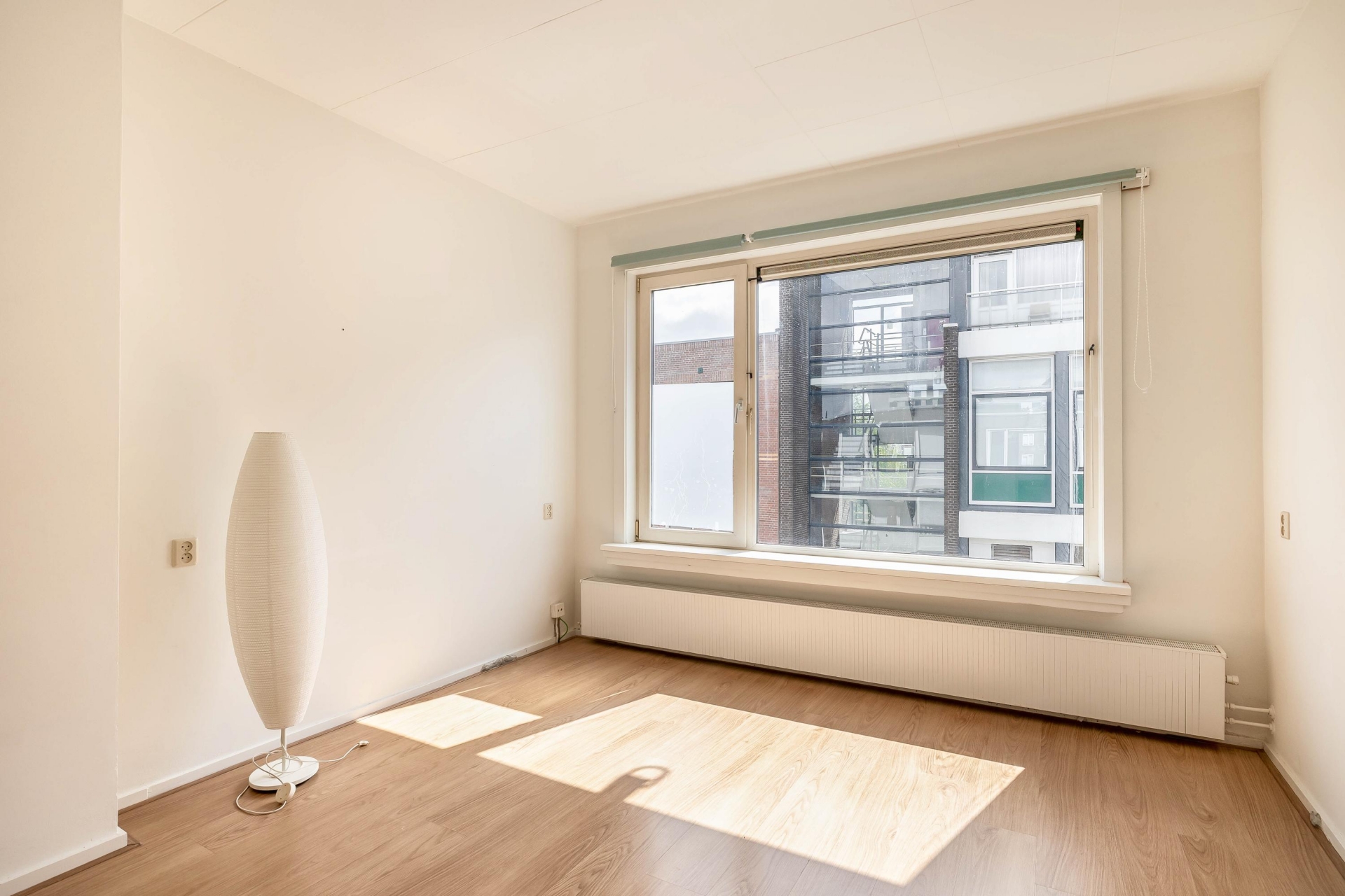 De woonkamer is licht en overzichtelijk met een grote raampartij. Hier kijk je vrij uit over de straat. Door de ligging op het oosten geniet je in de ochtend van de zon in je woonkamer – een heerlijke plek om de dag rustig op te starten. De lichte laminaatvloer en lichte wanden zorgen voor een neutrale basis die je makkelijk naar eigen smaak kunt aankleden.