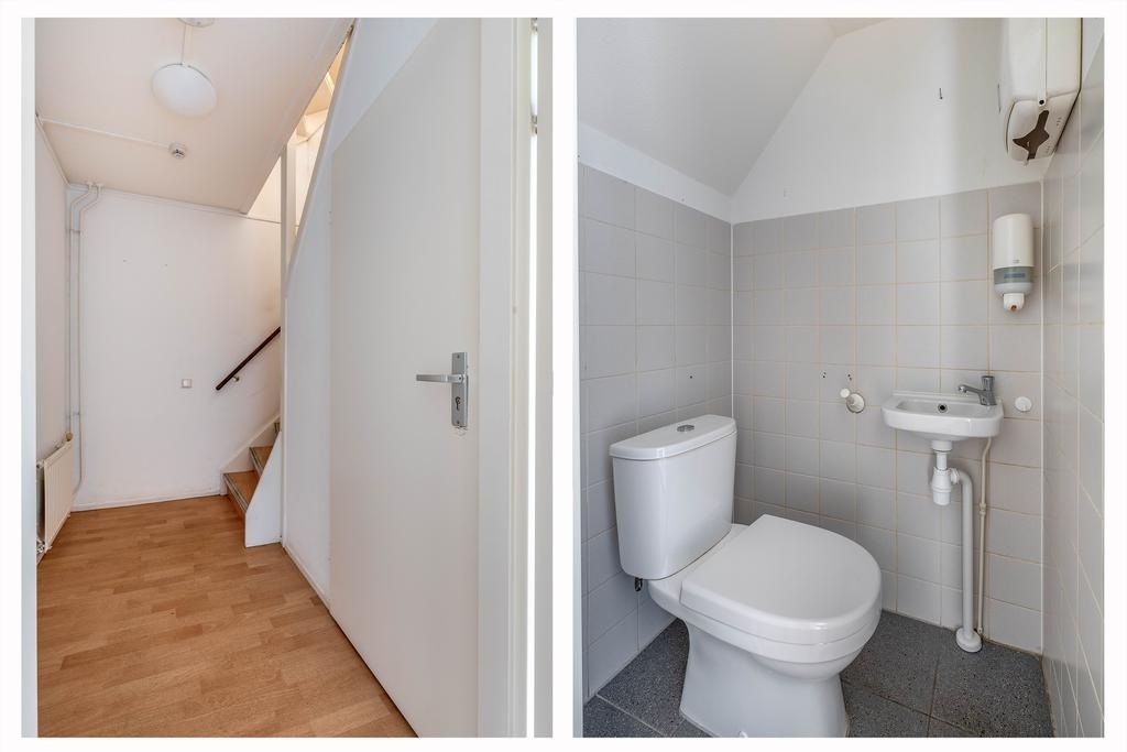 In de tussenhal, tussen woonkamer en keuken, bevindt zich het keurige toilet met fonteintje en de trapopgang naar boven.