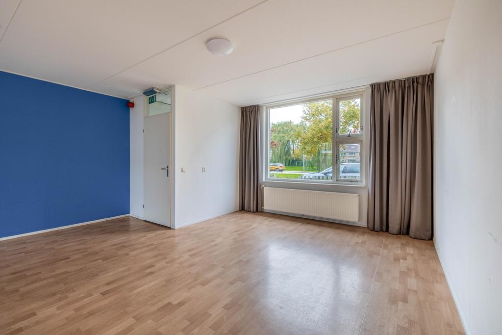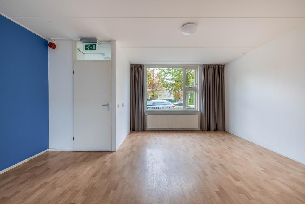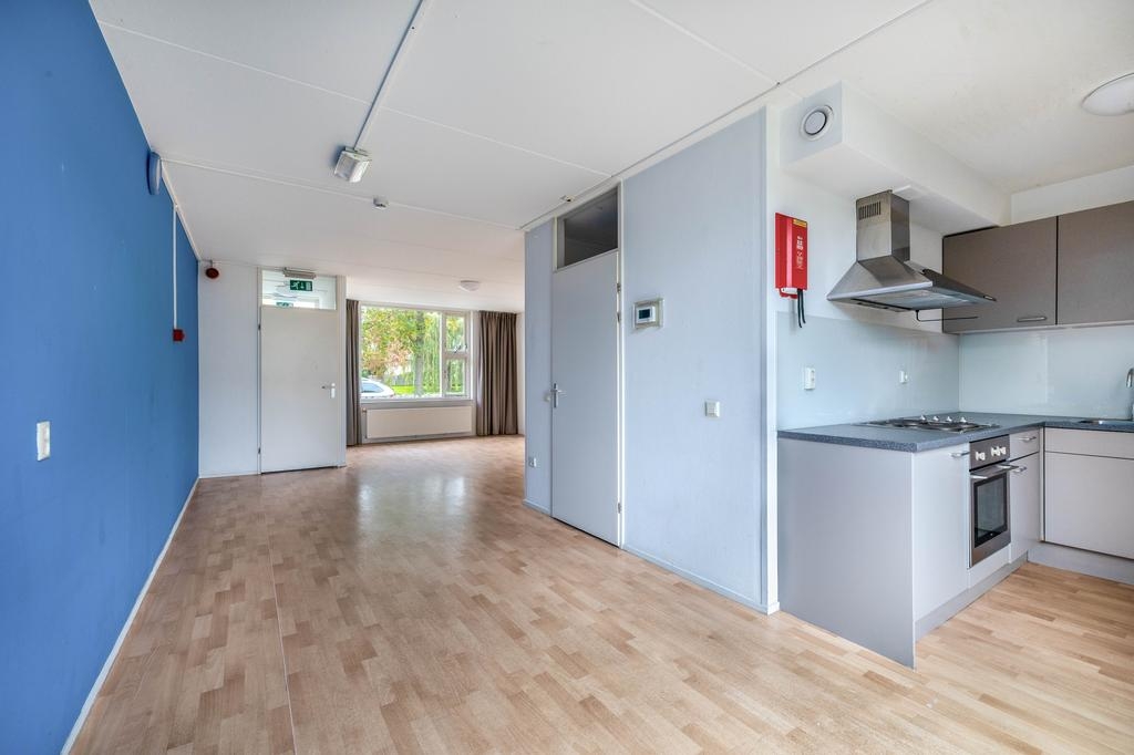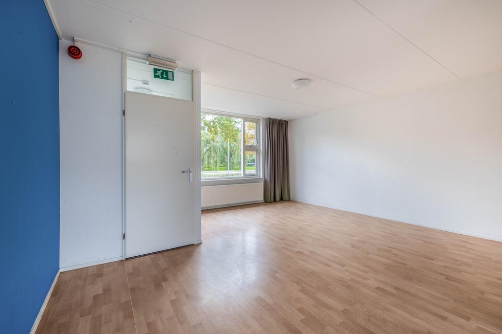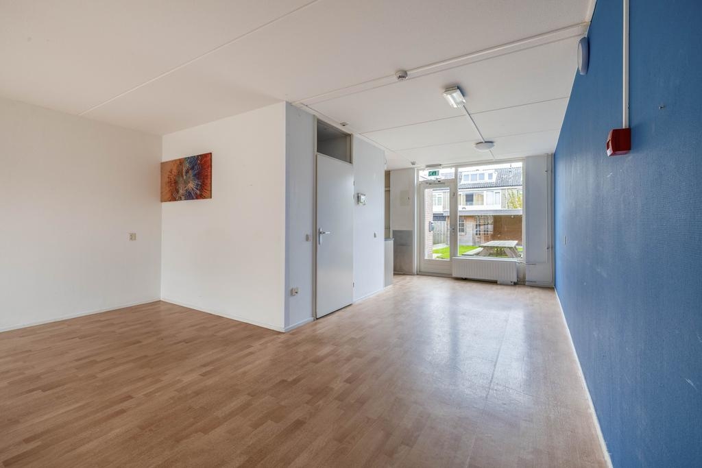 Via de entree kom je binnen in de hal met meterkast, waarna je doorloopt naar de royale woonkamer. Aan de voorzijde is het zitgedeelte met prettig vrij uitzicht, en aan de achterzijde vind je het eetgedeelte met directe toegang tot de tuin. De grote ramen zorgen voor veel natuurlijk licht, en de neutrale afwerking maakt het een fijne basis voor verschillende interieurstijlen.