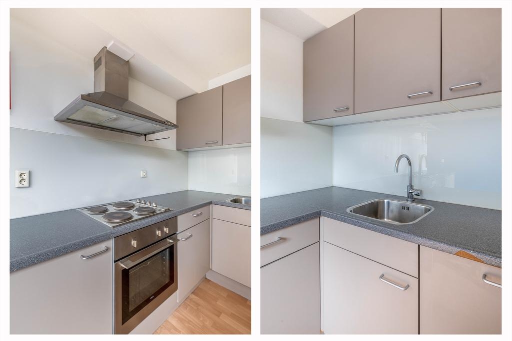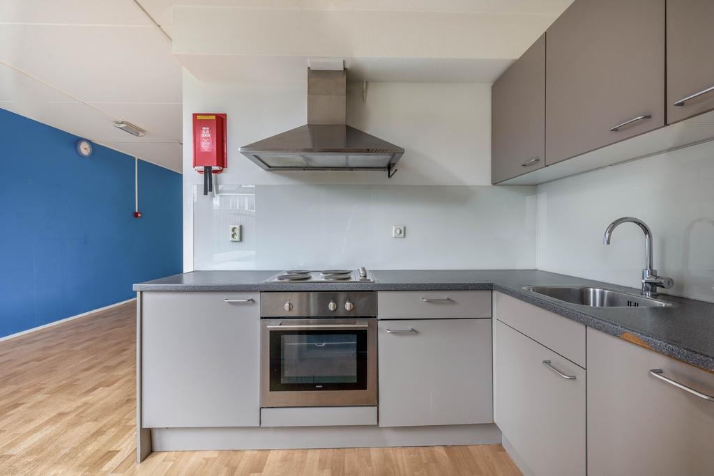De halfopen keuken in hoekopstelling is uitgerust met een kookplaat, afzuigkap, oven en spoelbak. Vanuit de keuken loop je door naar de aangebouwde berging, die ook via de tuin toegankelijk is – ideaal voor het stallen van fietsen of als extra opslagruimte.