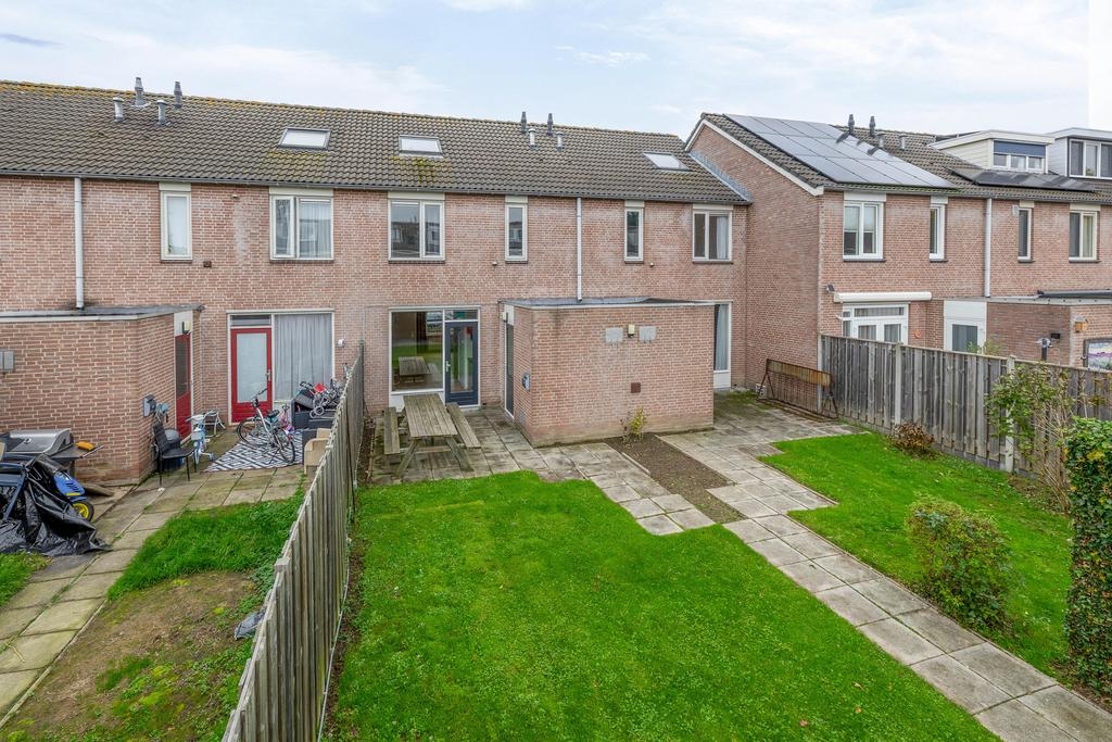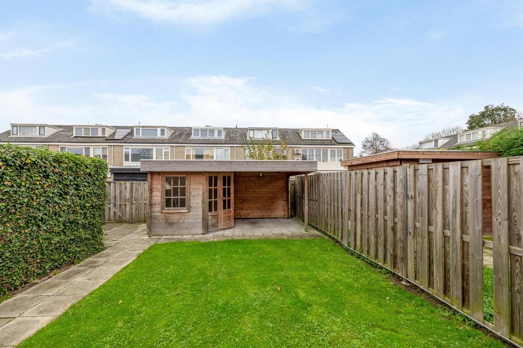 De achtertuin is met zijn 17 meter diepte echt een verlengstuk van het huis. De tuin is keurig aangelegd met een combinatie van gazon en bestrating. Achterin de tuin staat een houten schuur met een sfeervolle overkapping – een heerlijke plek om te ontspannen, barbecueën of te loungen op warme dagen. Dankzij de ligging op het zuidoosten profiteer je hier van ochtend- tot laat in de middagzon.