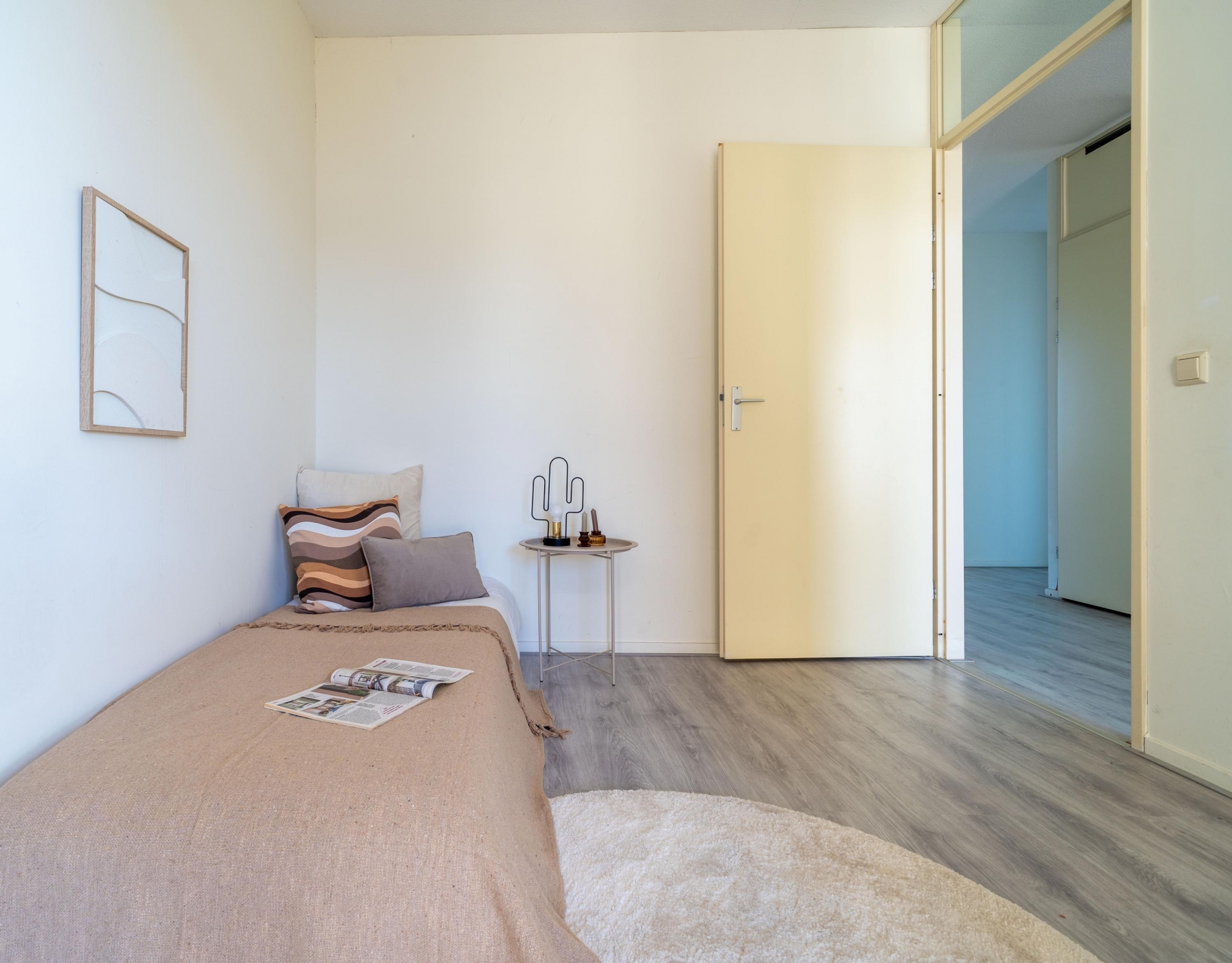 De slaapkamers hebben een oppervlakte van 9 en 17 m² en beschikken over een laminaatvloer. Door het hele appartement, met uitzondering van de natte ruimtes, is de laminaatvloer doorgelegd. De inpandige badkamer is volledig betegeld en voorzien van een ligbad, douche en wastafel. De inpandige berging biedt ruimte voor een wasmachine en droger.