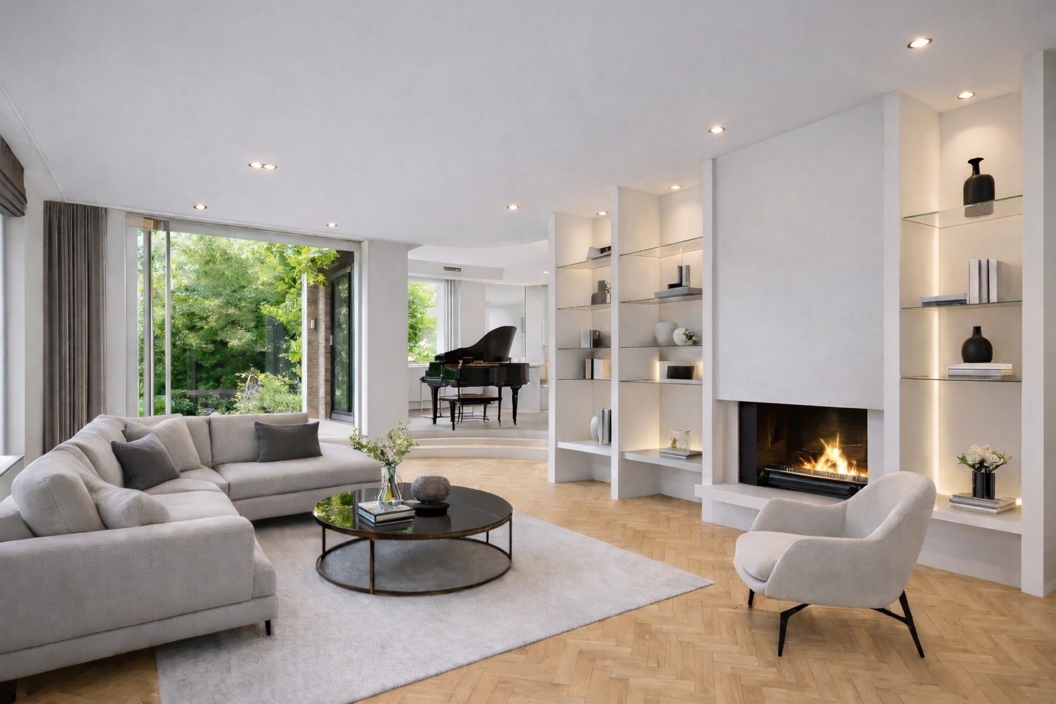 De begane grond verrast direct met een grote, lichte living die op een speelse manier overgaat in een eetgedeelte en aansluit op de keuken. Dankzij het split-level element in de woonkamer ontstaat er een gezellige dynamiek in de ruimte. De living heeft grote raampartijen, zicht op de tuin en een open haard als sfeervol middelpunt.