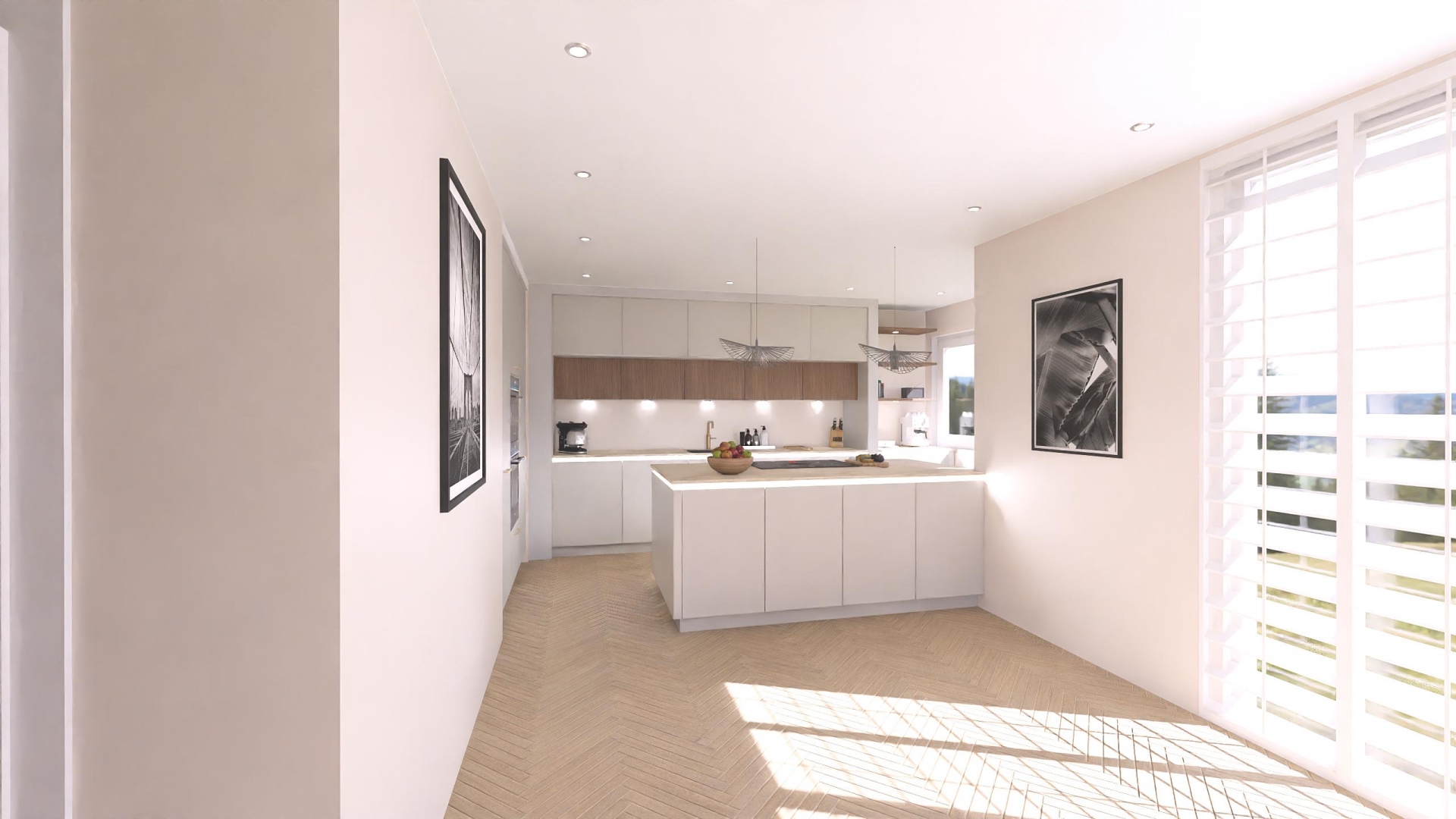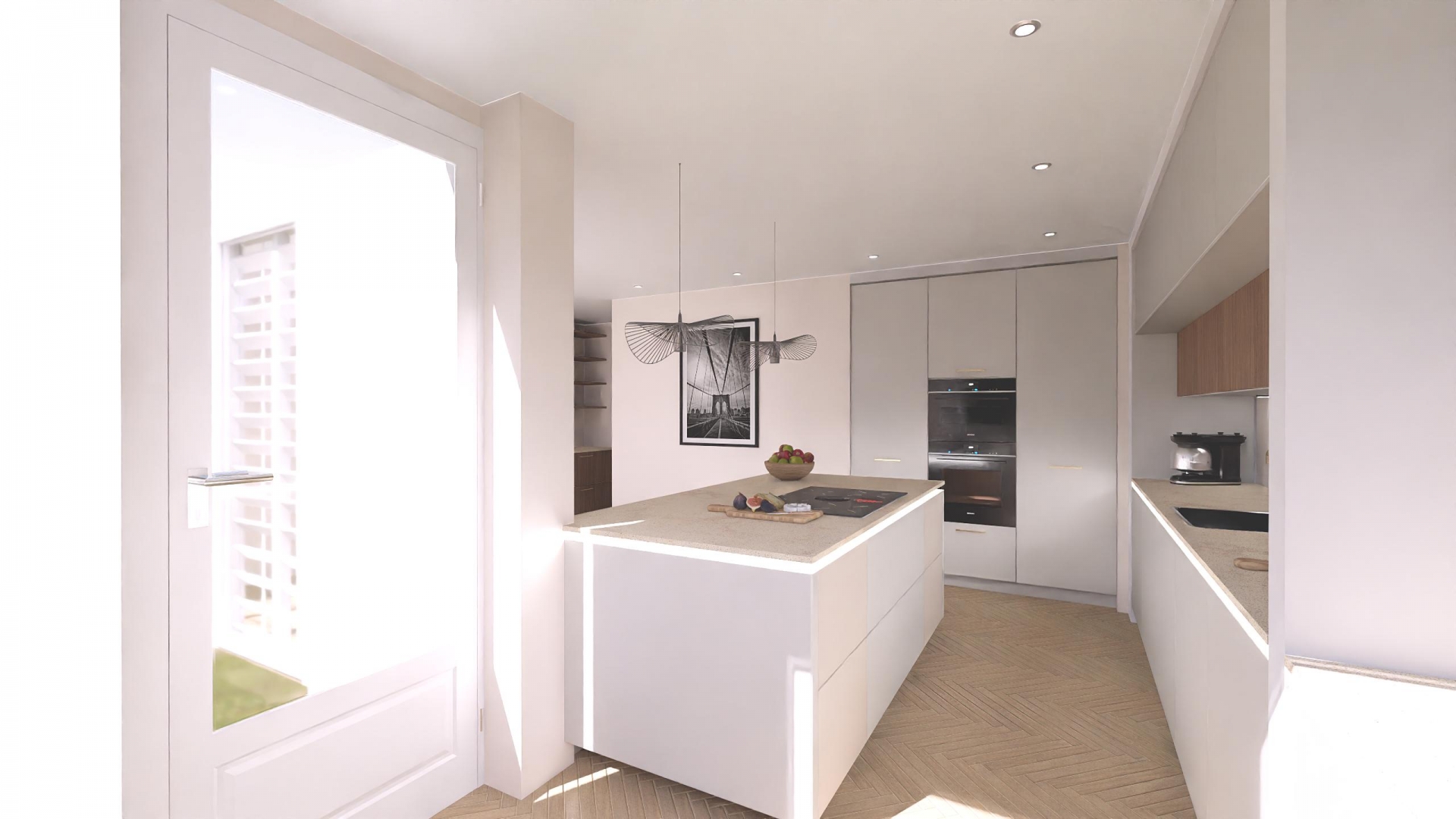 De keuken is royaal en biedt voldoende werkruimte, opbergruimte en potentie voor een luxe woonkeuken. Aansluitend vind je de praktische bijkeuken.