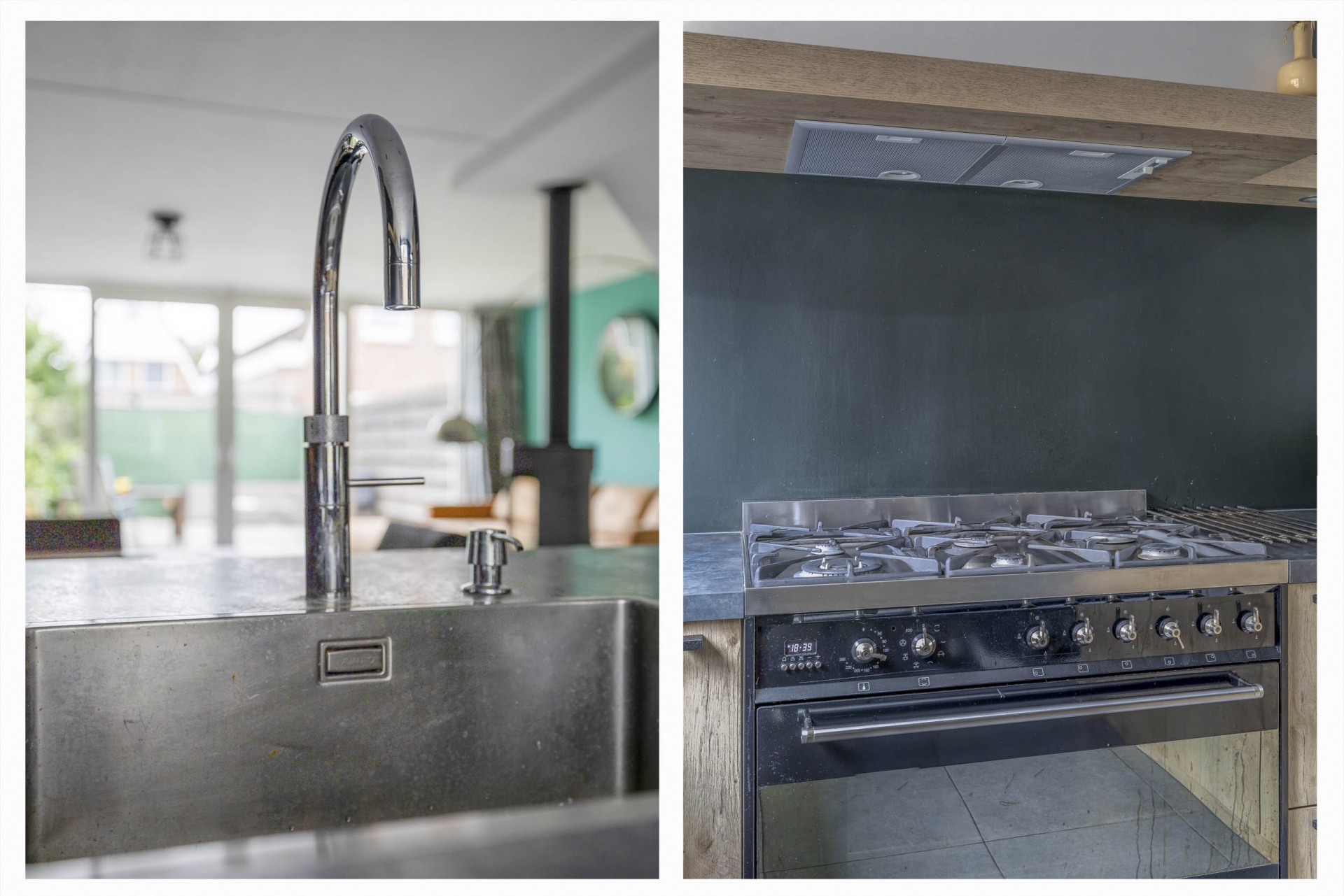 In deze keuken is plaats voor een spoelbak met Quooker (d.d. 2025), een Smeg gasfornuis met oven en afzuigkap, combi oven, vaatwasser en koel- vriescombinatie.