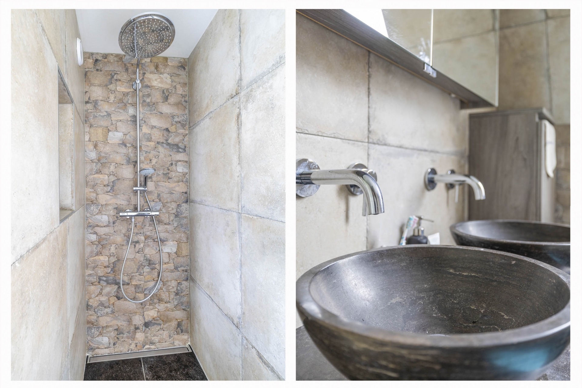 In deze luxe badkamer bevinden zich een ruime inloopdouche met regendouche, een dubbel wastafelmeubel met waskommen, een wand closet en ligbad.