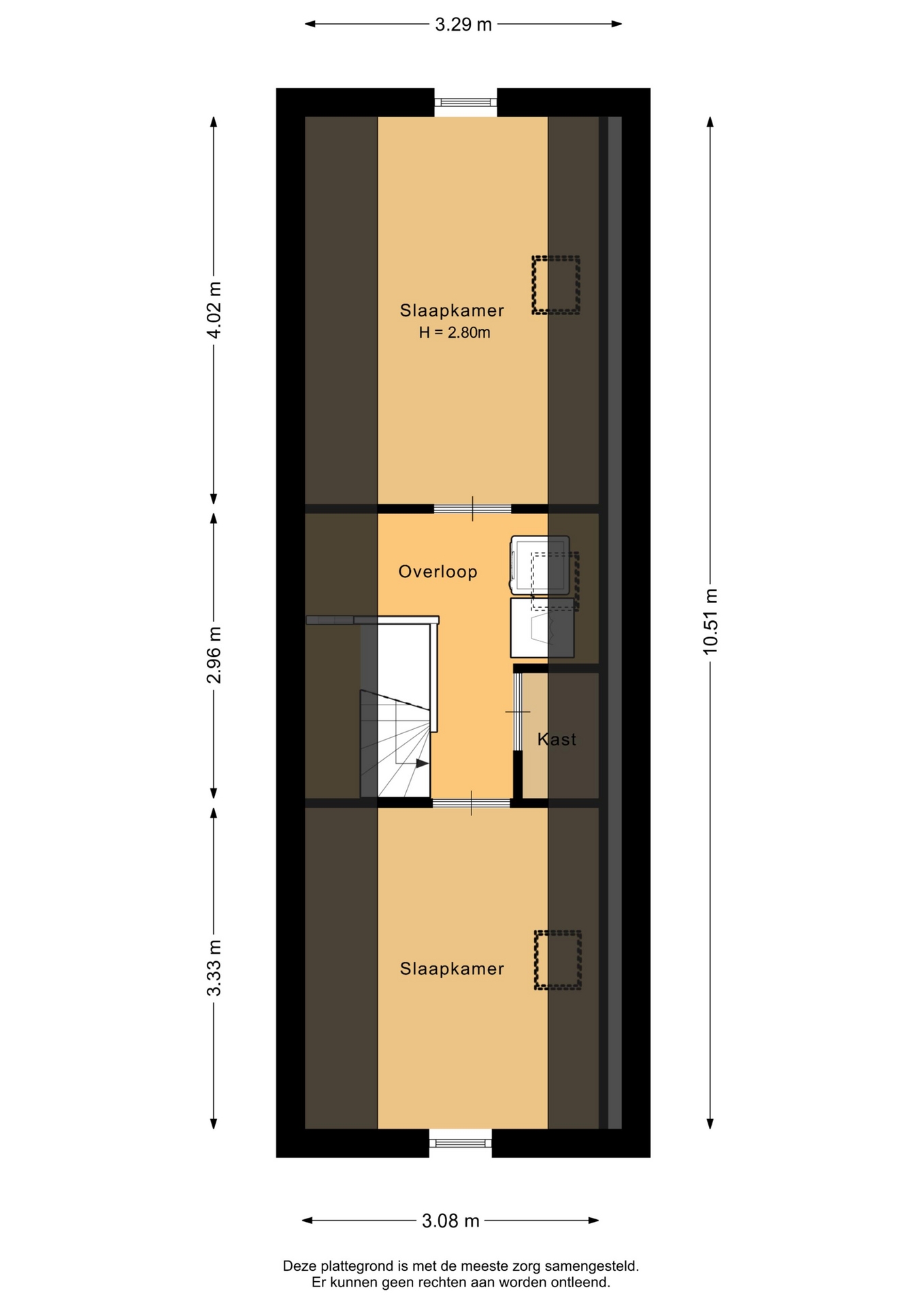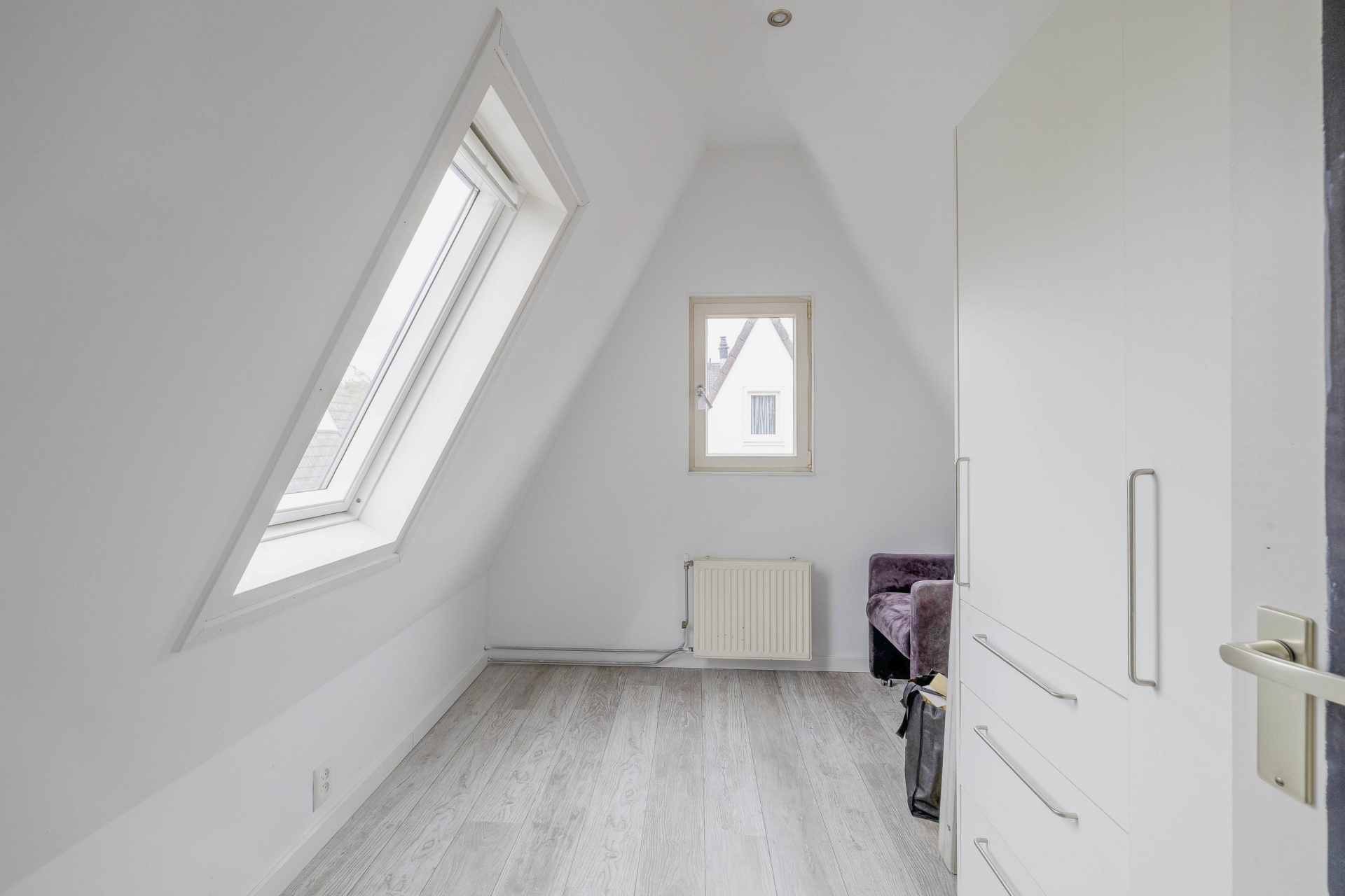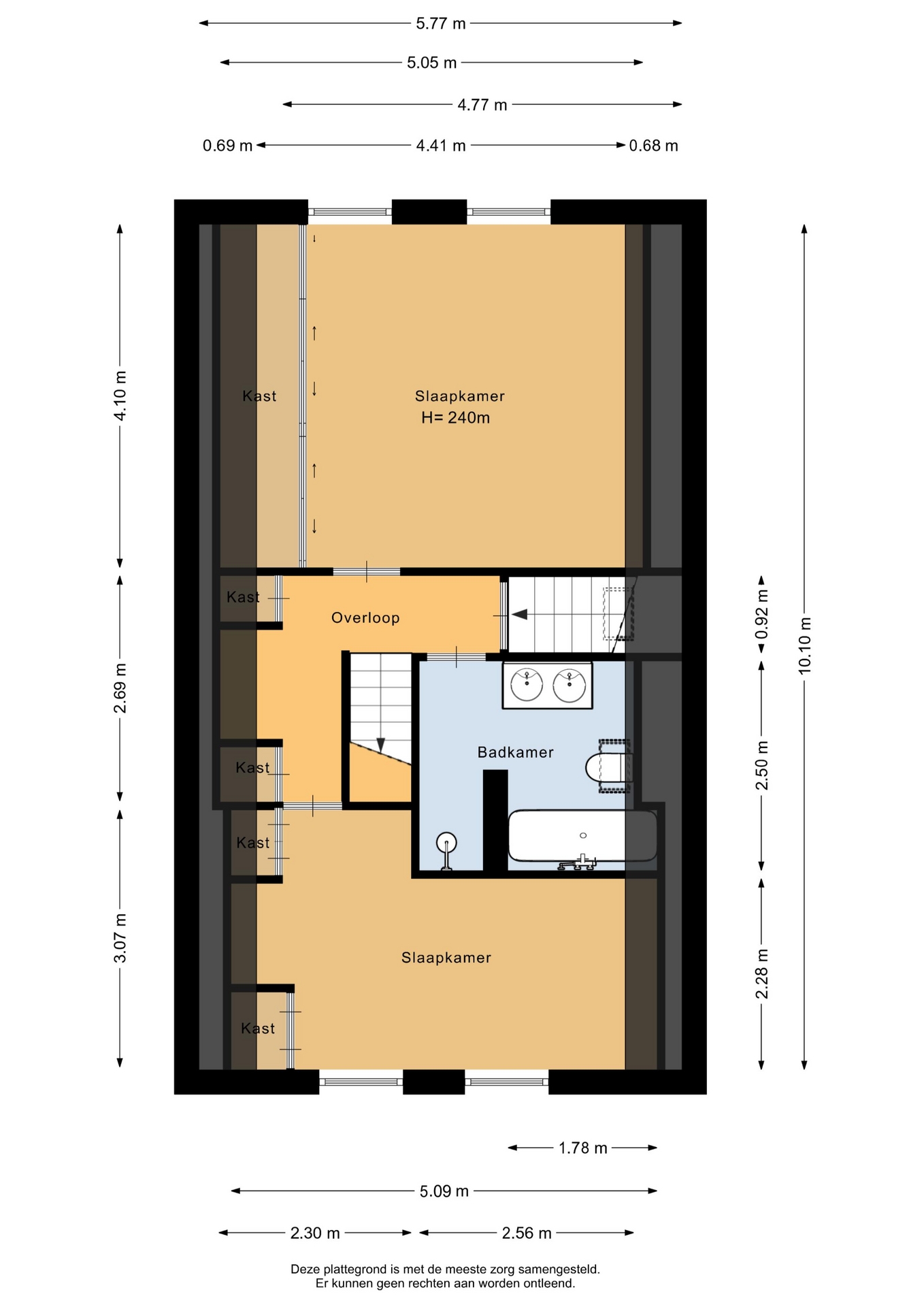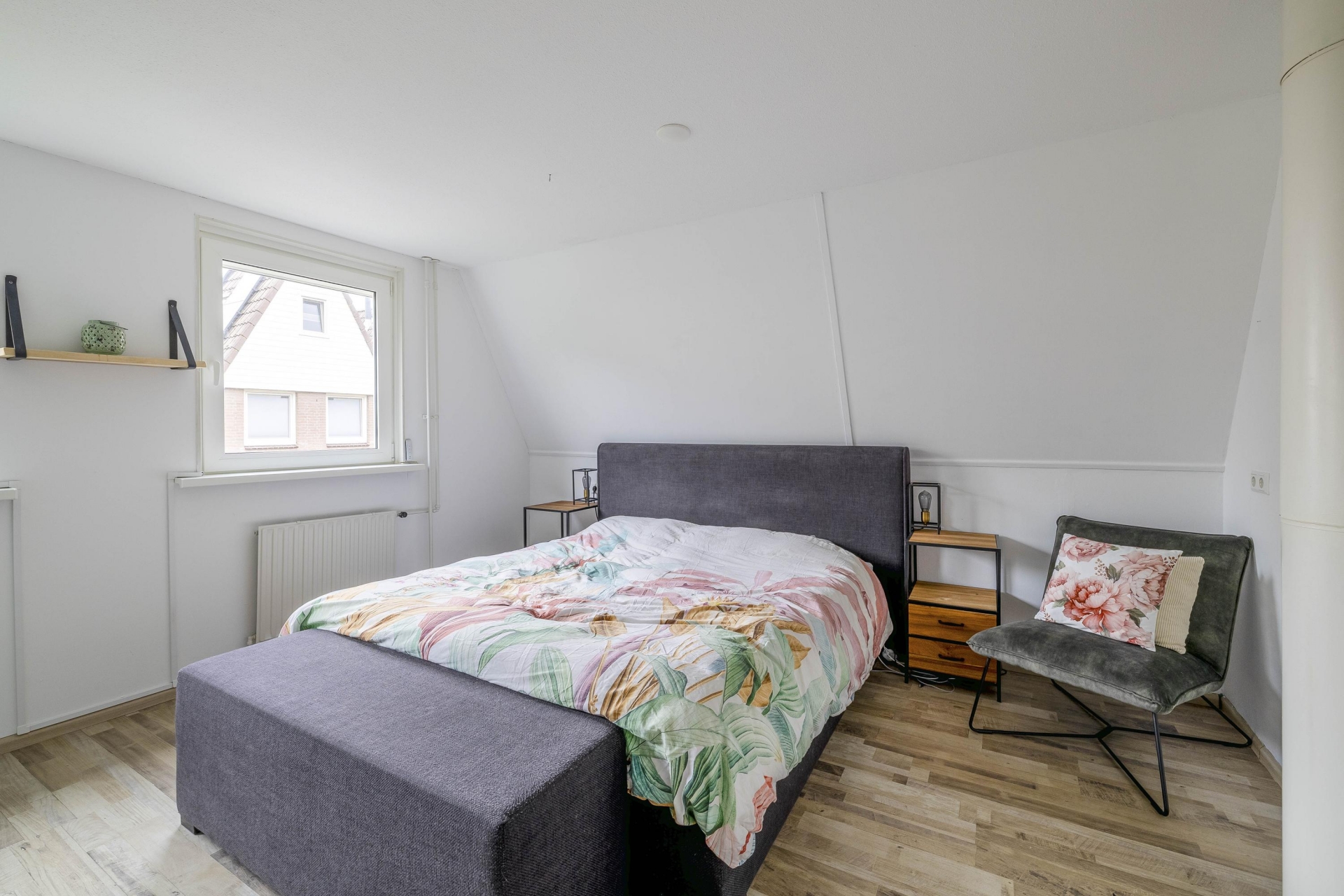 De kamer aan de voorzijde (met vaste kastenwand) meet ca. 10m² en die aan de achterzijde 12m².