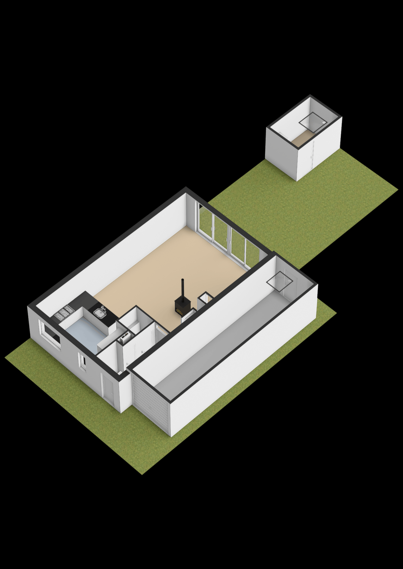 In de zijtuin is plaats gemaakt voor een aangebouwde houten garage (24m²), voorzien van een elektrische garagedeur, lichtkoepel en deur naar achtertuin.