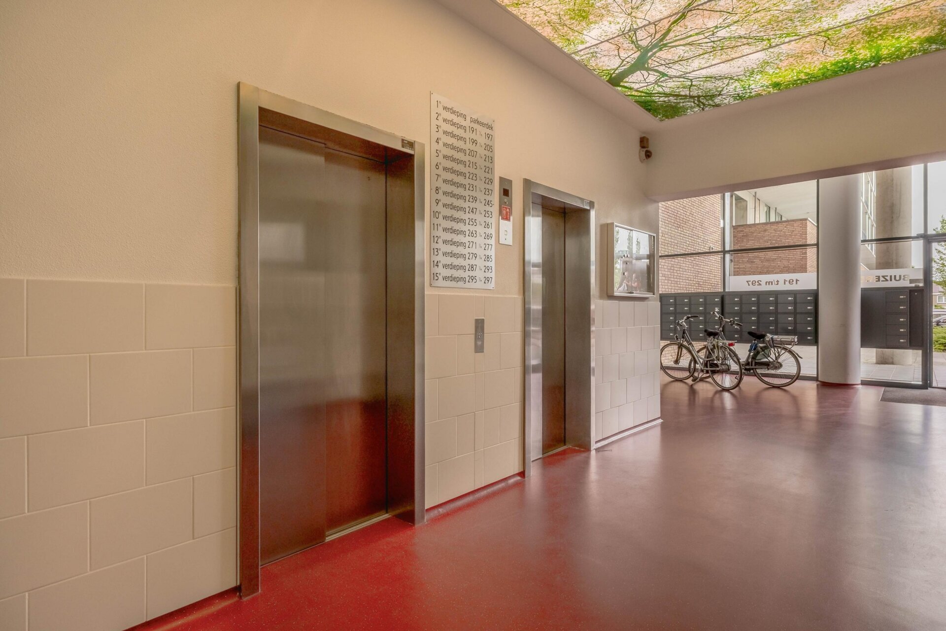 Via de afgesloten entree met videofooninstallatie en brievenbussen kom je in de centrale hal met toegang tot de liften, het trappenhuis, de gezamenlijke fietsenberging en de containerruimte. Met de lift bereik je zowel het parkeerdek op de 1e verdieping als het appartement op de 14e verdieping.
