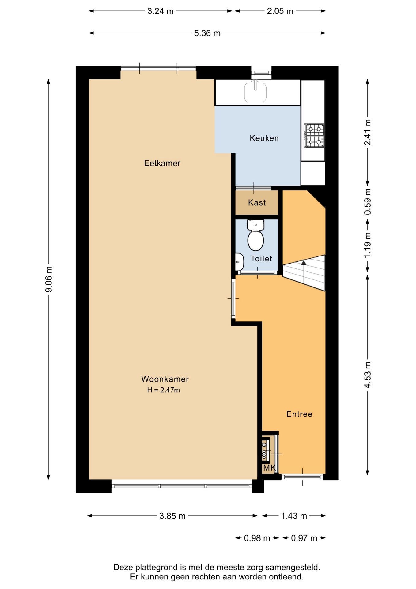 “Deze informatie is door ons met de nodige zorgvuldigheid samengesteld. Onzerzijds wordt echter geen enkele aansprakelijkheid aanvaard voor enige onvolledigheid, onjuistheid of anderszins, dan wel de gevolgen daarvan. Alle opgegeven maten en oppervlakten zijn indicatief.”