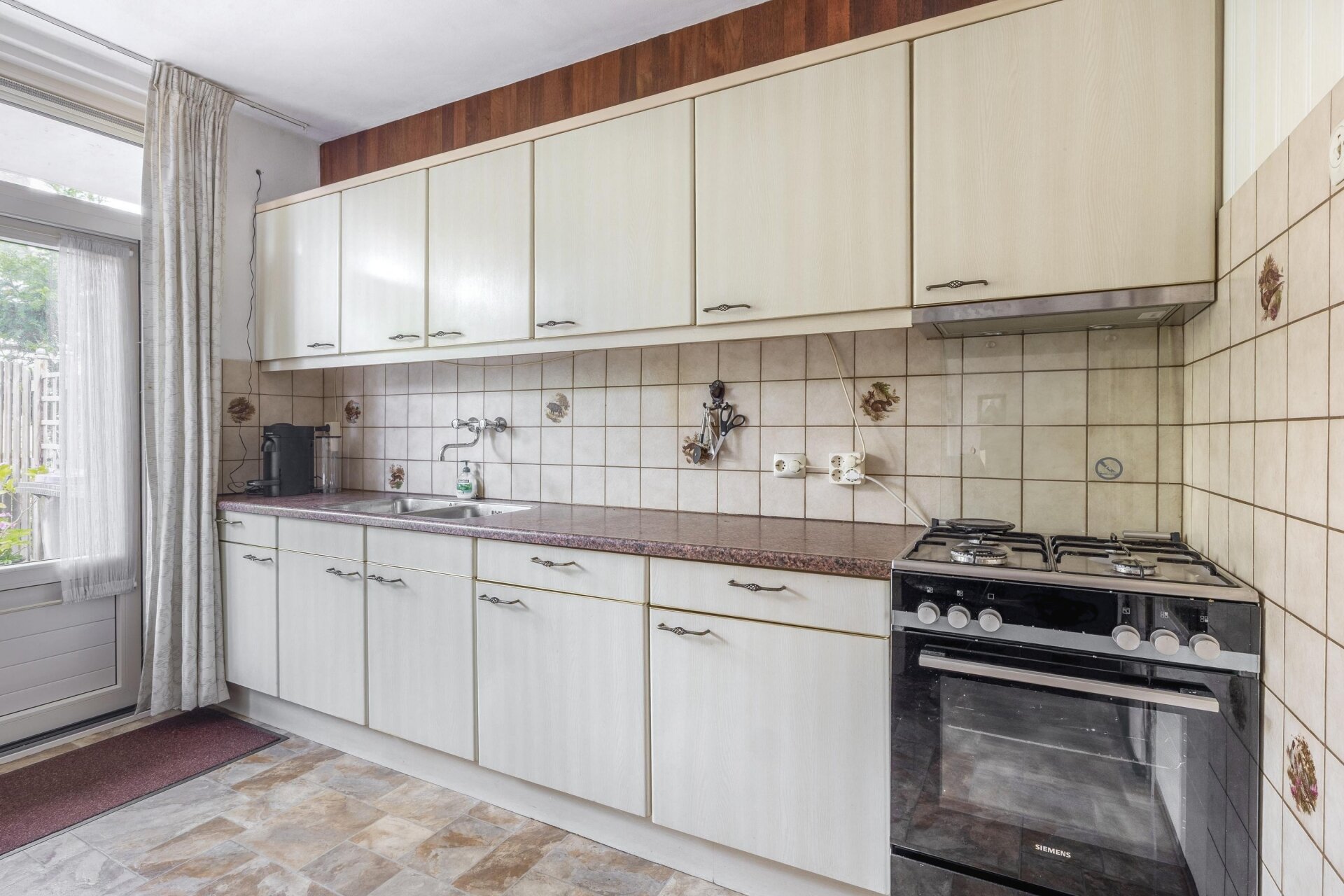 De keuken is geplaatst aan de achterzijde van de woning en kijkt uit op de tuin. Deze is netjes onderhouden en biedt alle ruimte voor de dagelijkse kookbehoeften. Vanuit de keuken heb je direct toegang tot het terras, handig als je buiten wilt eten of even snel iets uit de berging moet pakken.