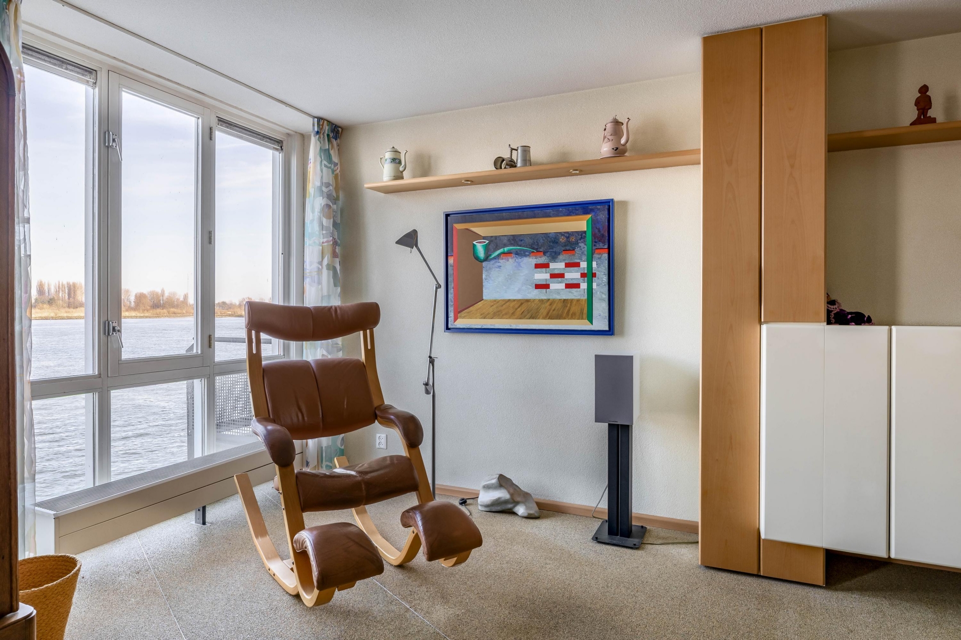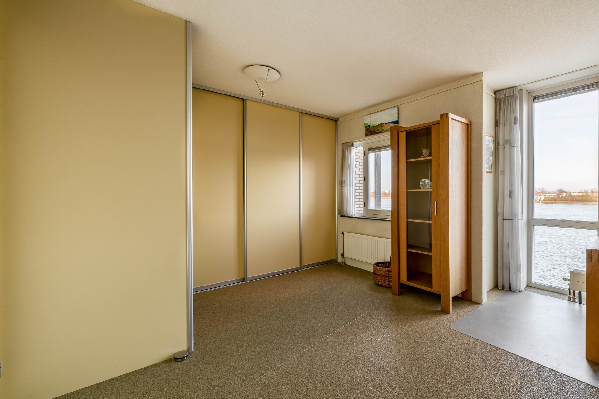 De woonkamer bevindt zich aan de achterzijde en biedt een fantastisch vrij uitzicht over de Nieuwe Maas. Dankzij de grote raampartijen geniet je hier van veel lichtinval. De woonkamer is voorzien van ITHO mechanische ventilatie en geeft toegang tot het balkon op het noordoosten.