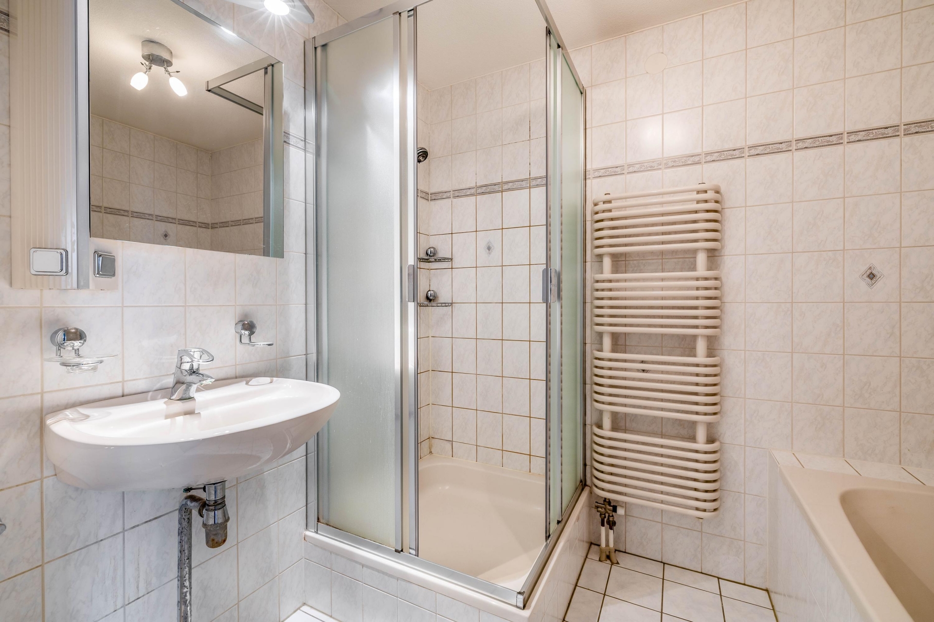 • Een moderne badkamer met wastafel, ligbad en douche