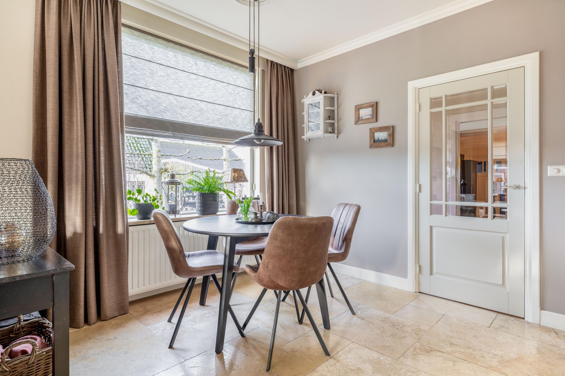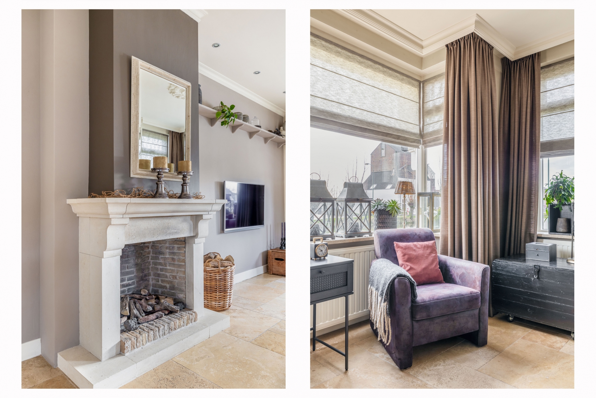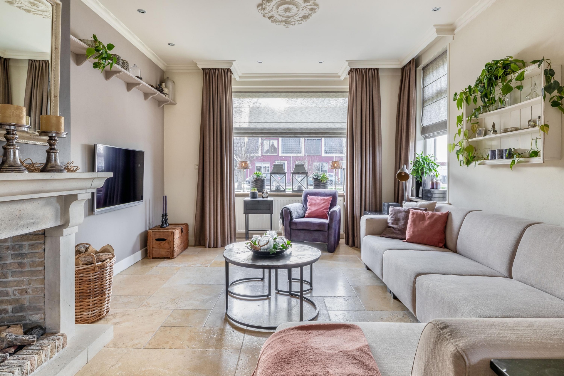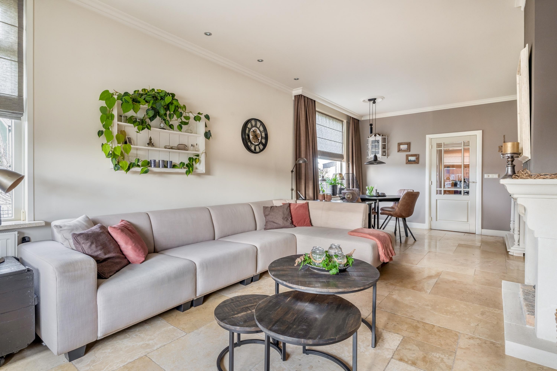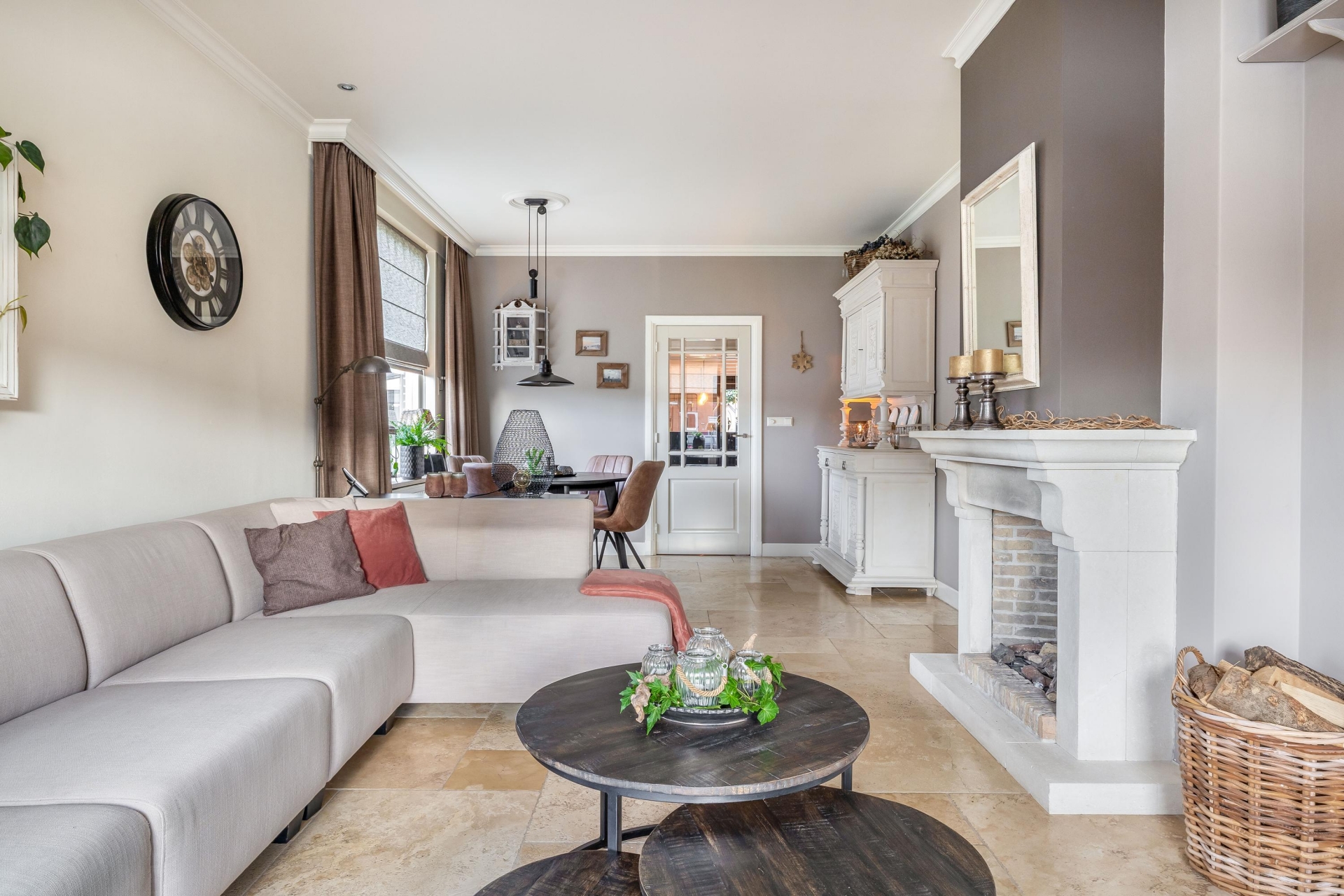 De woonkamer aan de voorzijde is sfeervol en comfortabel ingericht en beschikt over een gashaard, een lichte vloer met vloerverwarming, hoge plinten en een neutrale wandafwerking. Er is ruimte voor een grote zithoek én een eethoek, waardoor je volop kunt genieten van gezellige momenten met familie of vrienden.