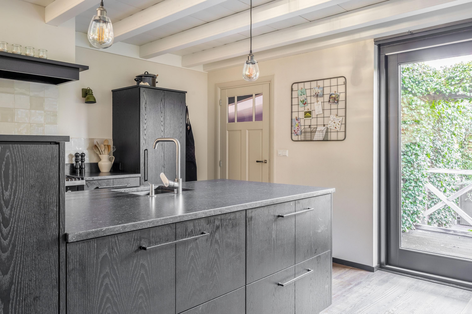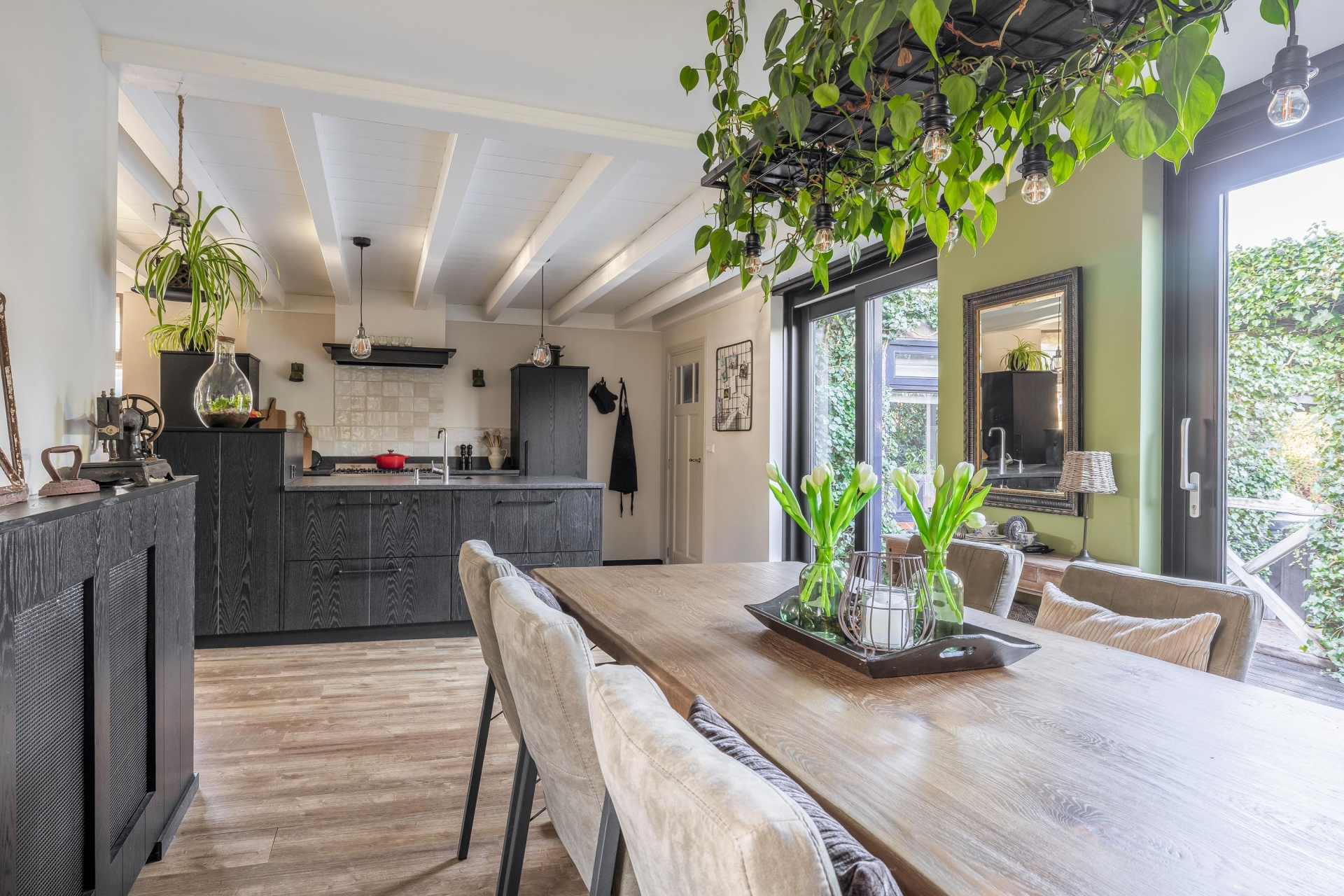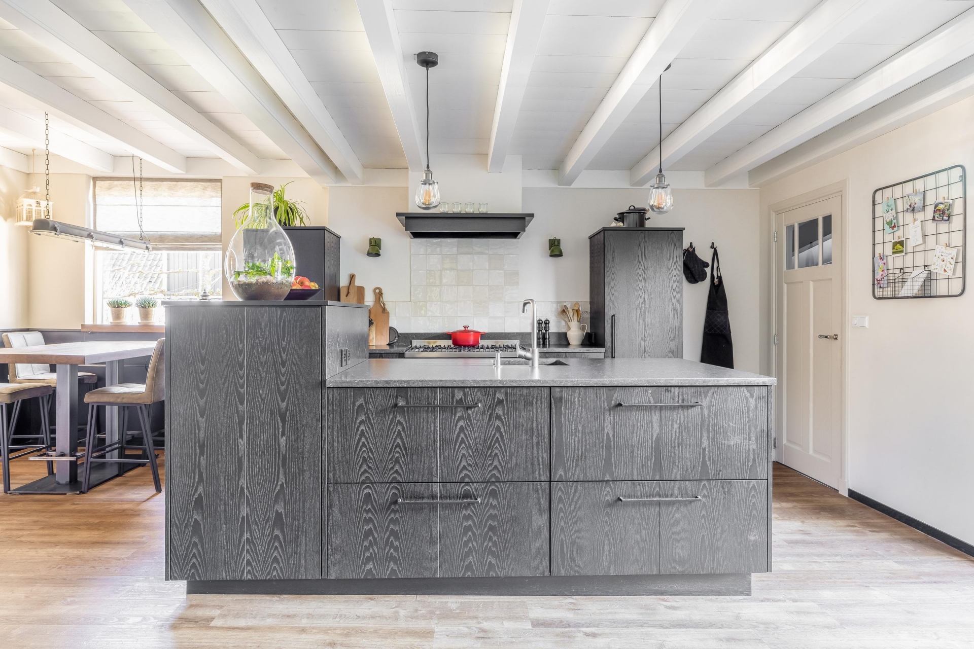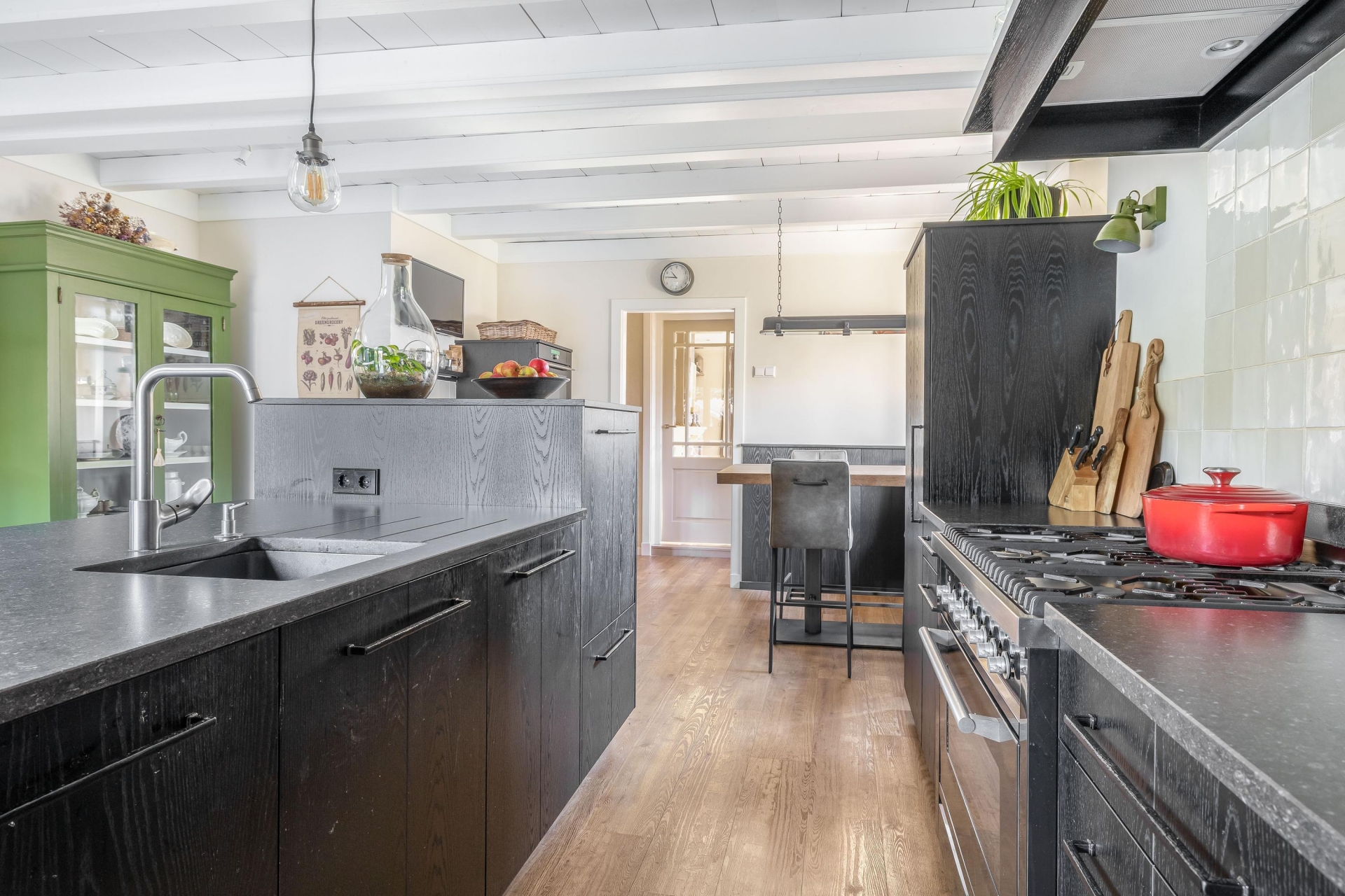In het verlengde van de hal vind je de echte eyecatcher van dit huis: een ruime en stijlvolle woonkeuken, uitgevoerd in zwart hout. Het balkenplafond en de houten vloer geven de ruimte een landelijke, warme sfeer. Uiteraard is de keuken voorzien van moderne inbouwapparatuur.