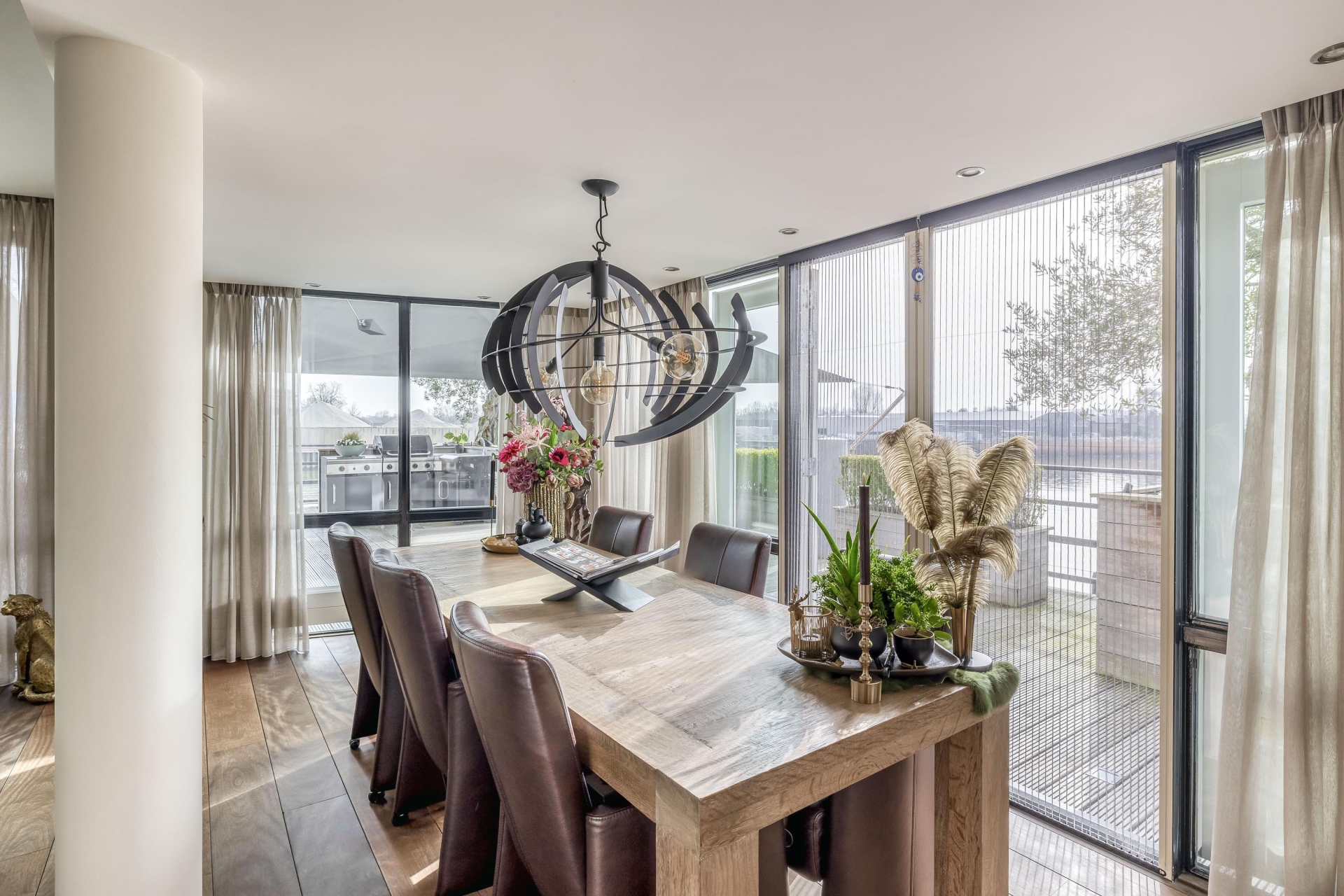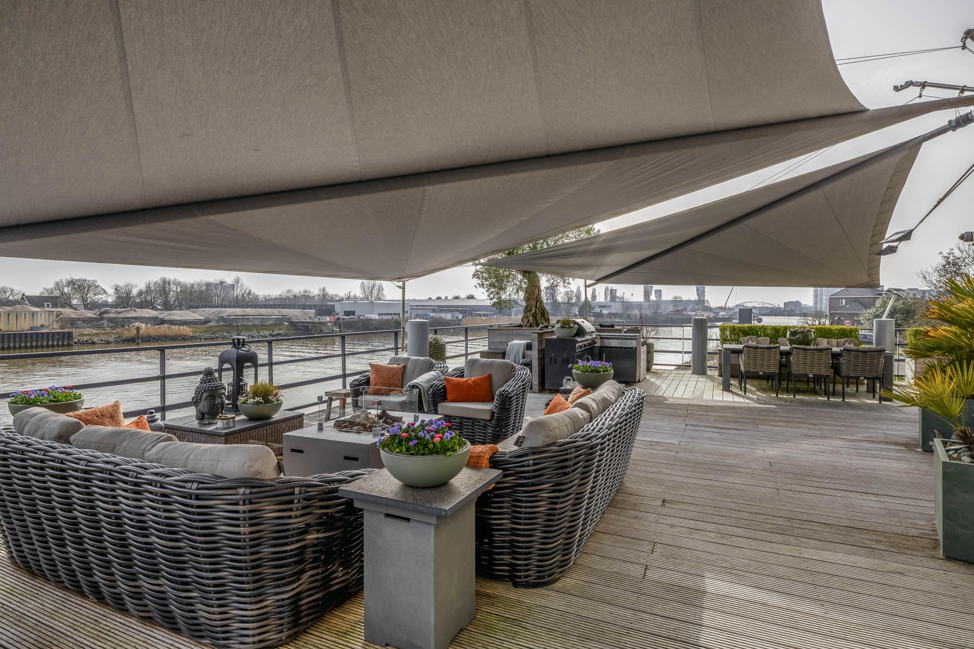 Maar de echte eyecatcher is toch wel het gigantische zonneterras (gelegen op het zuidoosten) met vrij uitzicht op de Hollandsche IJssel. Hier waan je je in mediterrane sferen. Allereerst zijn alle raampartijen, grenzend aan het terras voorzien van volautomatische zonwering. Het gehele terras is voorzien van een prachtig houten vlonderdek. Twee maatwerk zonnedoeken overlappen een groot deel van het terras, waaronder plaats is voor een riante loungehoek, een grote eettafel voor 6 personen en een zeer complete, luxe buitenkeuken. En alsof het nog niet gekker kan, staat er ook nog een heerlijke jacuzzi. Om het terras helemaal af te maken zijn er 3 gigantische houten plantenbakken geplaatst met daarin 3 prachtige olijfbomen van imposant formaat in de plantenbakken zit ook een bewatering systeem . Hoeveel luxer kan je het hebben ?!