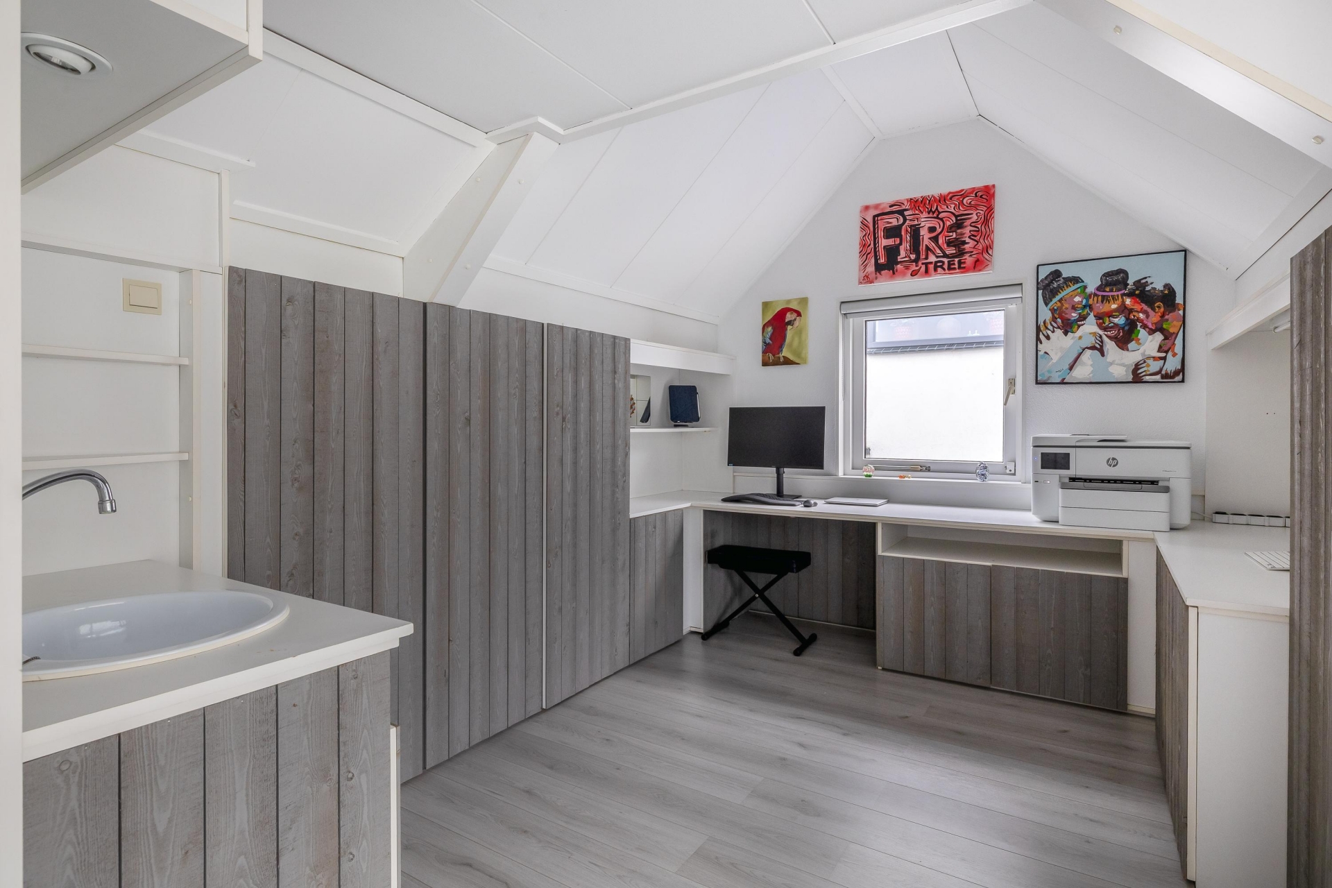 Achter in de tuin staat een sfeervol tuinhuis dat is ingericht als gezellige buitenkamer. Een plek waar je lange avonden doorbrengt, het hele jaar door. Ook een andere invulling, zoals bijvoorbeeld een praktijkruimte kan hier overigens uitstekend!