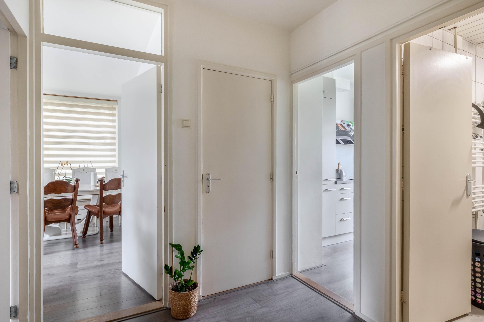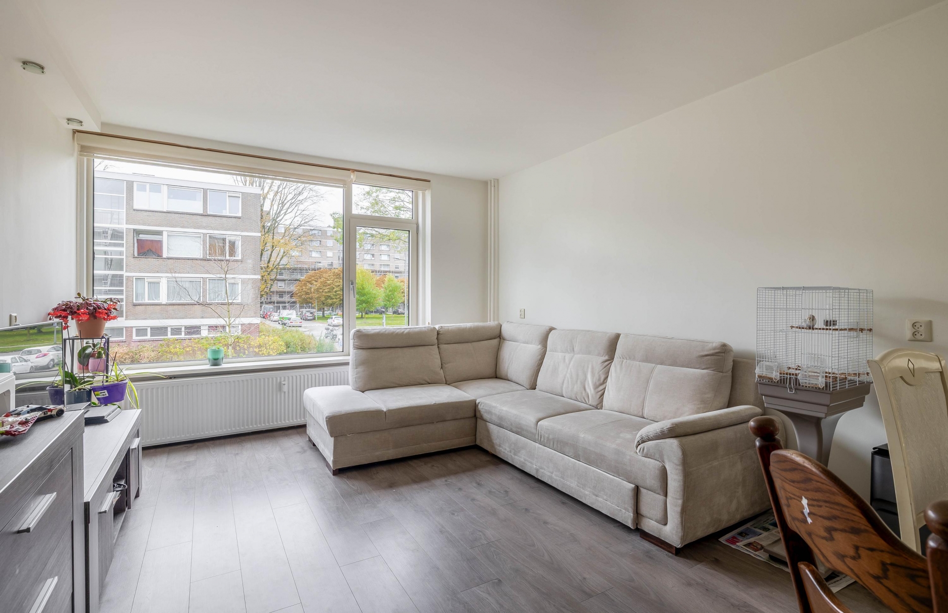 Het appartement ligt op de eerste verdieping van een goed onderhouden portiekflat. De woonkamer is licht dankzij de grote raampartijen en biedt voldoende ruimte voor een gezellige zithoek en een eettafel. De vloer is netjes afgewerkt en de witte wanden zorgen voor een frisse basis. Vanuit de woonkamer loop je zo het balkon op — heerlijk gelegen op het zuidoosten — waar je in de ochtend en vroege middag van de zon kunt genieten.