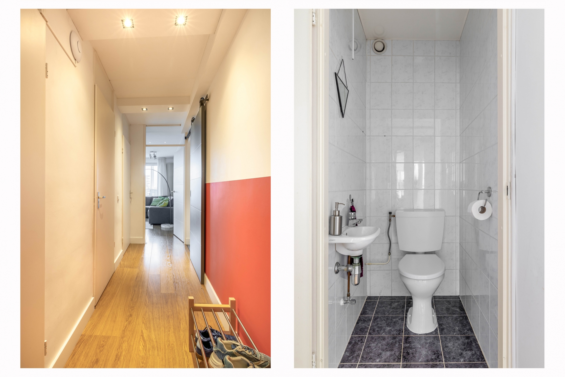 De badkamer is netjes afgewerkt en voorzien van een douche, dubbele wastafel en de wasmachineaansluiting. Het toilet bevindt zich separaat van de badkamer, wel zo prettig.