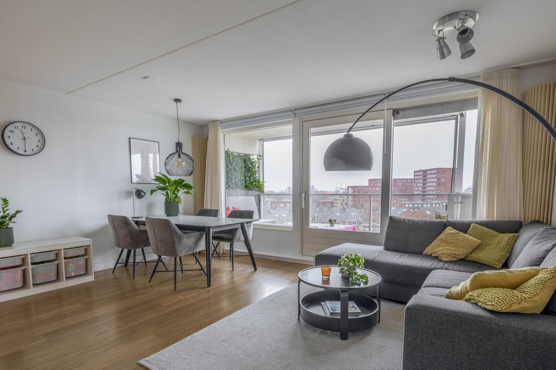 De woonkamer is ruim van opzet en wordt door de grote raampartijen heerlijk verlicht. Dankzij de ligging op hoogte kijk je hier mooi weg over de wijk, terwijl je binnen geniet van een comfortabele zithoek en plek voor een eettafel. De toegang tot het zonnige balkon loopt direct vanuit de woonkamer.