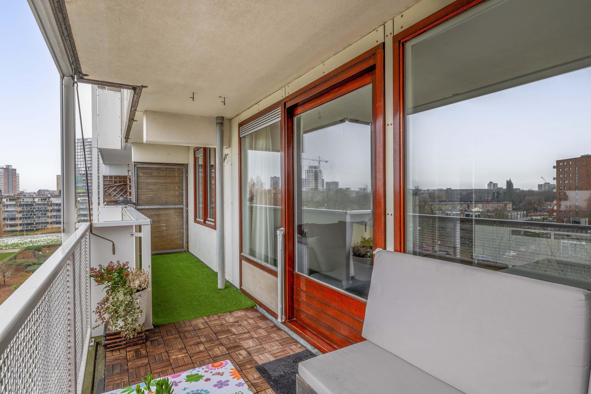 Een groot pluspunt is het terras op het zuidwesten. Het balkon is uitzonderlijk ruim, 12,5 vierkante meter, over de volledige breedte van het appartement. De vaste zithoek op het balkon is op maat gemaakt, inclusief de kussens. Het maakt het mogelijk om vrijwel het hele jaar comfortabel buiten op het balkon te zitten. Het brede deel van het balkon is voorzien van een zonnescherm. Door de ligging op de zesde verdieping geniet je hier van de middag- en avondzon, rust en privacy. Het terras is sfeervol ingericht met houten vlonders, groen en ruimte voor een zitje. Ideaal voor een kop koffie in de zon of een ontspannen borrel aan het eind van de dag.
