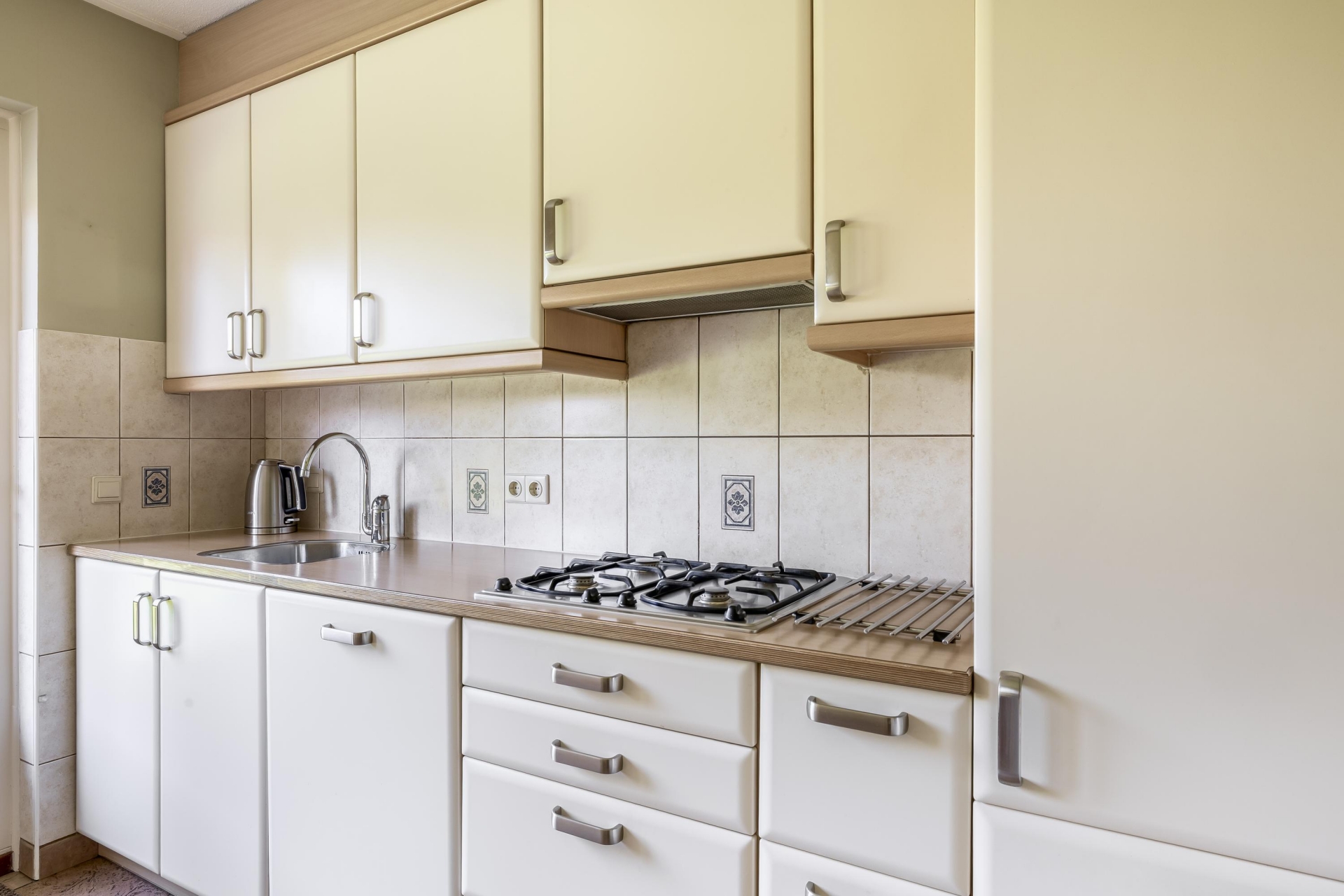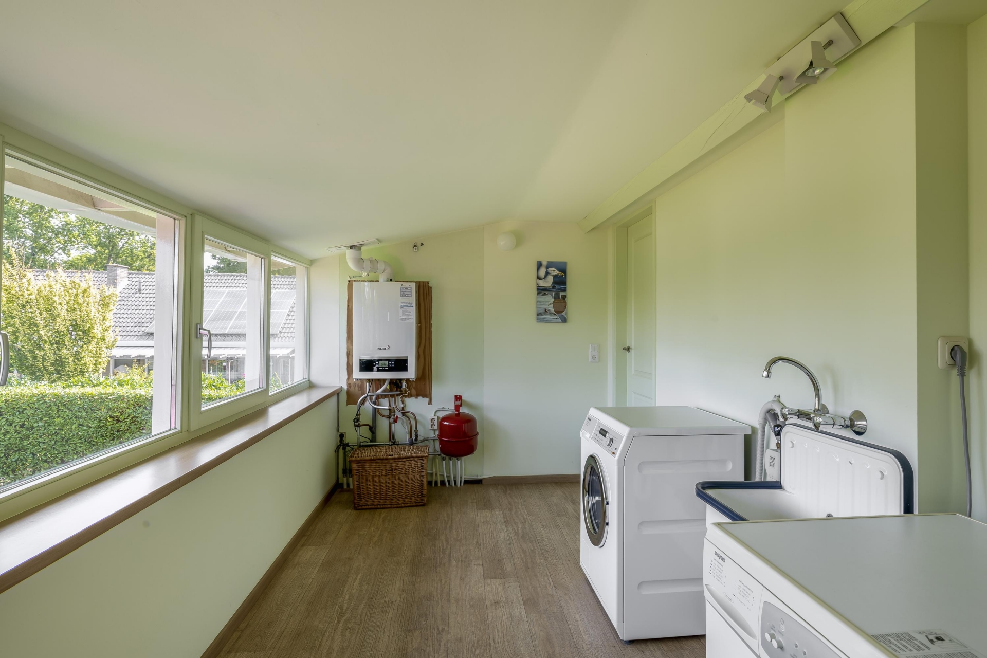 Stap je de woonkamer binnen, dan valt meteen op hoeveel daglicht er binnenkomt. Dankzij de grote ramen en het groene uitzicht rondom voelt het hier licht en open. De ruimte is royaal opgezet en geeft je genoeg plek voor zowel een gezellige zithoek als een grote eettafel. Vanuit meerdere kanten kijk je uit op het groen en de tuin, wat het binnen-buiten gevoel versterkt.