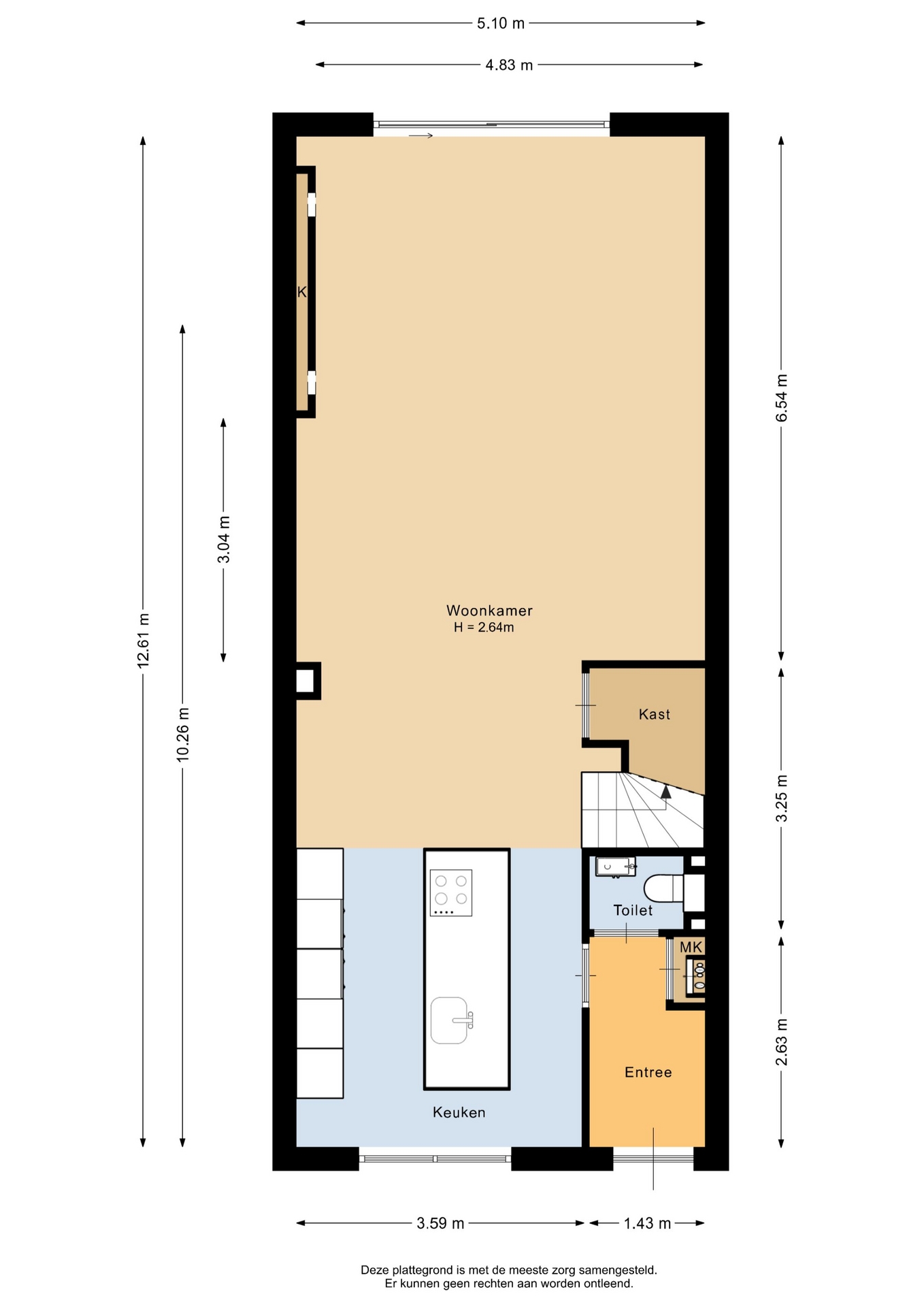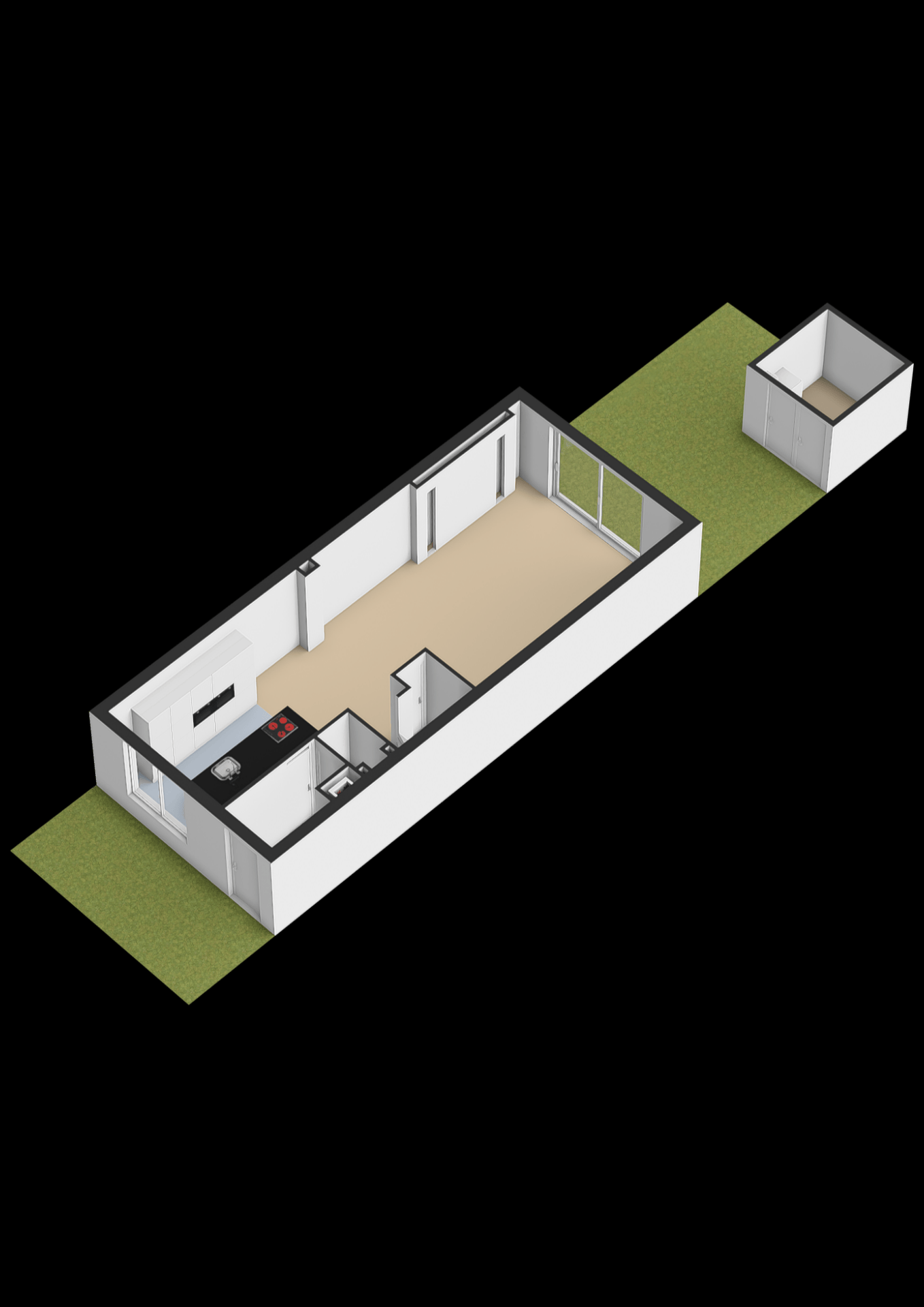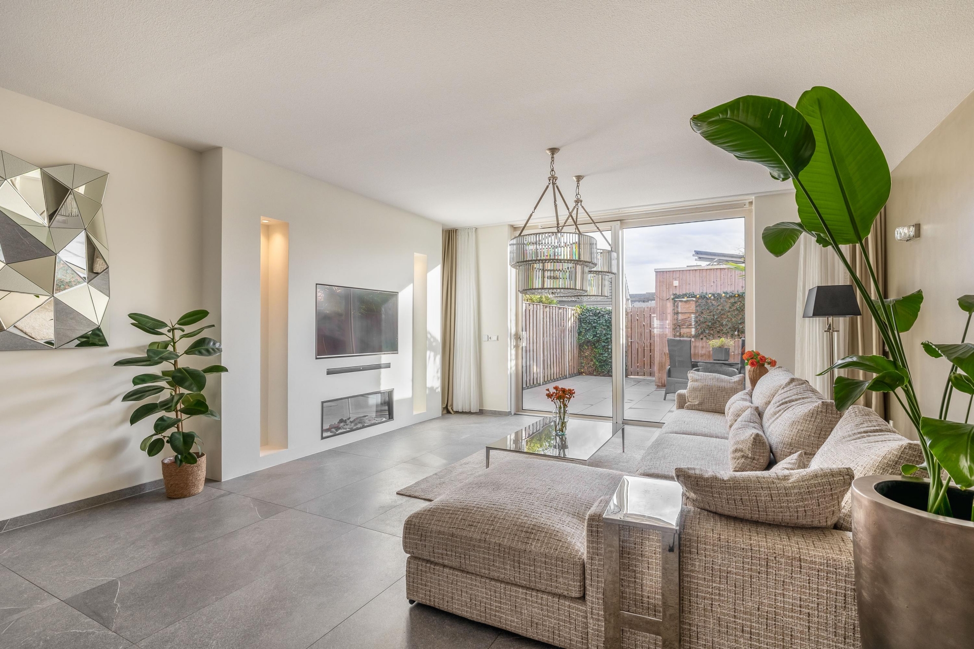 De ruime woonkamer is licht, strak en uitnodigend. Dankzij de grote schuifpui heb je mooi zicht op de tuin en voelt buiten als een verlengde van binnen. De grijze tegelvloer, de neutrale wanden en de slimme indeling zorgen ervoor dat je hier echt je eigen sfeer kunt creëren. Aan de voorzijde ligt de moderne keuken, uitgevoerd met een wit kookeiland en geïntegreerde inbouwapparatuur. Koken, kletsen en leven gaan hier naadloos in elkaar over.