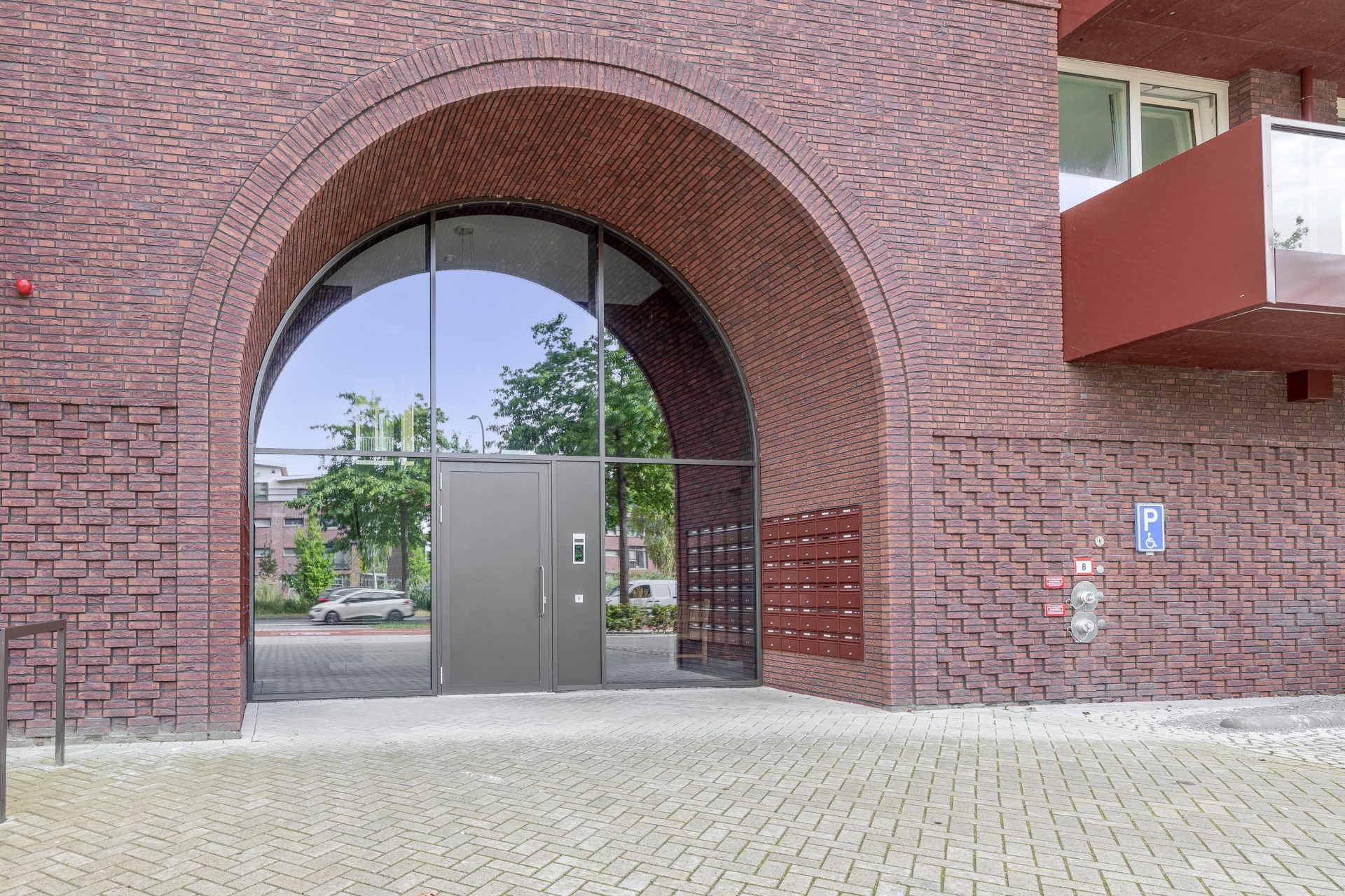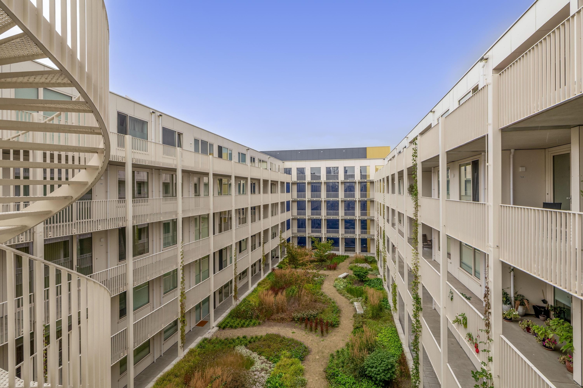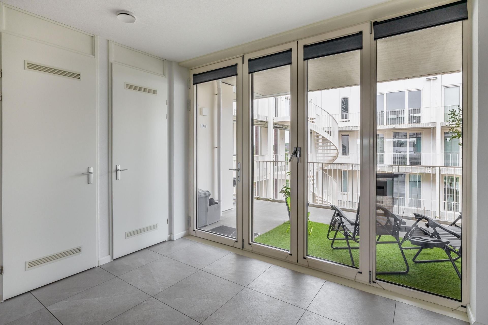 Voor de entree is genoeg ruimte voor een zitje, met uitzicht op het binnenterrein van het complex.