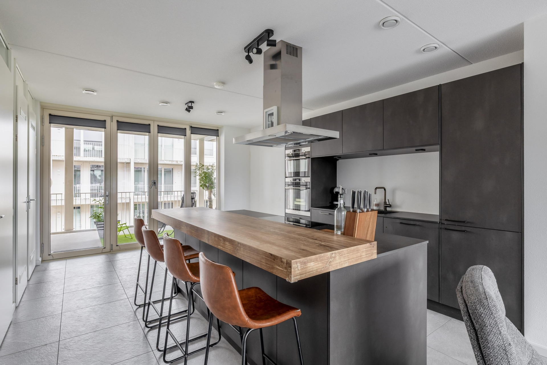 De keuken is zonder twijfel een van de eyecatchers van dit huis. De donkere kastenwand in combinatie met het robuuste kookeiland en houten barblad zorgen voor een luxe uitstraling. Natuurlijk is deze keuken volledig uitgerust met moderne inbouwapparatuur, waaronder een oven en combi-oven, inductiekookplaat met afzuigkap, koel-vriescombinatie en vaatwasser. Vanuit de eetkamer heb je direct toegang tot een heerlijk zitje buiten — een fijne plek voor je eerste kop koffie of een goed glas wijn aan het eind van de dag.