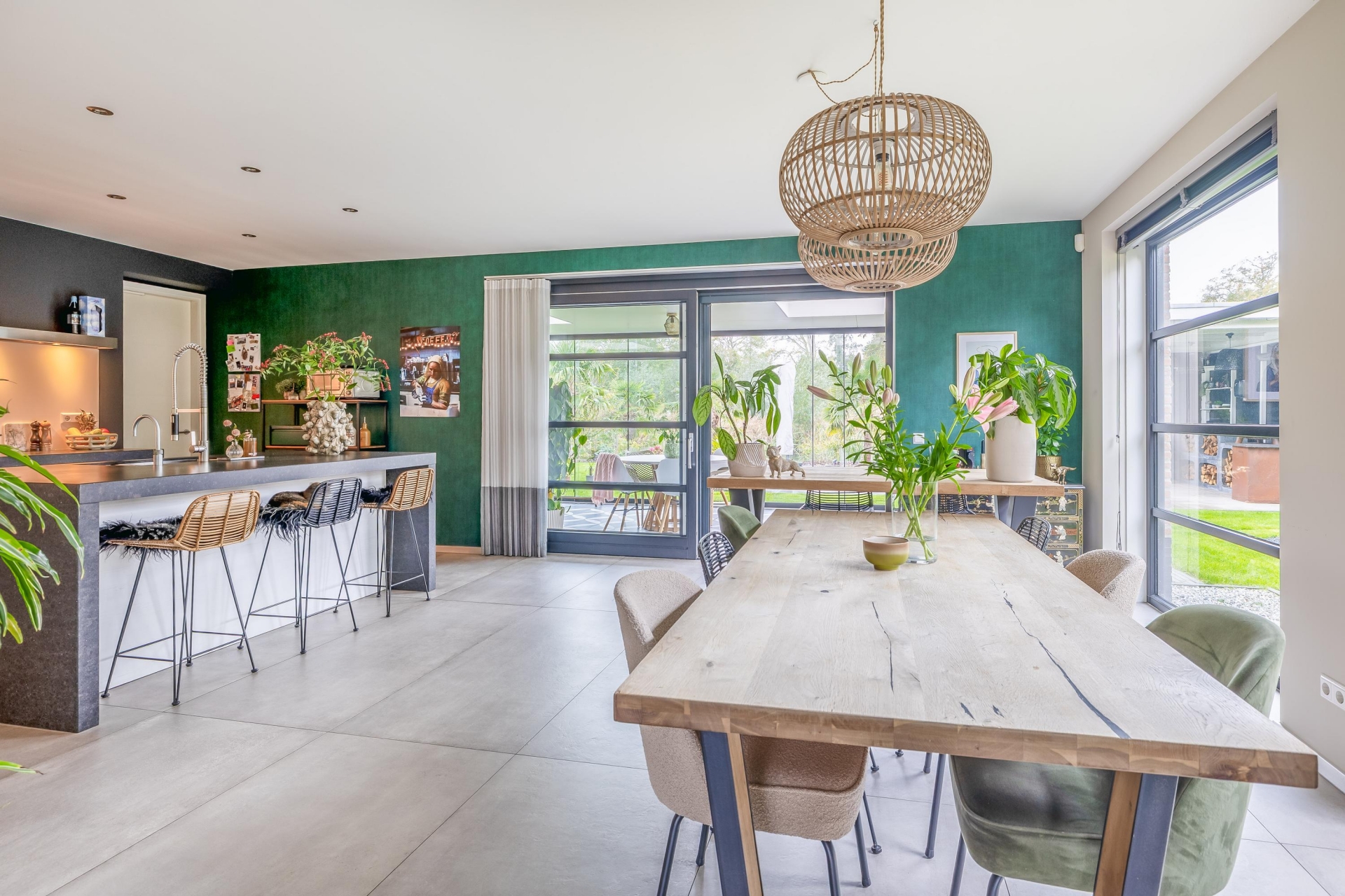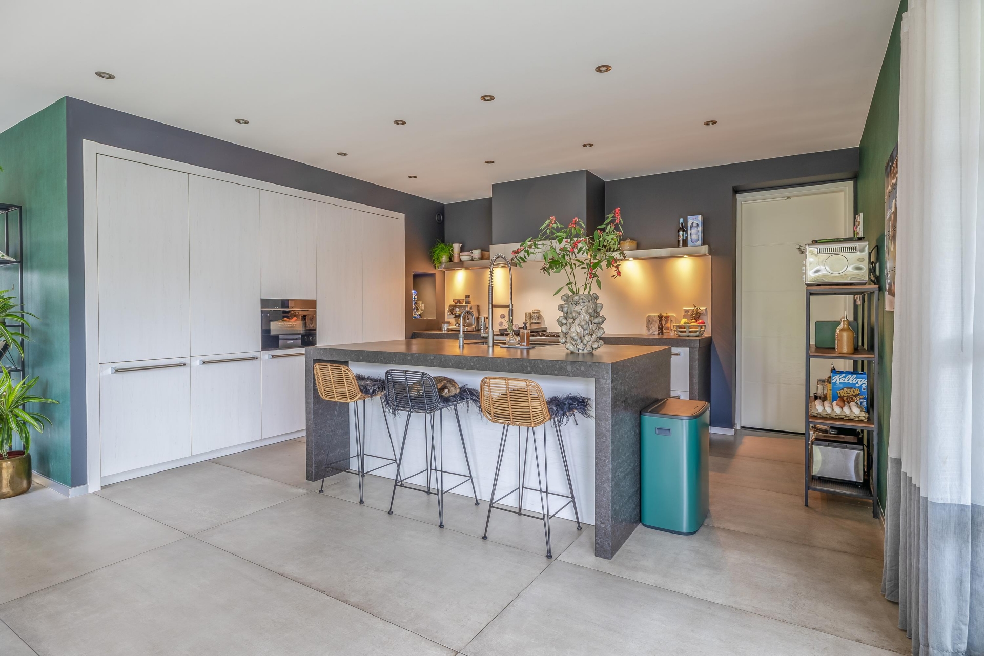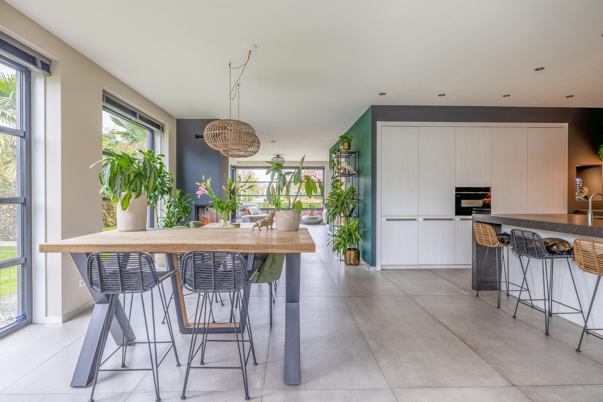 De woonkeuken is een droom voor kookliefhebbers: modern, ruim, voorzien van een royaal eiland en hoogwaardige inbouwapparatuur, zoals het 6 pits Viking fornuis met oven. Aansluitend vind je een praktische bijkeuken, toegang tot de inpandige garage én een extra kantoorruimte – ideaal voor werken aan huis. De serre aan de achterzijde maakt het plaatje compleet. Deze ruimte met glazen schuifwanden en daklichten verbindt binnen moeiteloos met buiten en zorgt voor een plek waar je ieder seizoen kunt genieten.