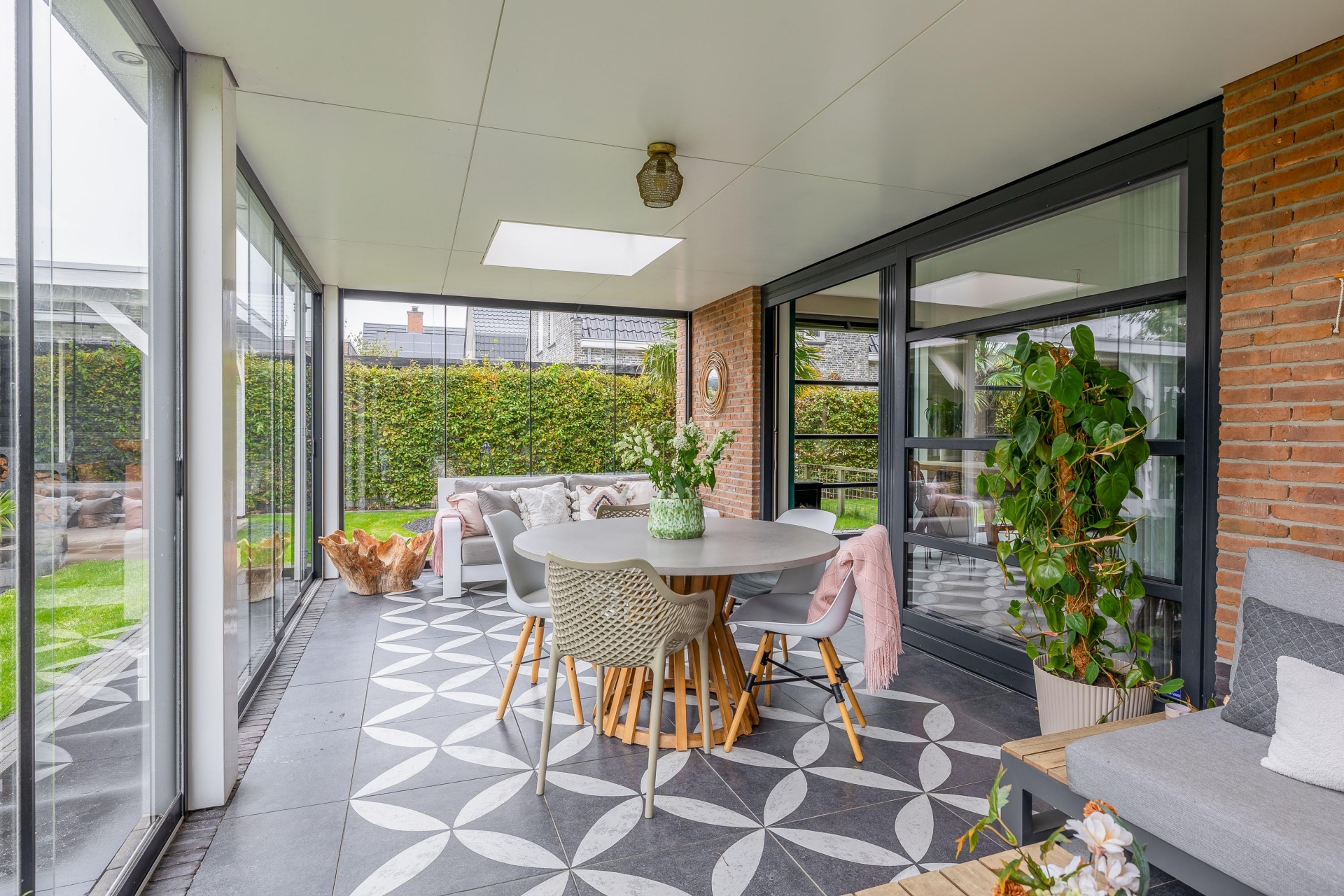- Serre met glazen schuifwanden, kan helemaal open, twee daklichten;