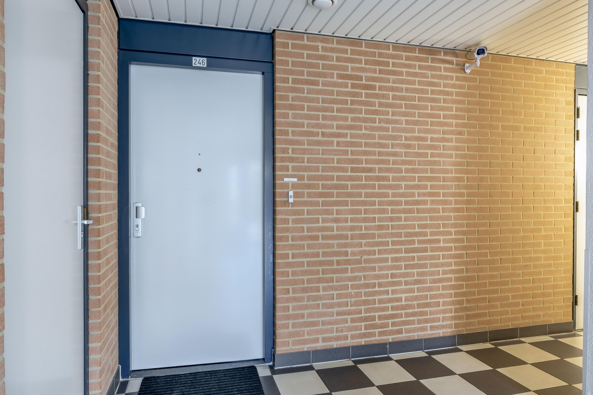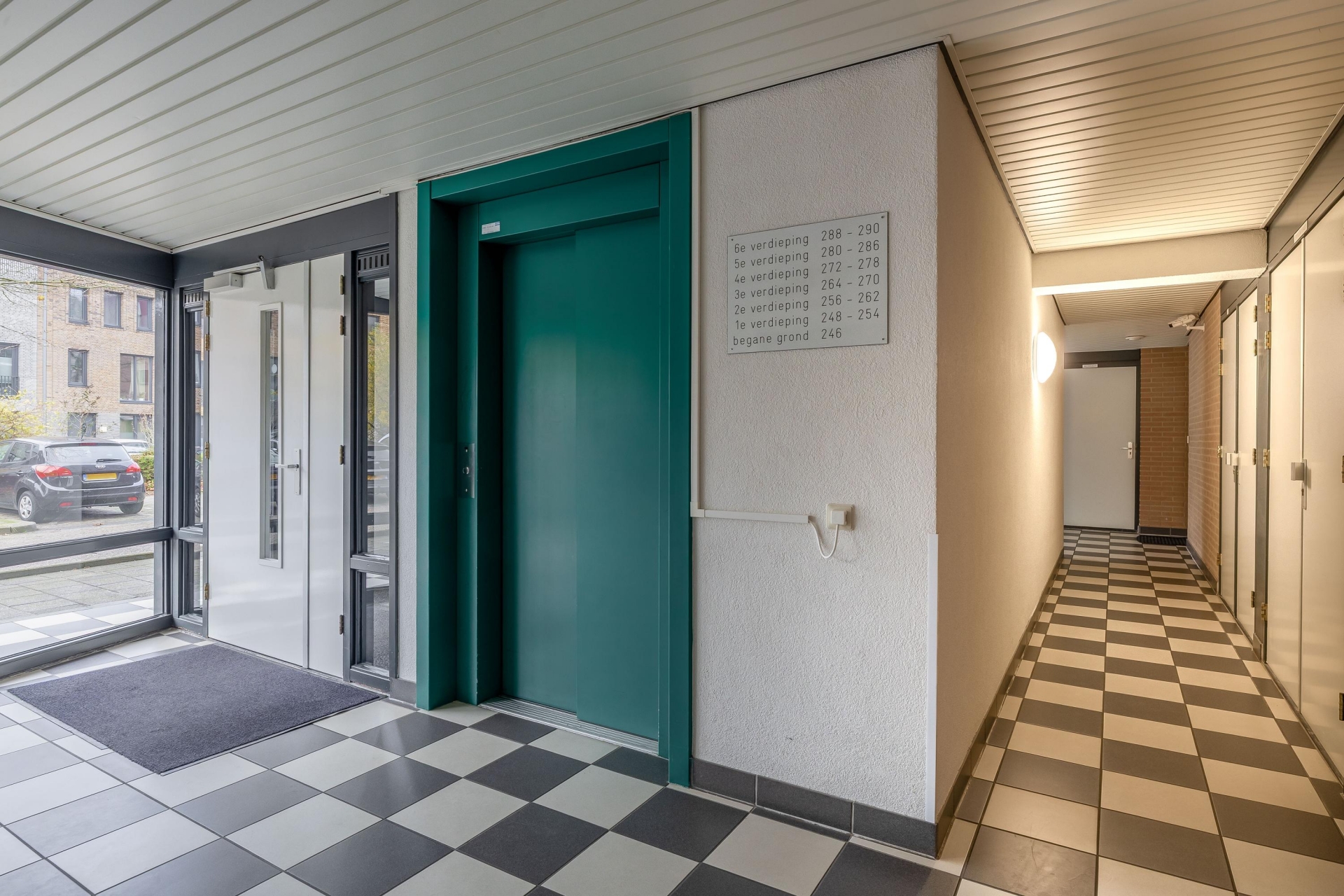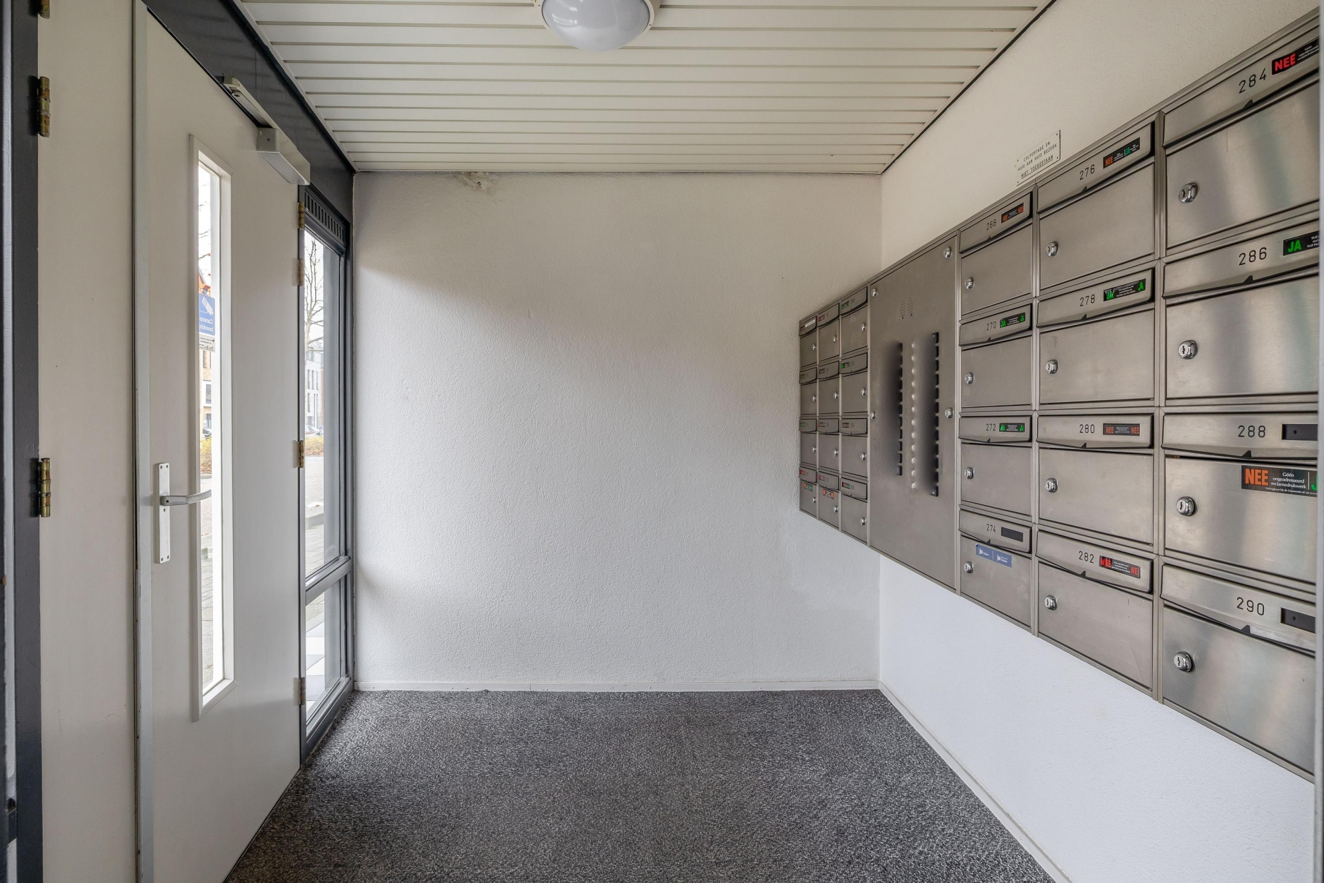 Afgesloten en representatieve entree met intercom en brievenbussen. Centrale hal met lift en een trappenhuis.