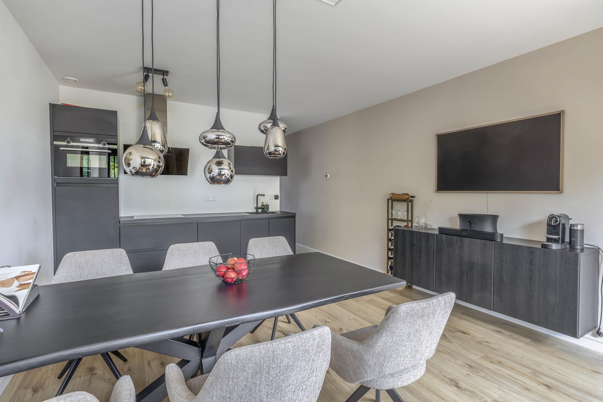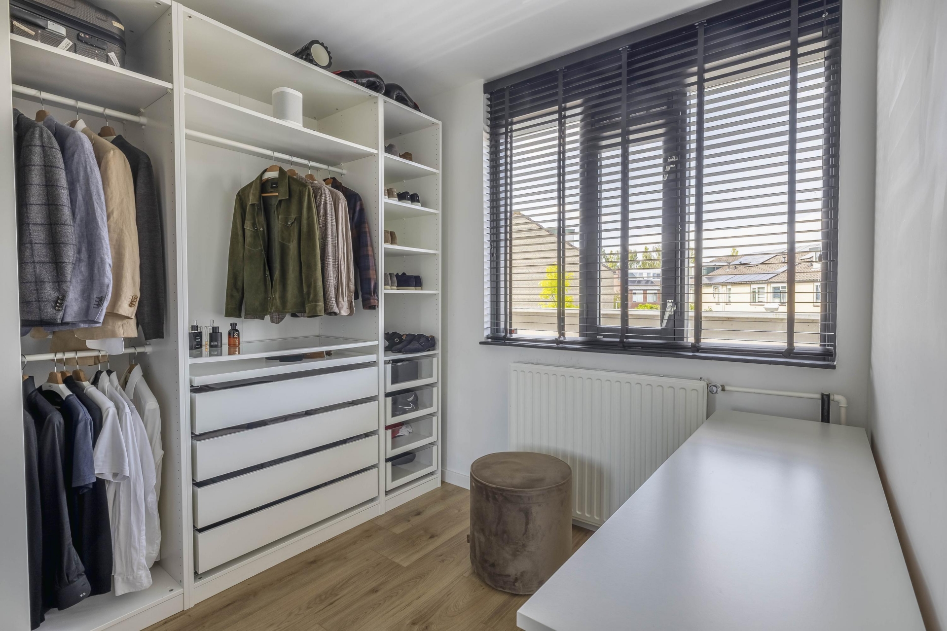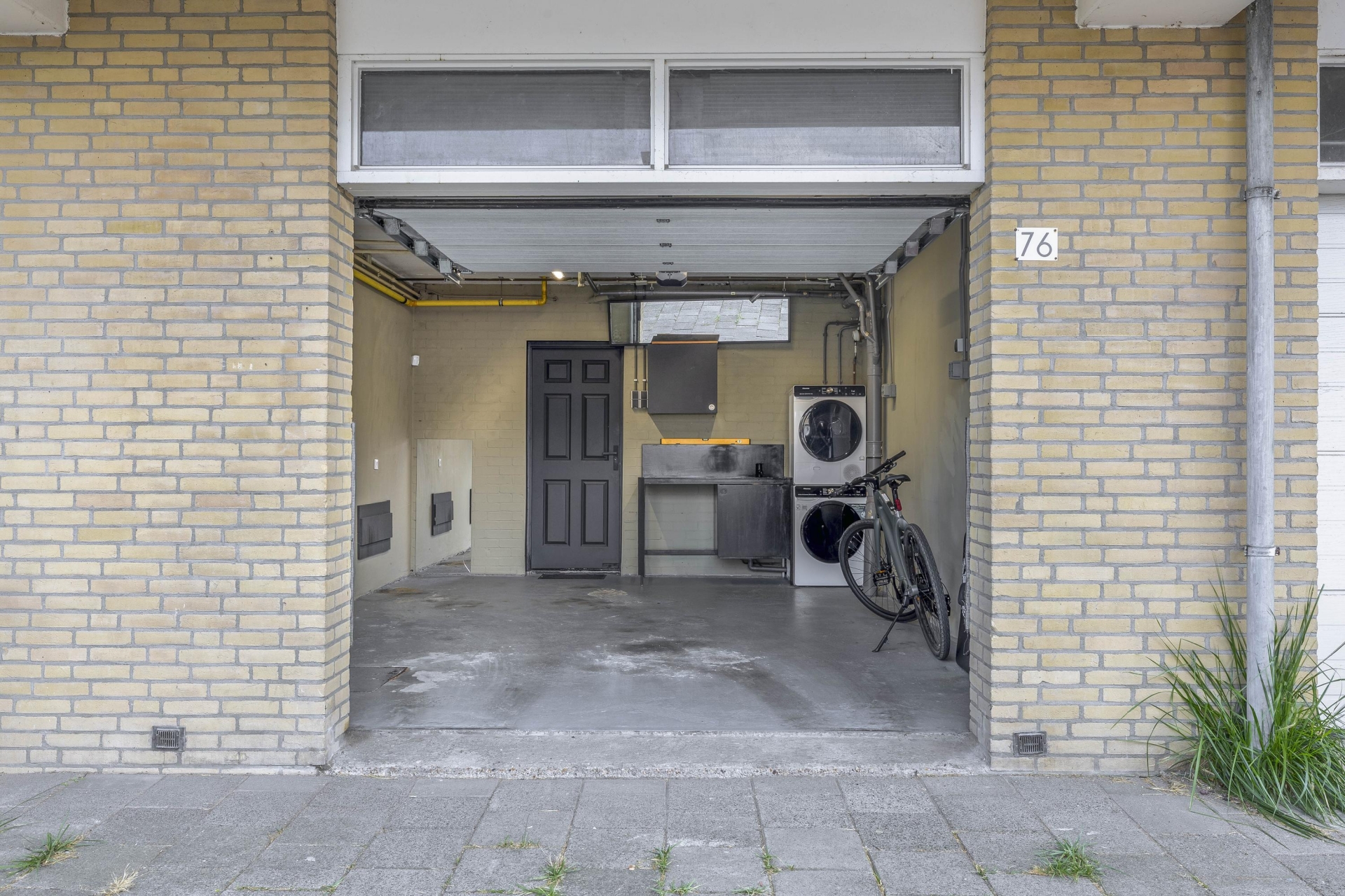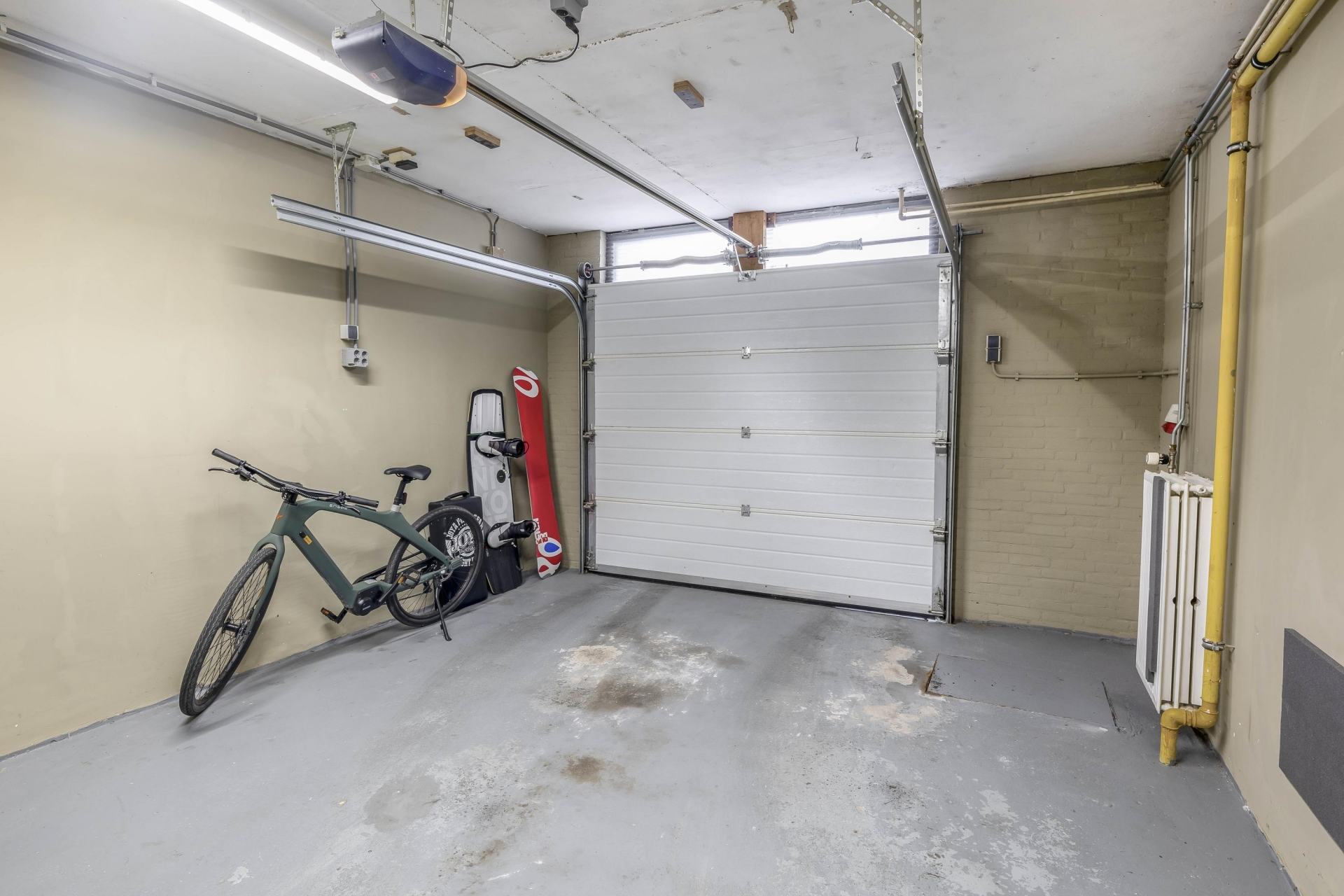 Aan de voorzijde treft u de garage, voorzien van een laadpunt, verwarming, warm water en een aansluiting voor de wasmachine.