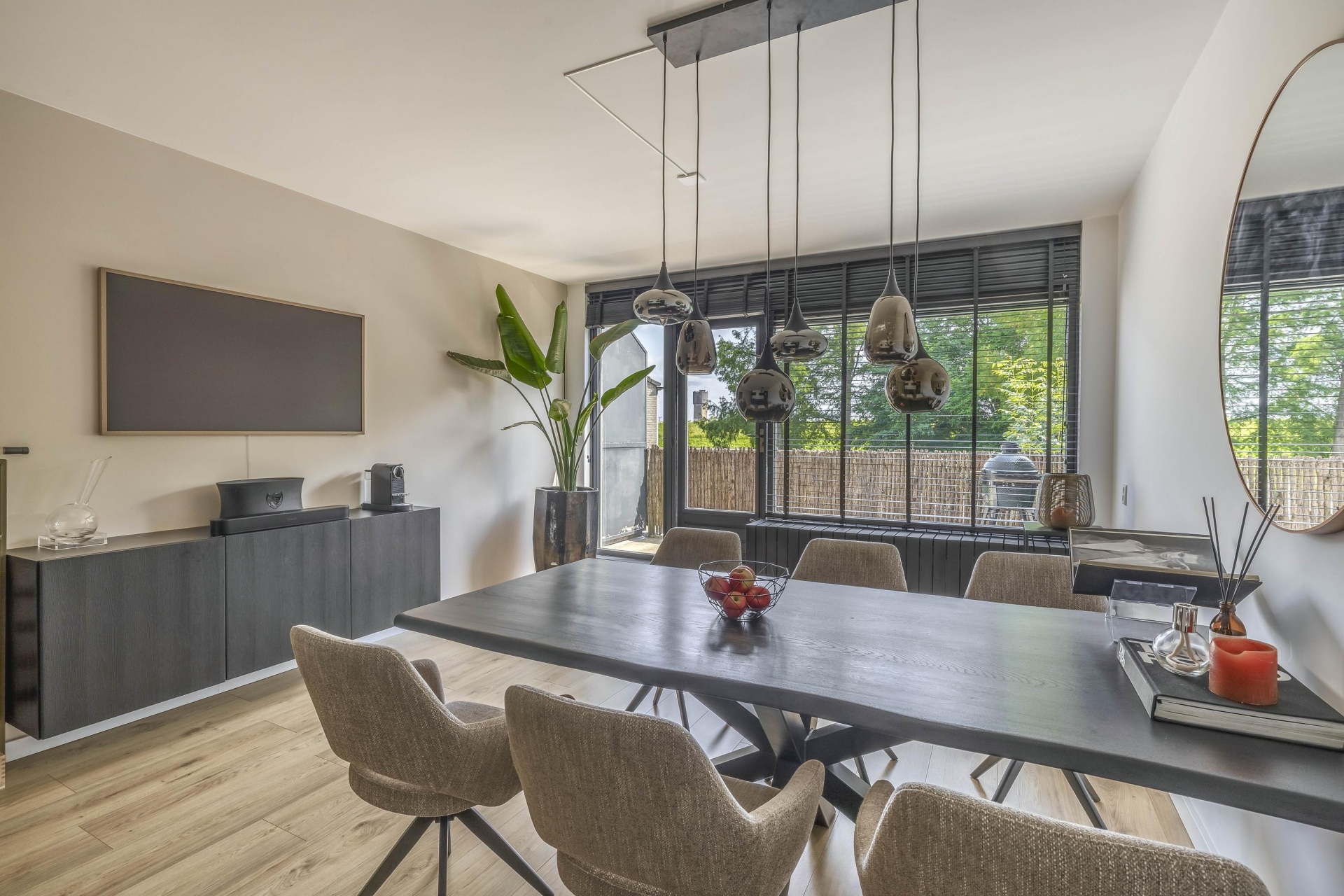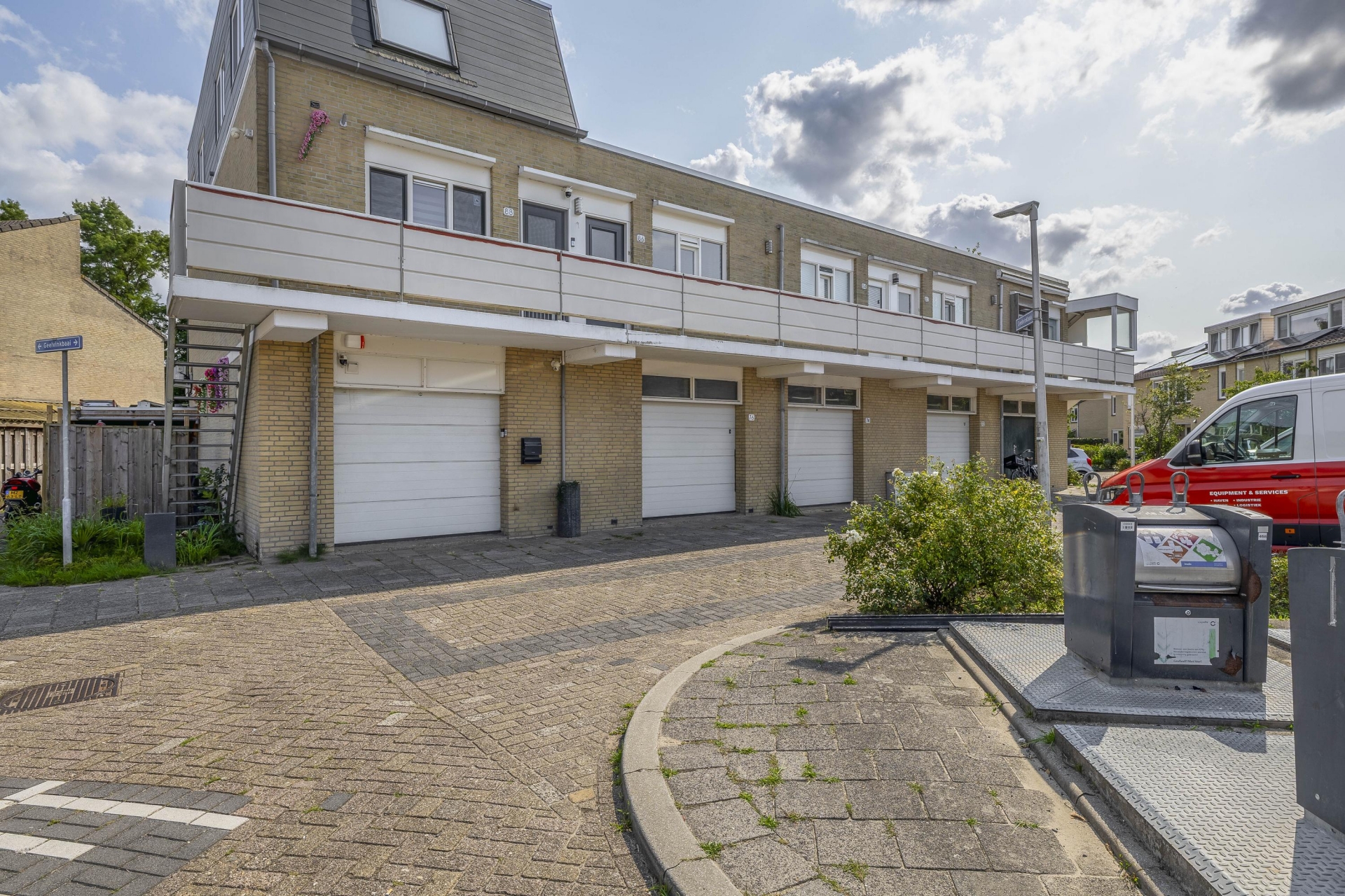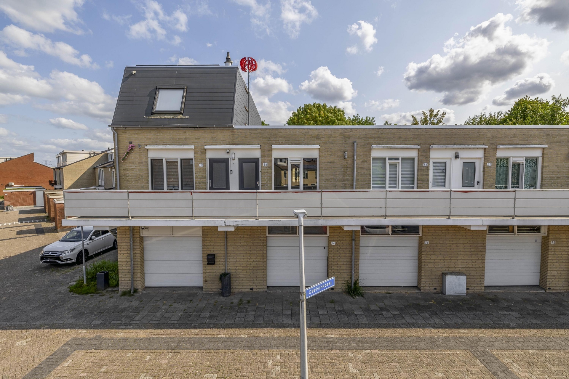 Aan de voorzijde treft u de garage, voorzien van een laadpunt, verwarming, warm water en een aansluiting voor de wasmachine.