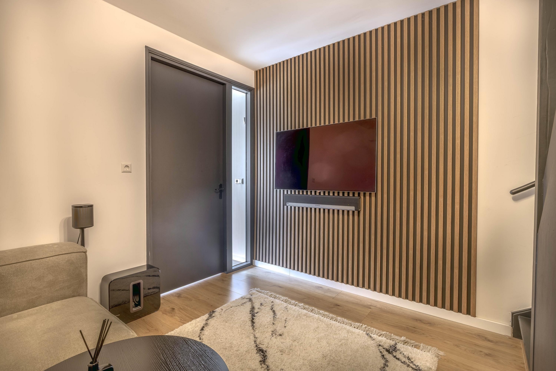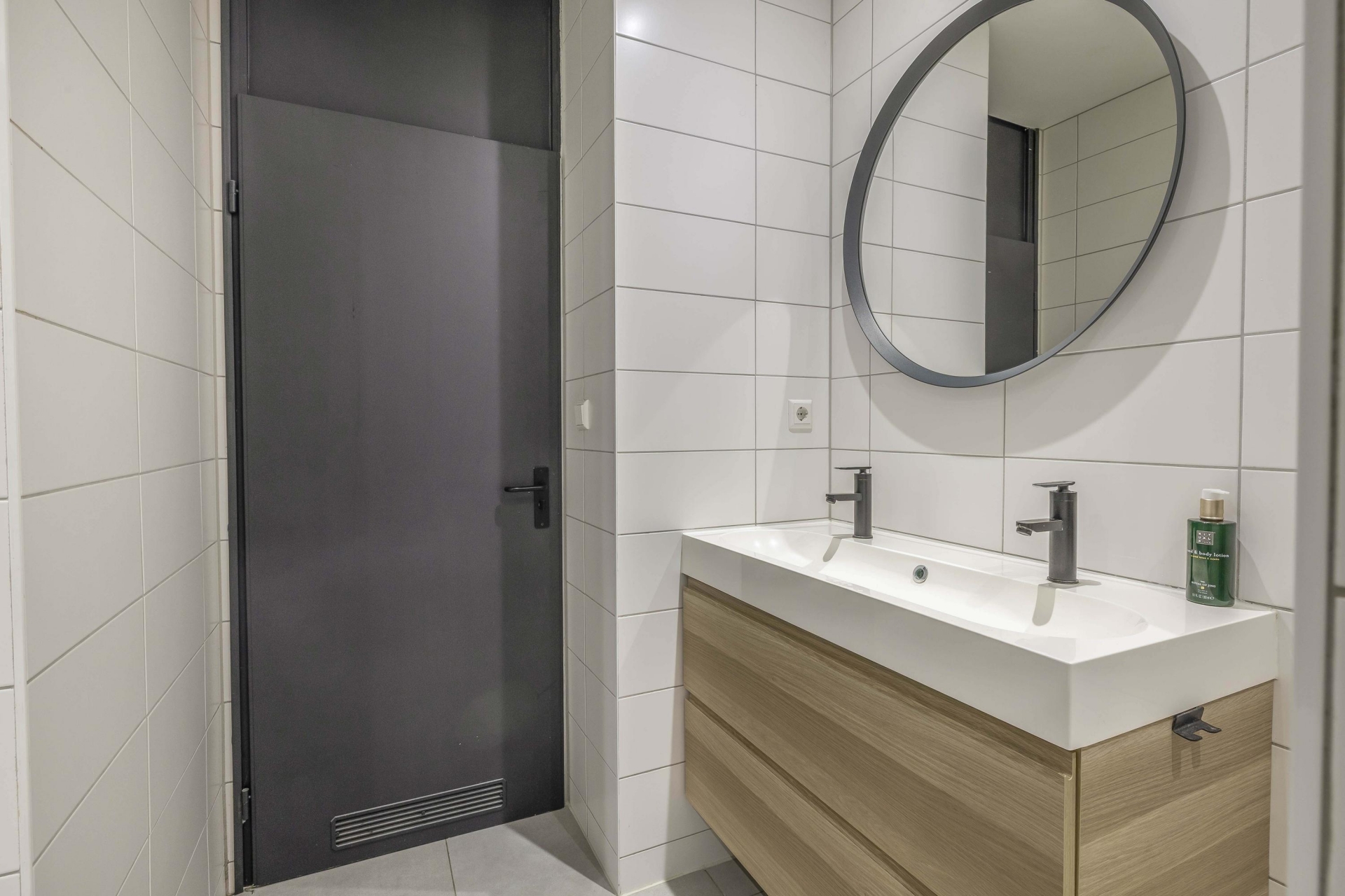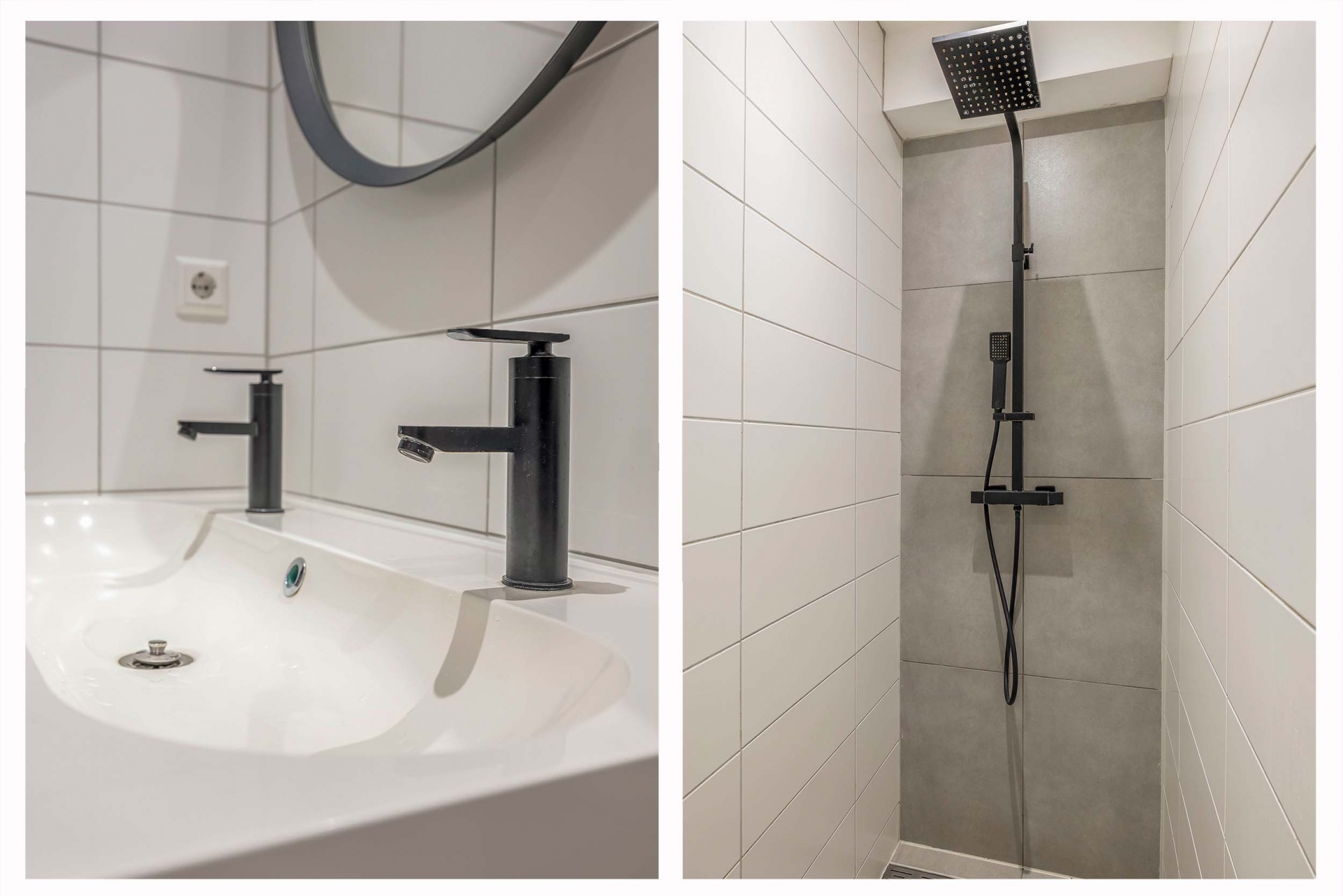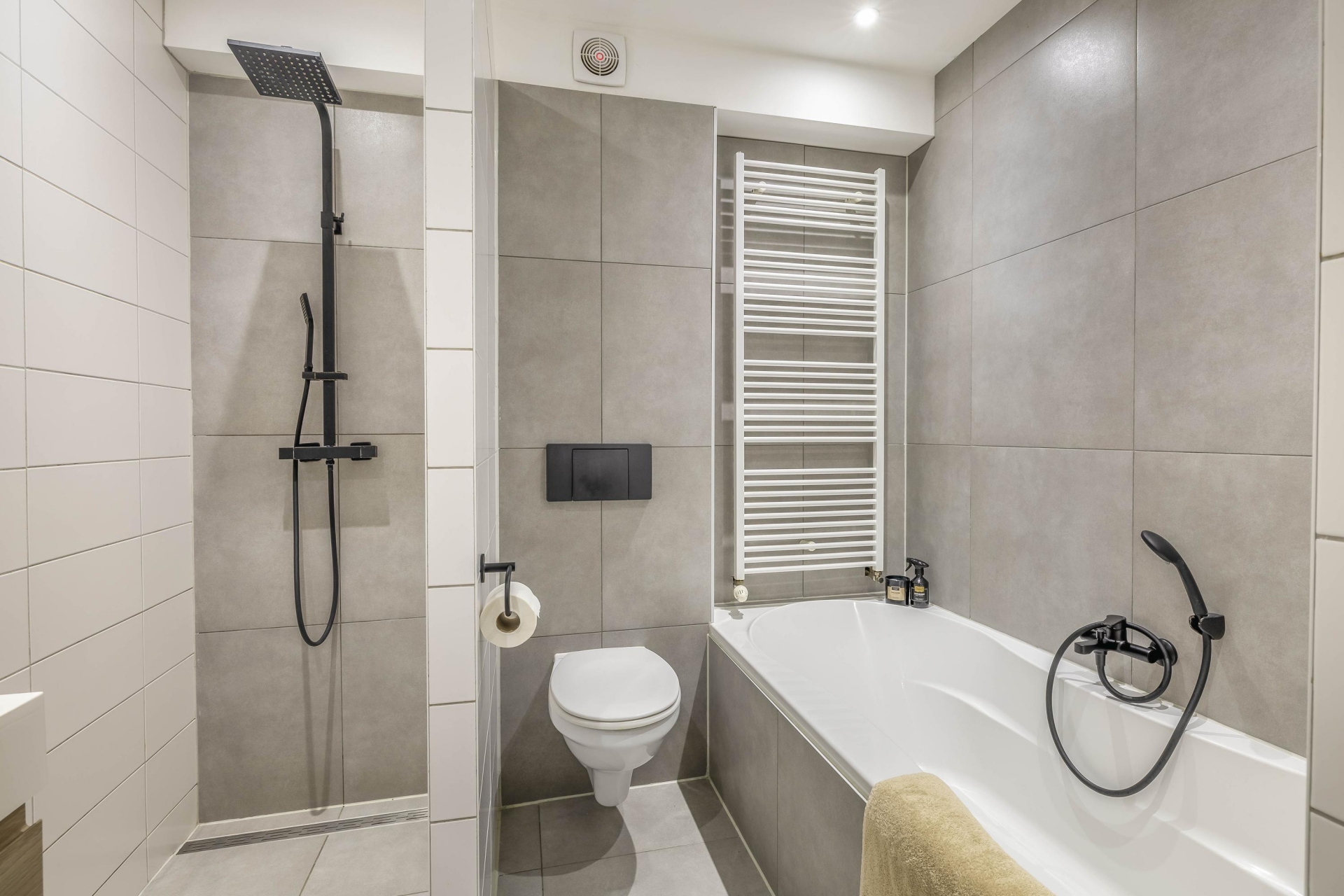 De volledig gerenoveerde badkamer (2021) is geheel betegeld en uitgerust met een inloopdouche, ligbad, toilet en een dubbel wastafelmeubel.