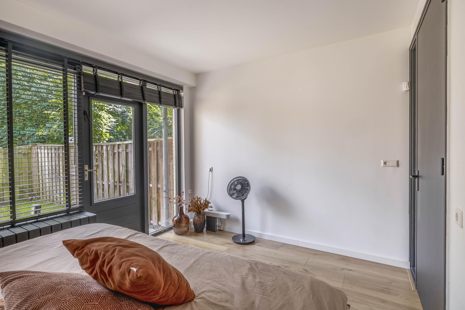 Aan de achterzijde van de woning bevindt zich een ruime slaapkamer van circa 3,17 bij 4,14 meter, met uitzicht op de tuin.