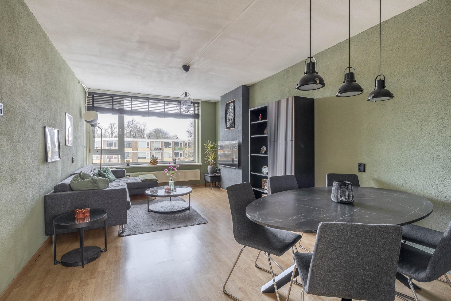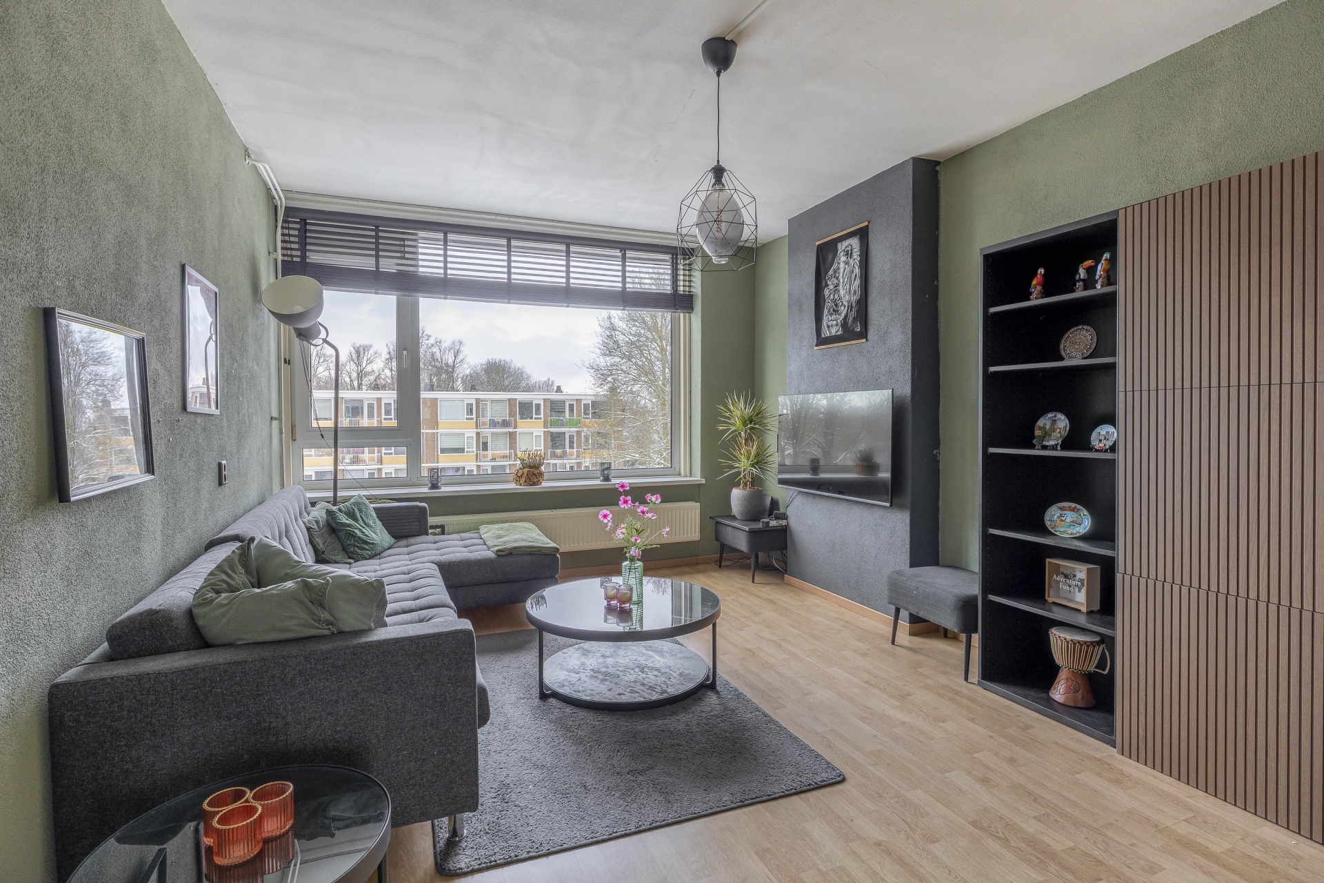 De ruime woonkamer is voorzien van een parketvloer, strak gestucte wanden en airconditioning (onderhouden in 2025), en biedt een prachtig uitzicht op het water.
