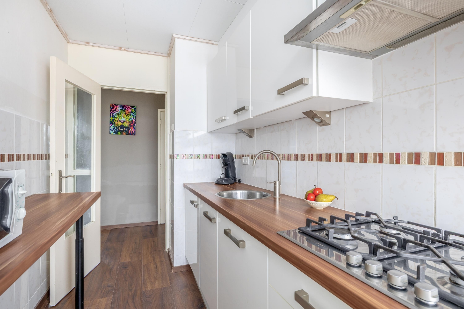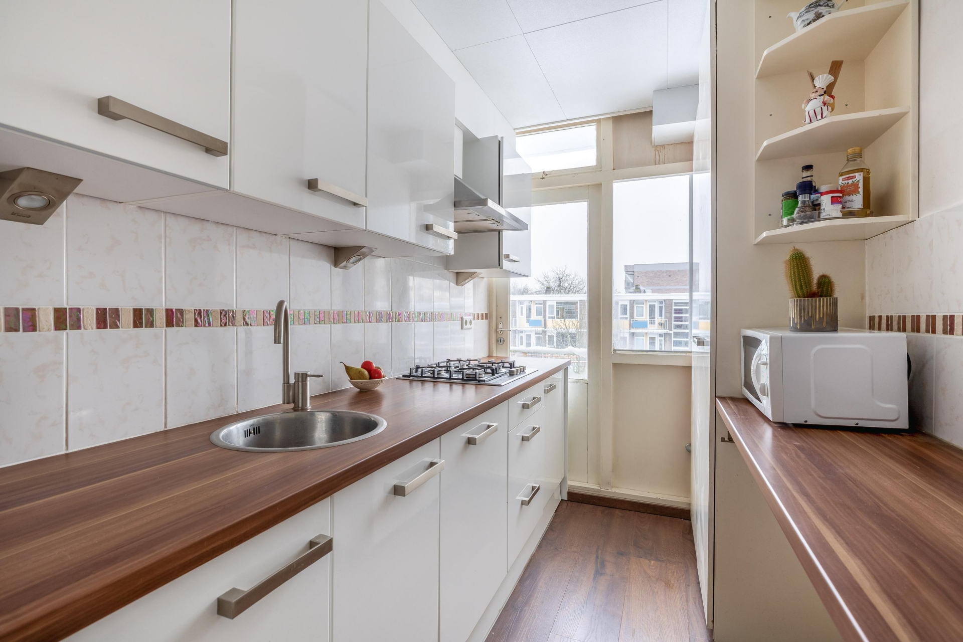 De dichte keuken is opgesteld in wandopstelling en beschikt over veel bergruimte. De keuken is recent verbouwd en voorzien van een nieuw plafond (september 2025). Uitgerust met een spoelbak, 4-pits gaskookplaat met afzuigkap, vaatwasser, koelkast en vriezer. De CV-ketel is netjes weggewerkt in een kast; de CV-installatie en radiatoren zijn in april 2025 goedgekeurd tot april 2027. Via een nieuwe deur (januari 2026) bereikt u het zonnige balkon op het zuidwesten.