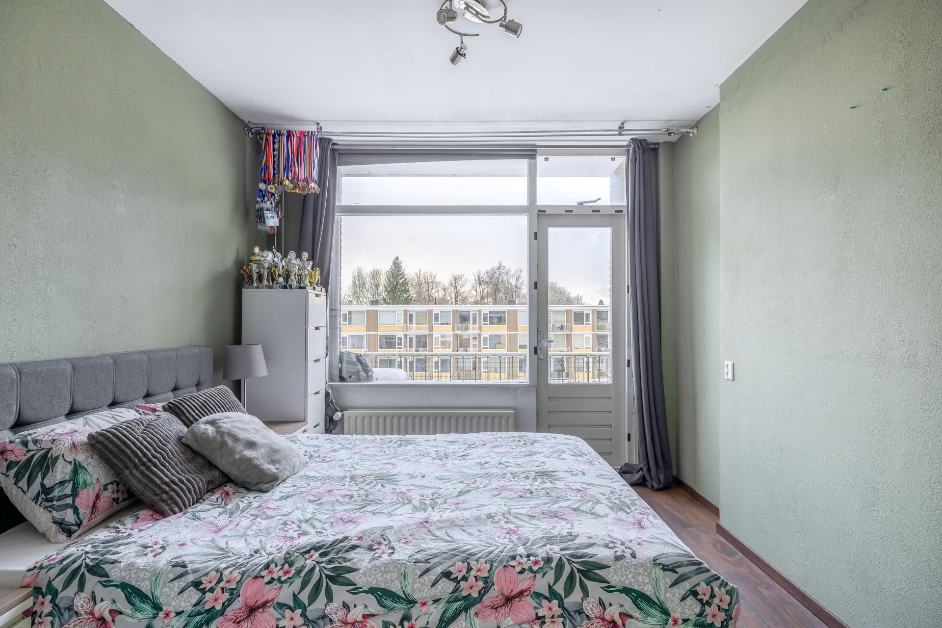 Slaapkamer 1: gelegen aan de voorzijde, voorzien van parketvloer en toegang tot het balkon.