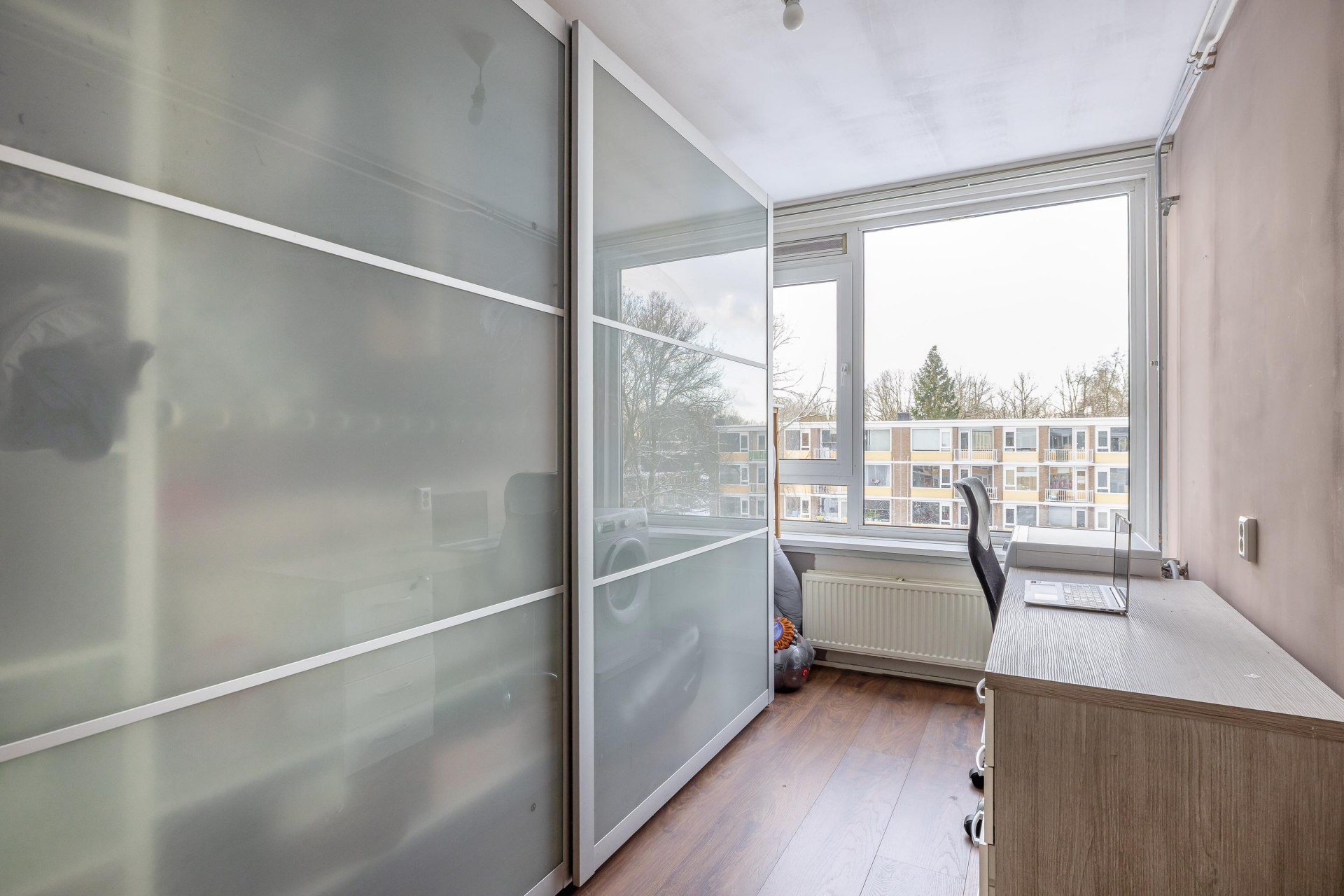 Slaapkamer 2: eveneens aan de voorzijde, met parketvloer, wasmachineaansluiting en een luxe kastenwand.