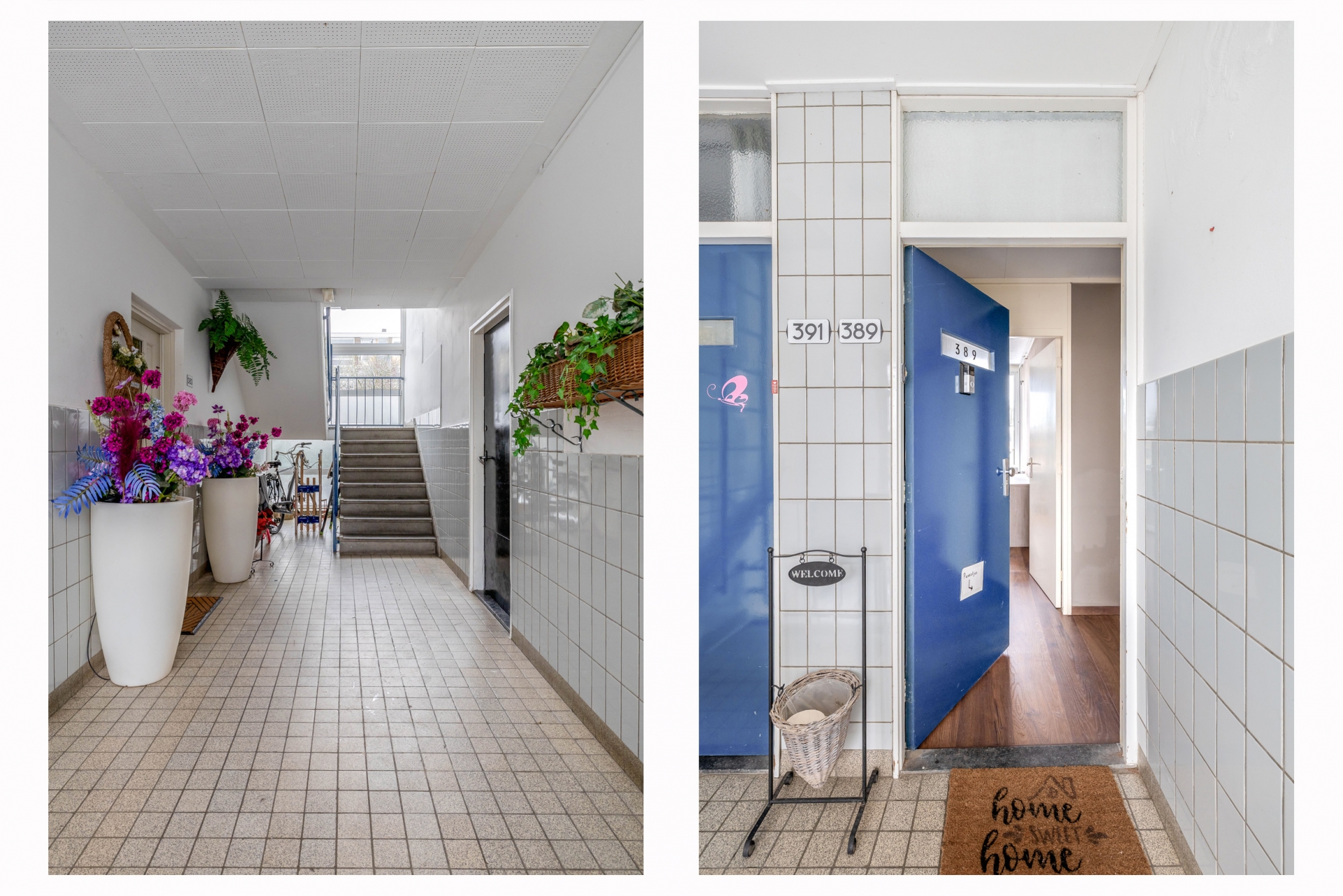 Gesloten entree met centrale hal, trapopgang en toegang tot de bergingen.