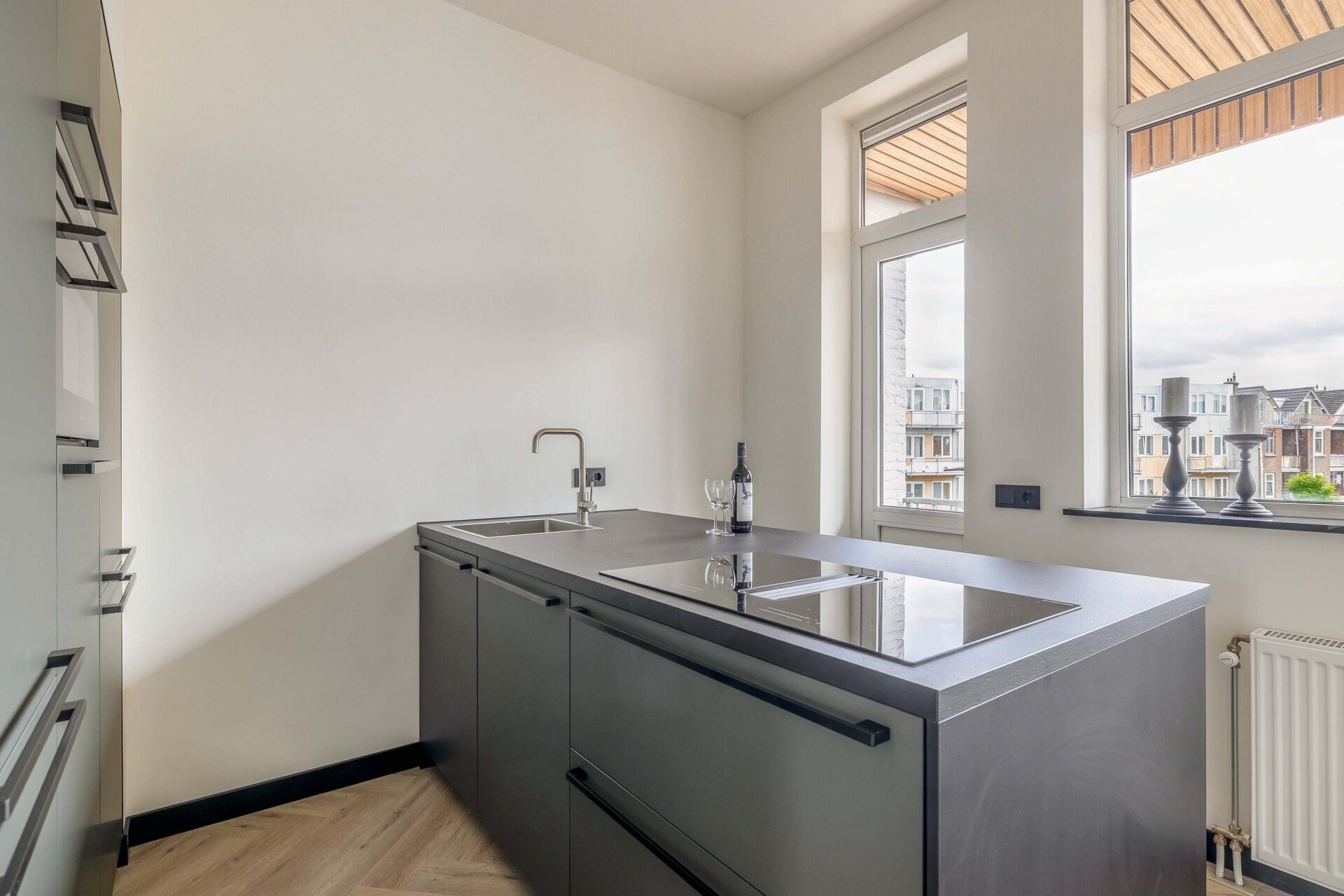 Aan de achterzijde is de luxe, open keuken, gesitueerd met kookeiland, ingebouwde apparatuur en voldoende werk- en opbergruimte. Perfect voor wie van koken én gezelligheid houdt. Hier kook je met uitzicht op de Euromast! De badkamer is volledig betegeld en uitgerust met een ruime inloopdouche, een modern wastafelmeubel én elektrische vloerverwarming. Dankzij de hoogwaardige afwerking, strakke belijning en handige details voelt deze ruimte als een dagelijks wellness-moment.