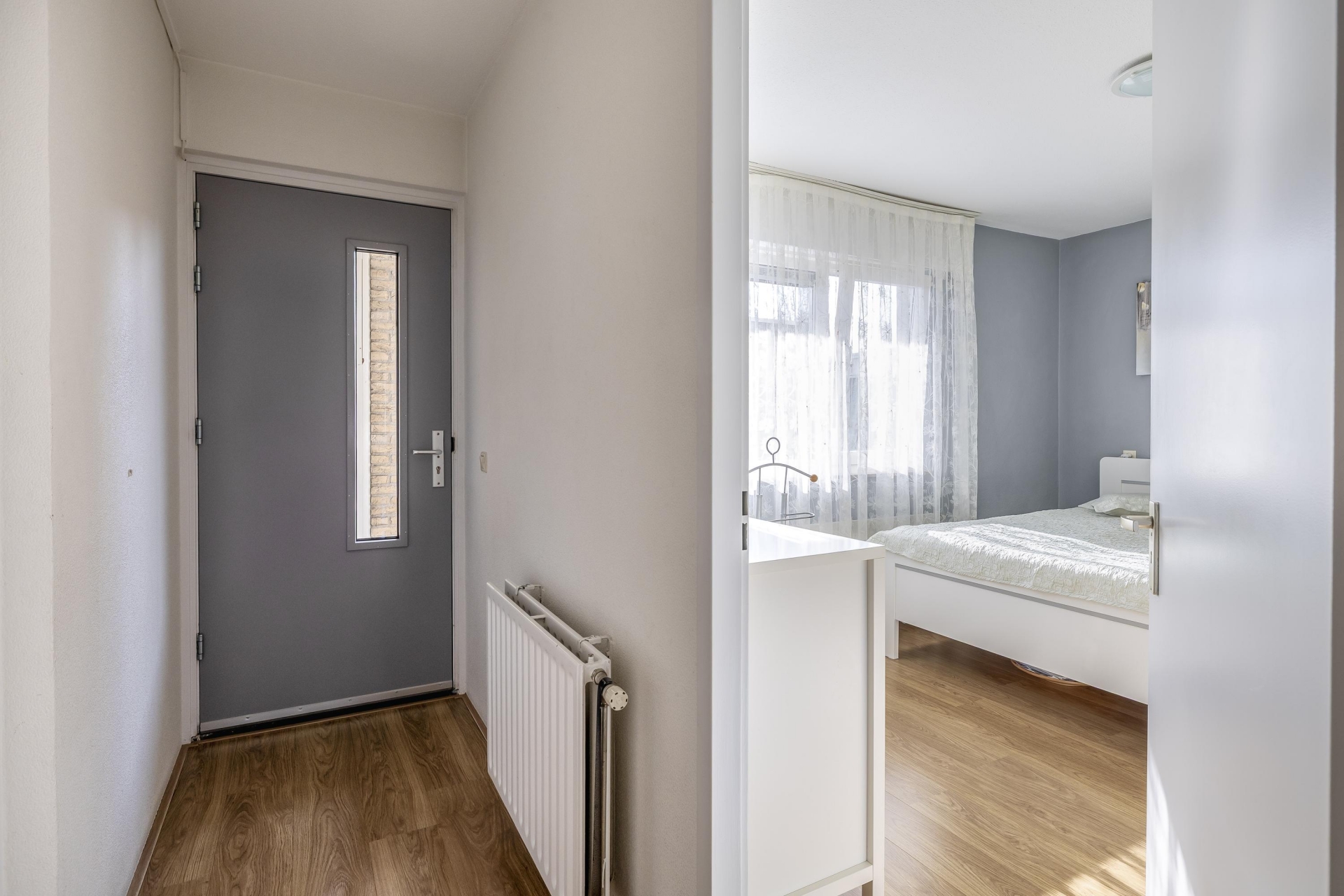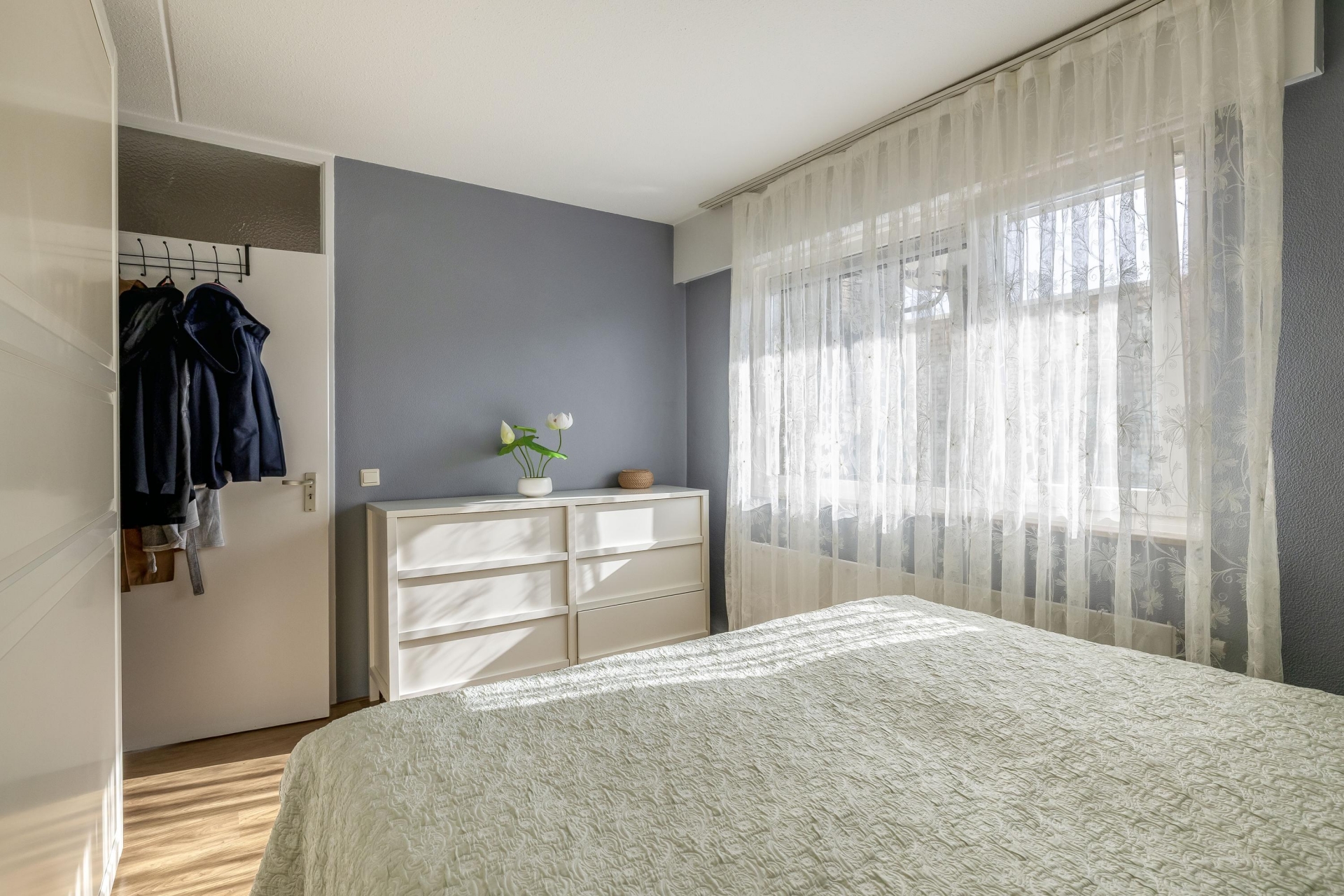 Deze kamer ligt aan de achterzijde van het appartement en grenst aan het balkon.
