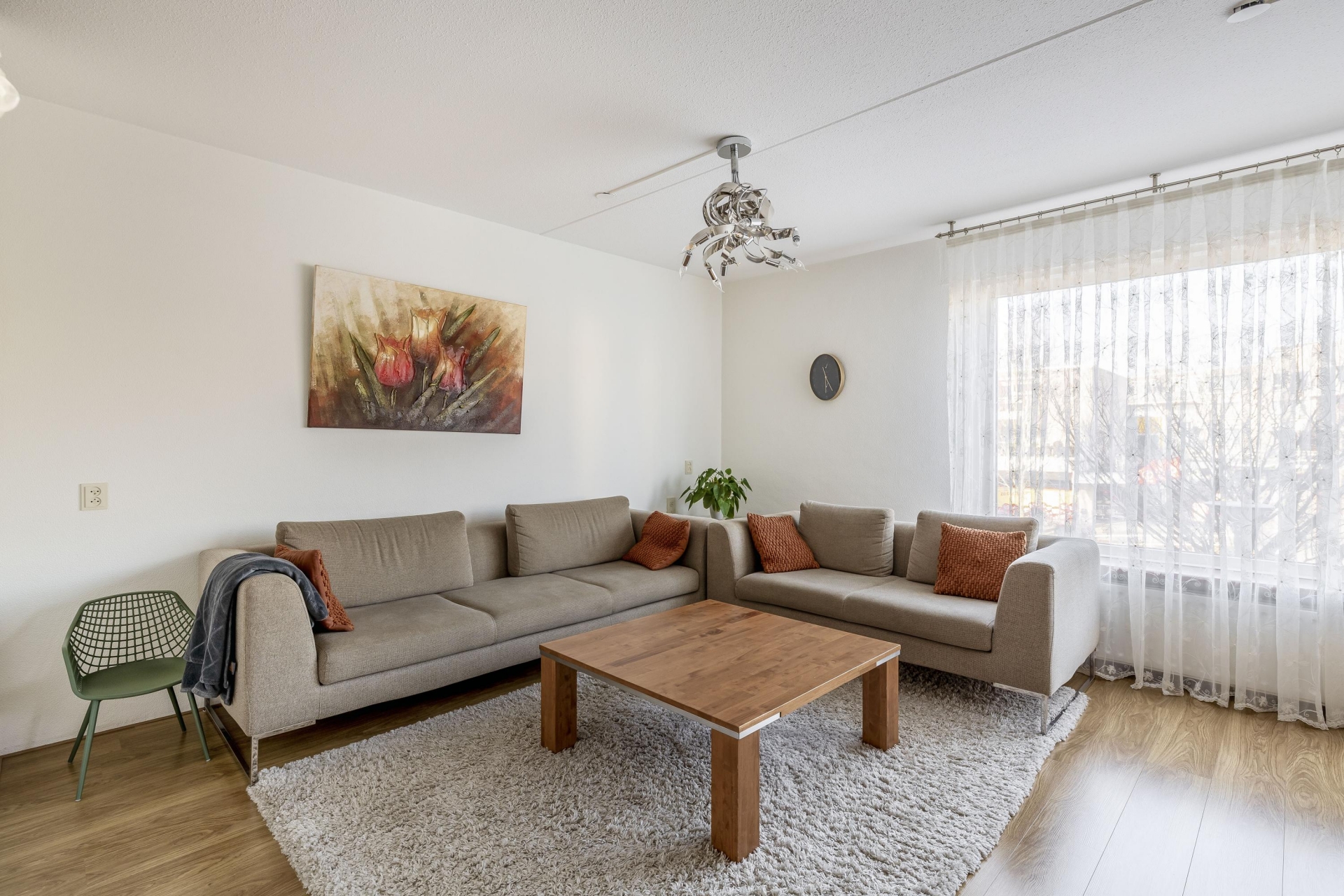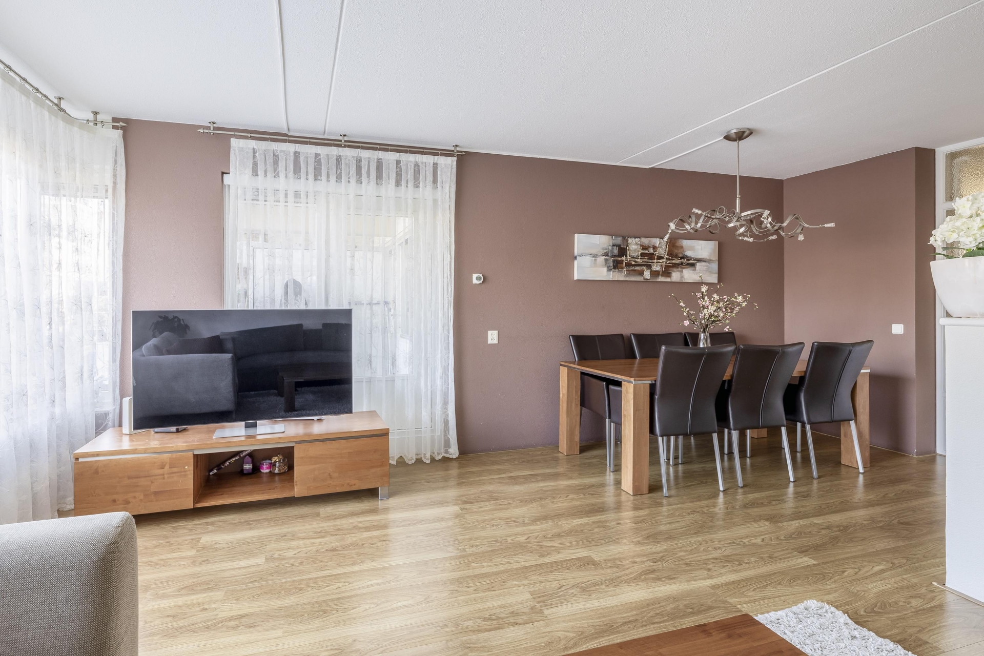 In de woonkamer is ruimte voor een gezellige zithoek en een aparte eethoek.