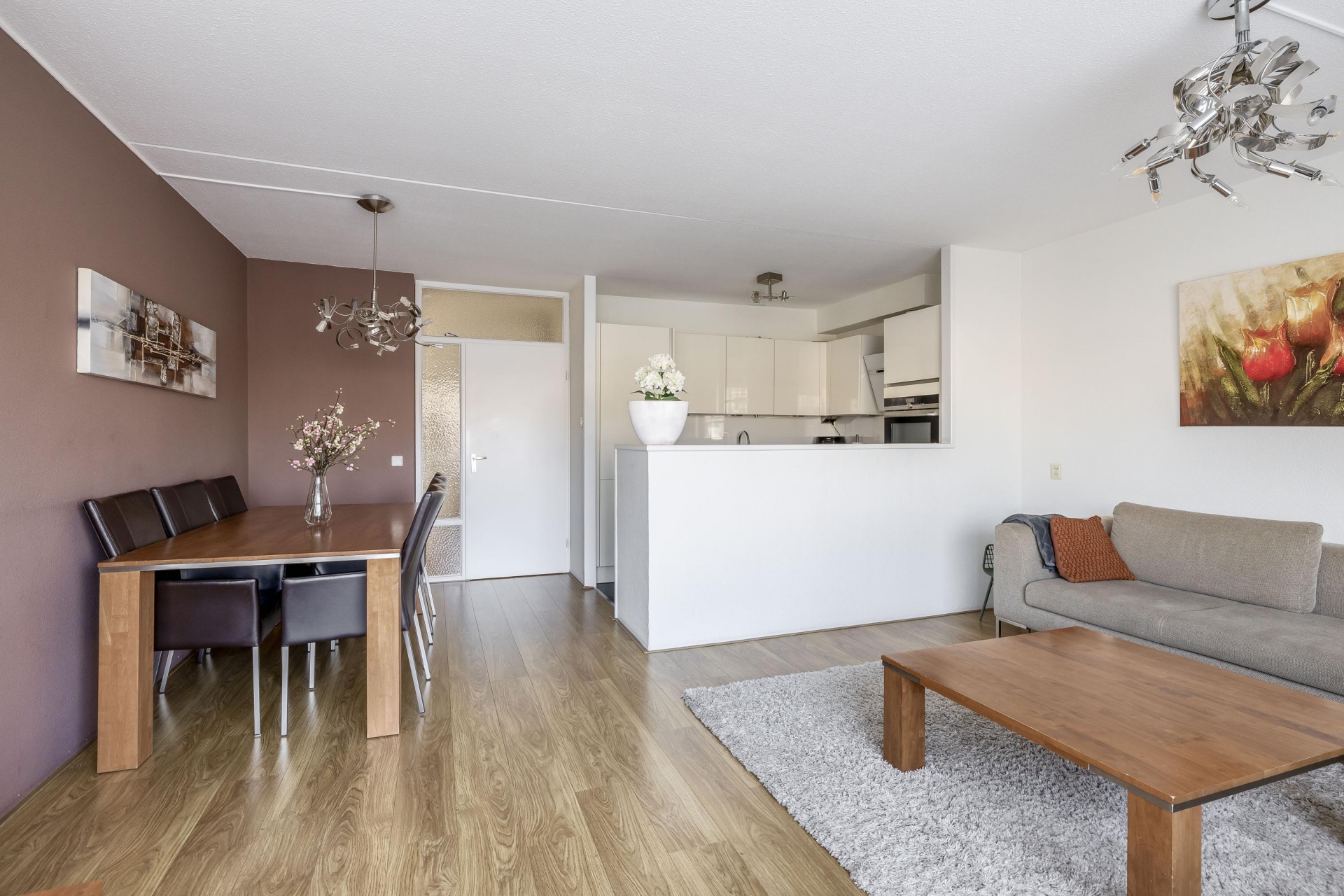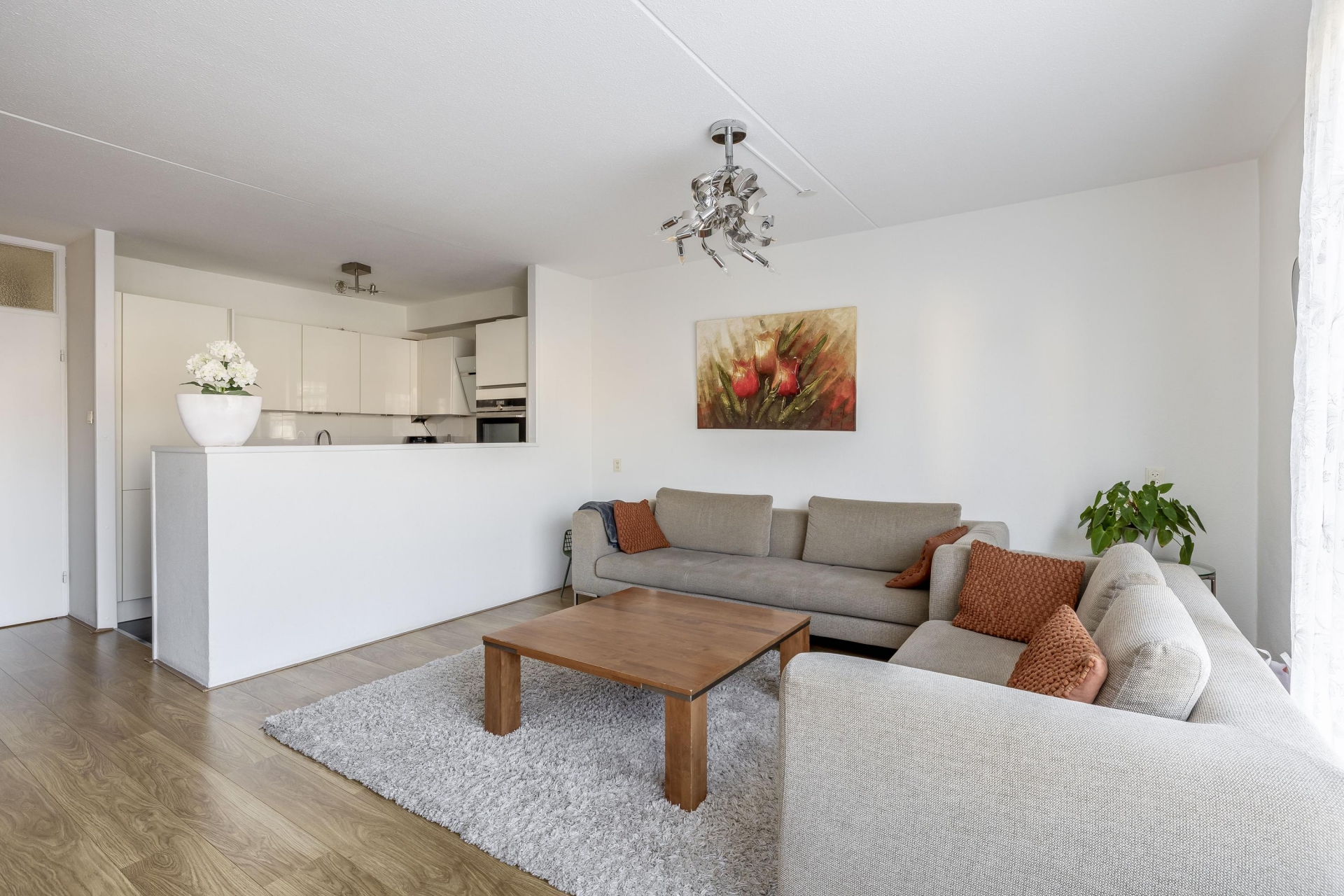 Deze living is opgedeeld in een open keuken en een woonkamer met deur naar het balkon.