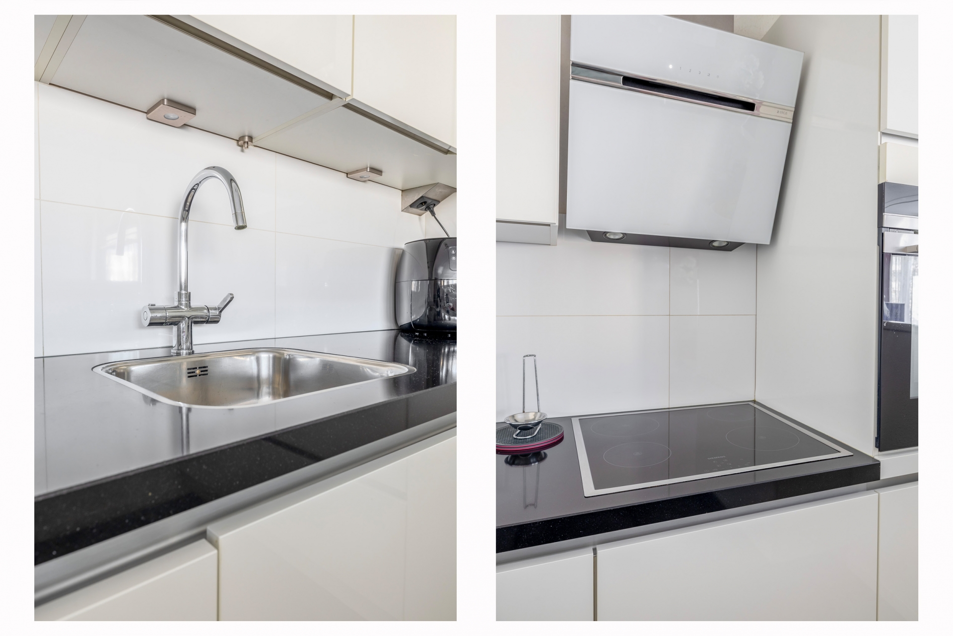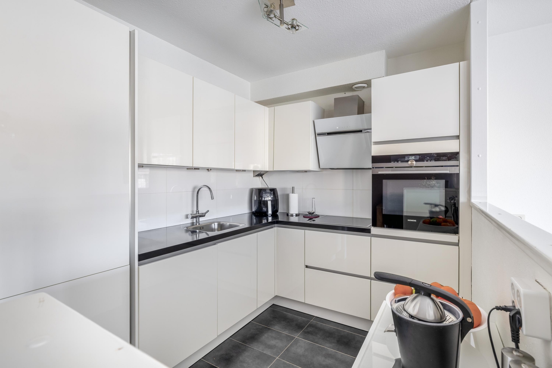 De open keuken in L-opstelling is voorzien van een wasbak met Quooker kraan, combioven, vaatwasser, kookplaat met geïntegreerd afzuigsysteem en koel-vriescombinatie.