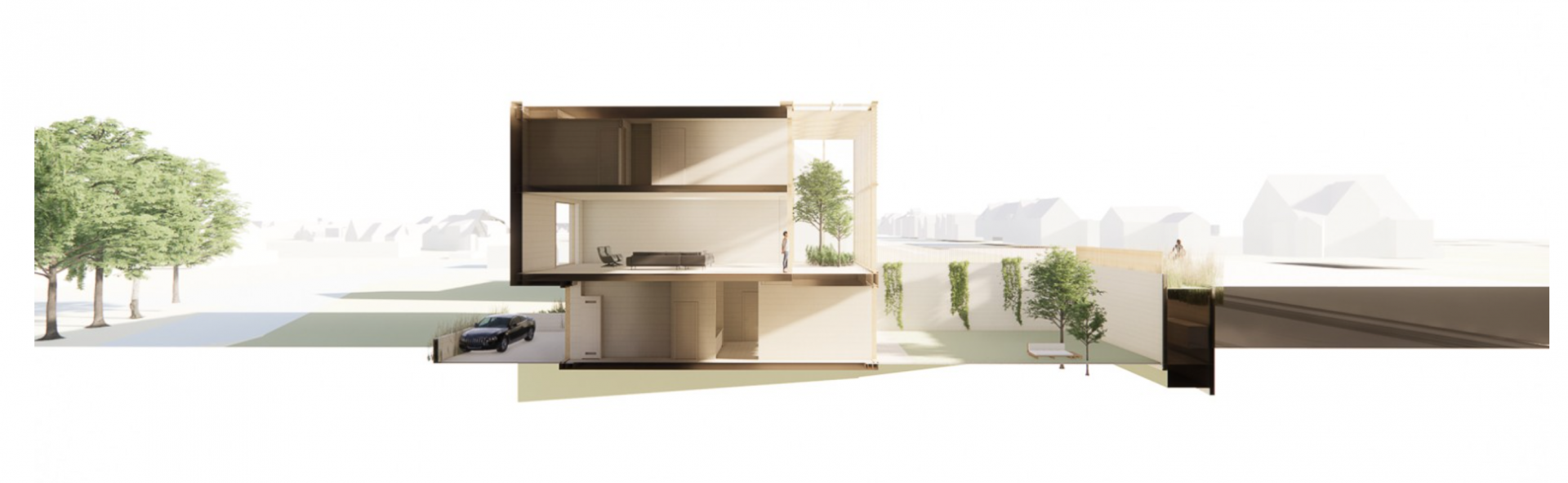 - een wintertuin aan de voorzijde van de woning, die fungeert als overgang tussen straat en leefruimte;
